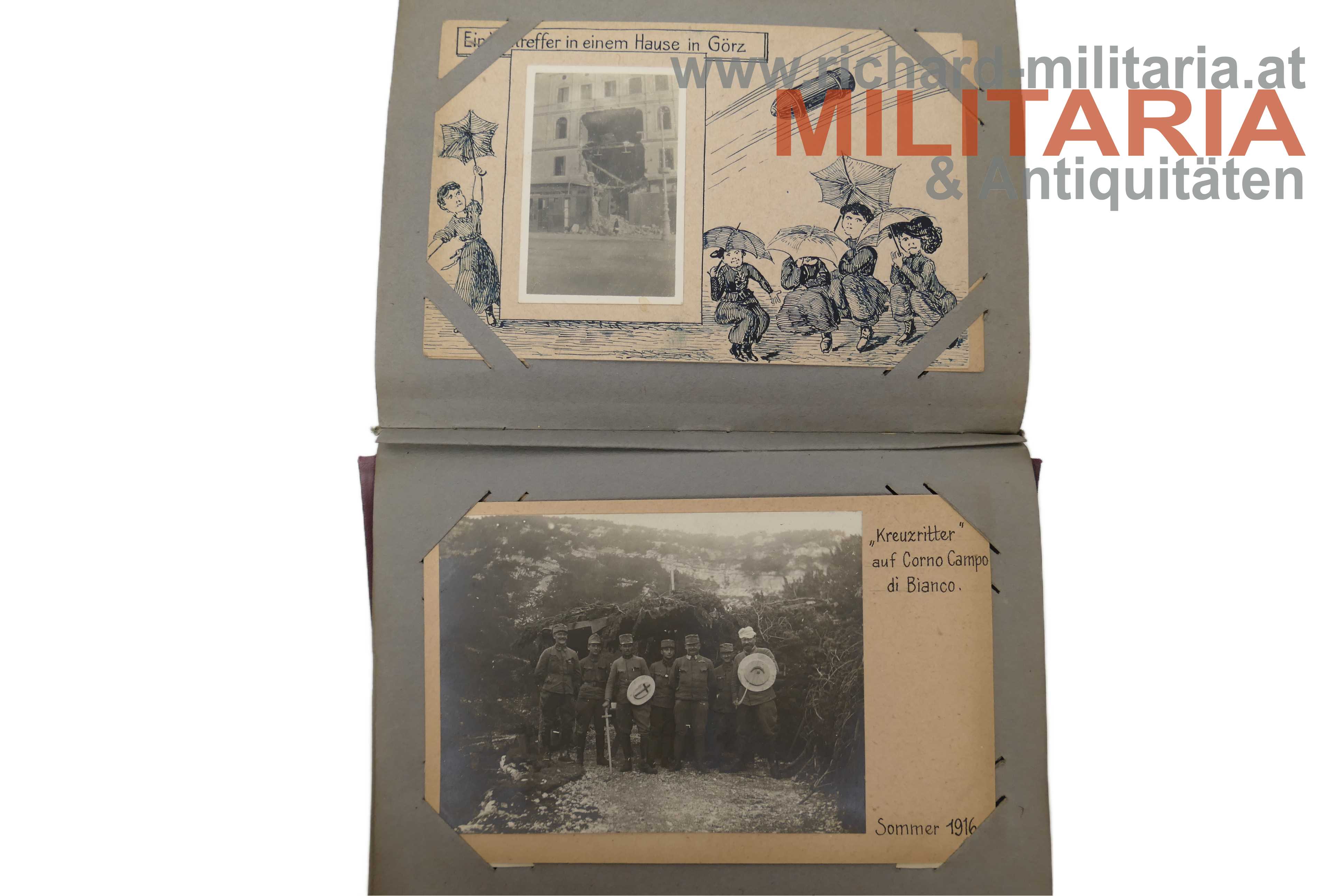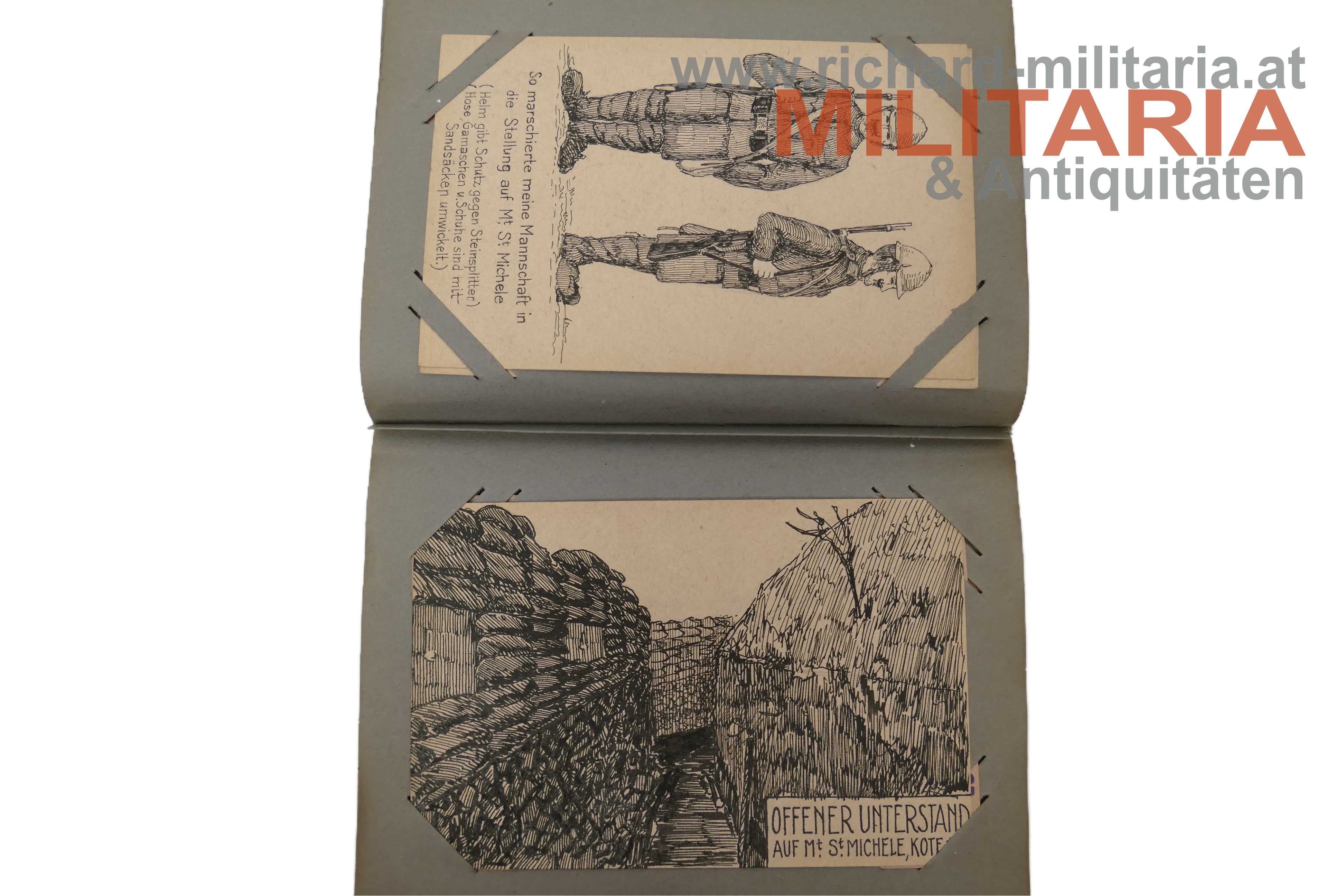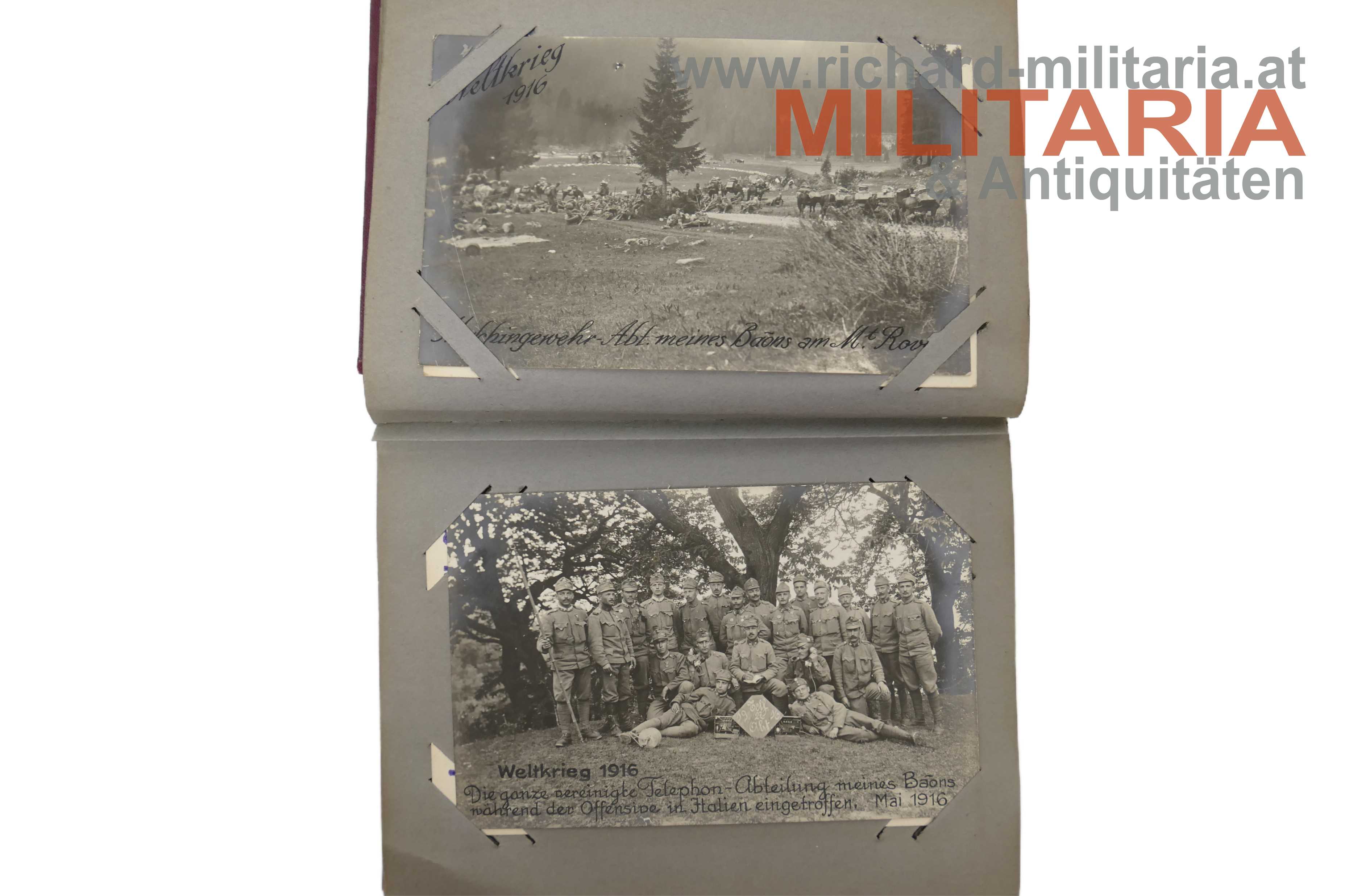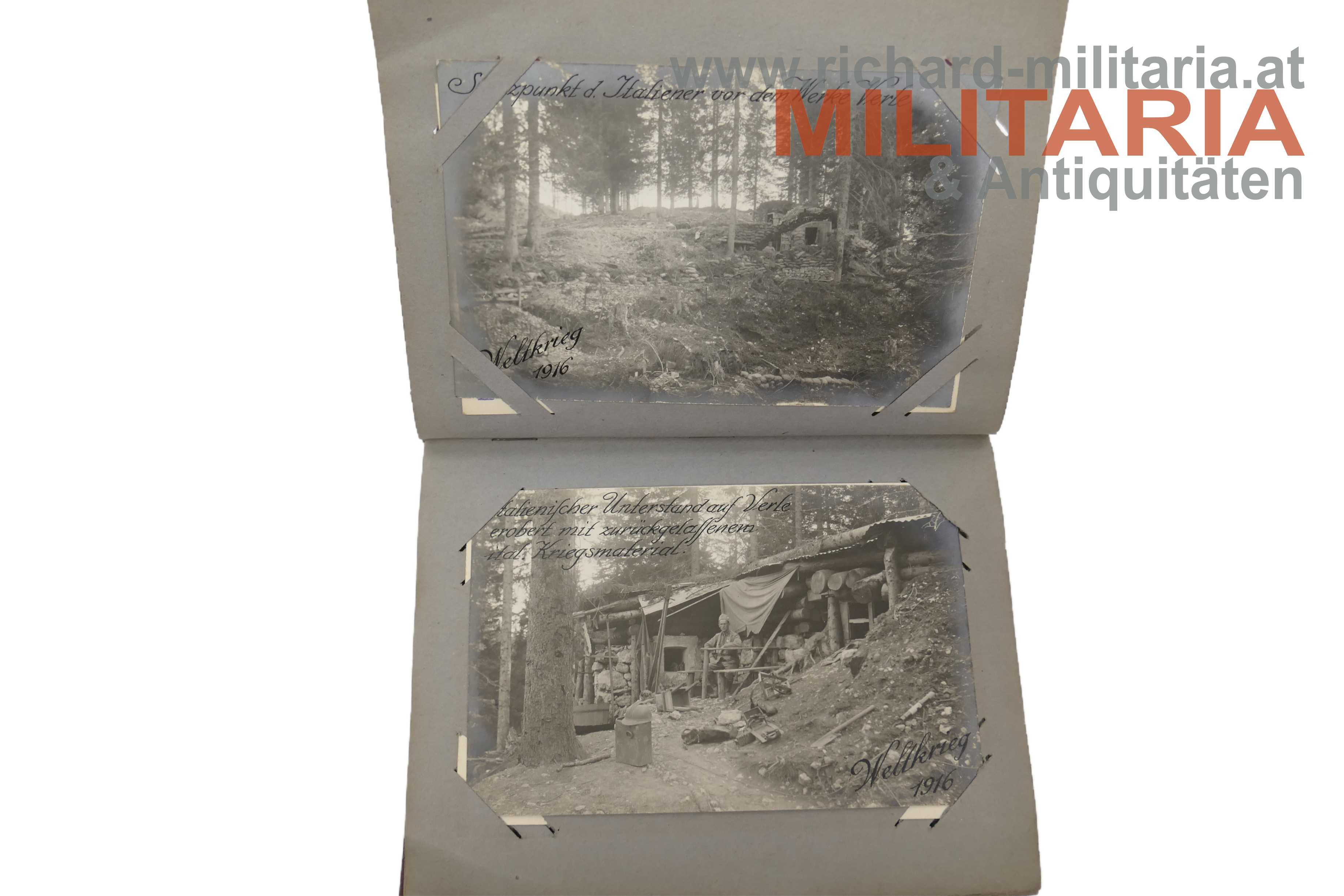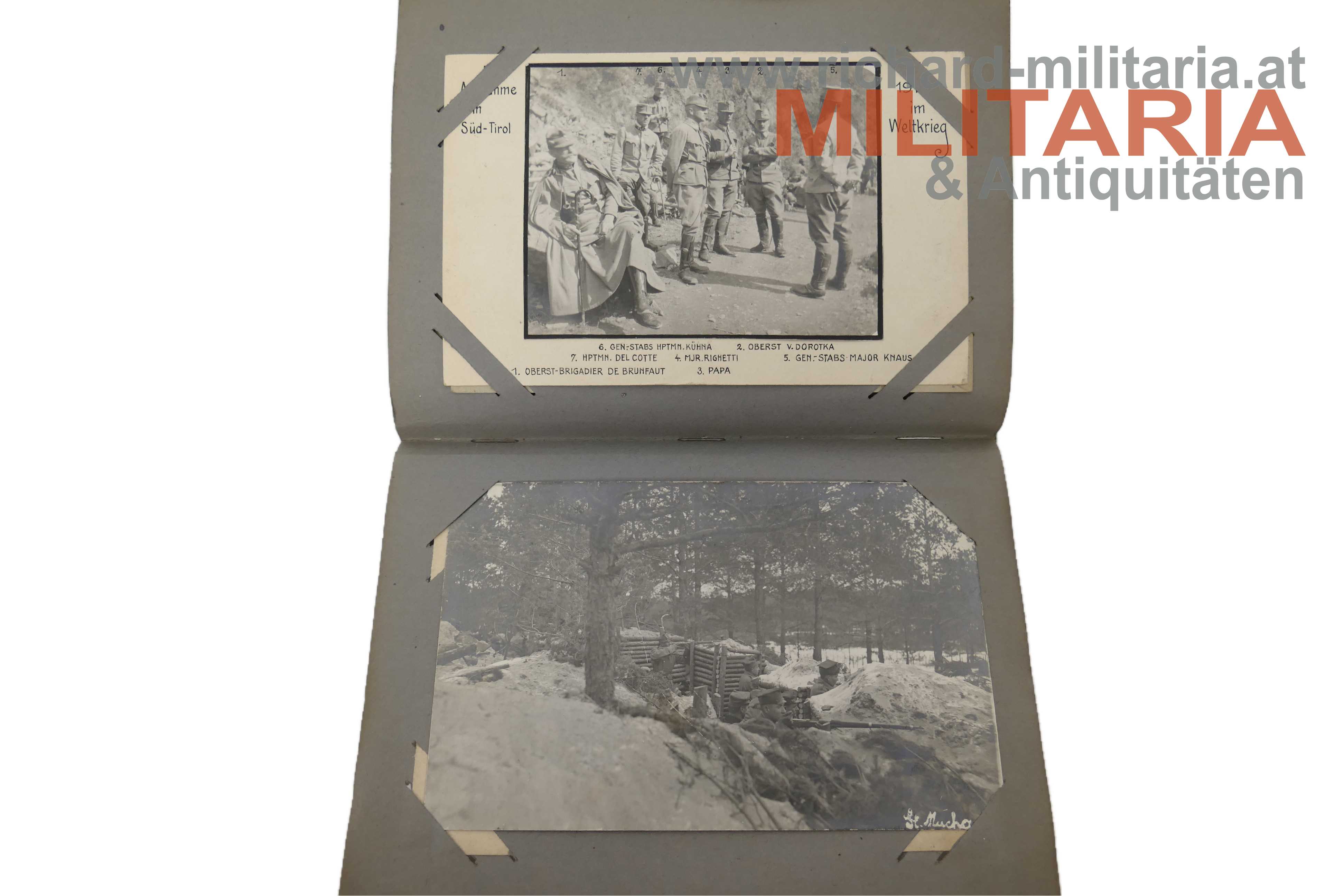 k.u.k. persönliches Fotoalbum des Oberstleutnant Johann Petermann Kommandant des 2. Feldbaons des steirischen Infanterie Regiment Nr. 27 an der Italienfront im Jahre 1916; mit 99 Aufnahmen bzw. handgezeichneten Feldpostkarten mit aufgeklebten Fotos; vollständig und fein säuberlich beschriftet; Postkarten revers an Fräulein Liserl Petermann adressiert und meist mit "Infanterie Regiment 27" gestempelt; viele handbemalte oder handgezeichnete Feldpostkarten mit aufgeklebten Bildern;