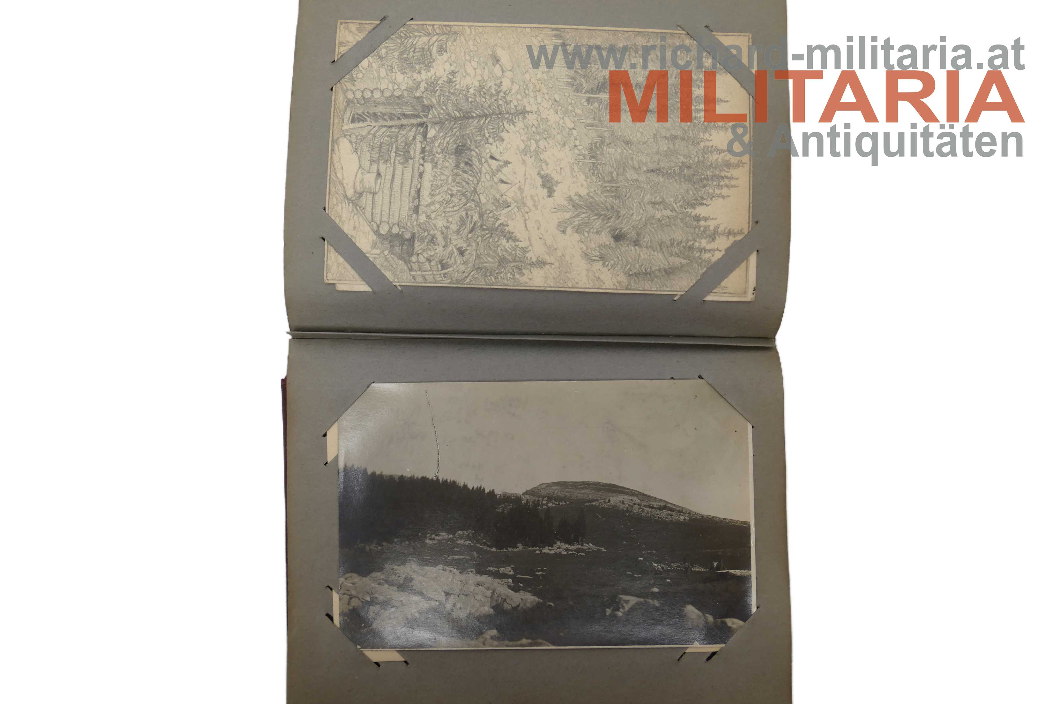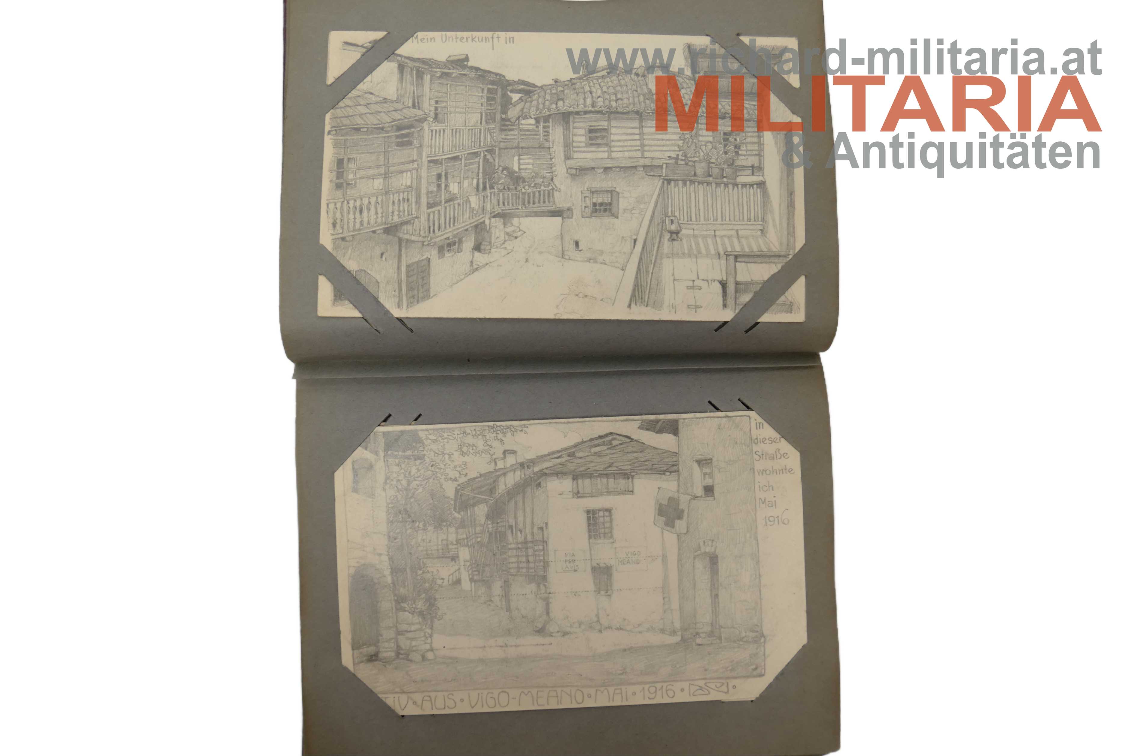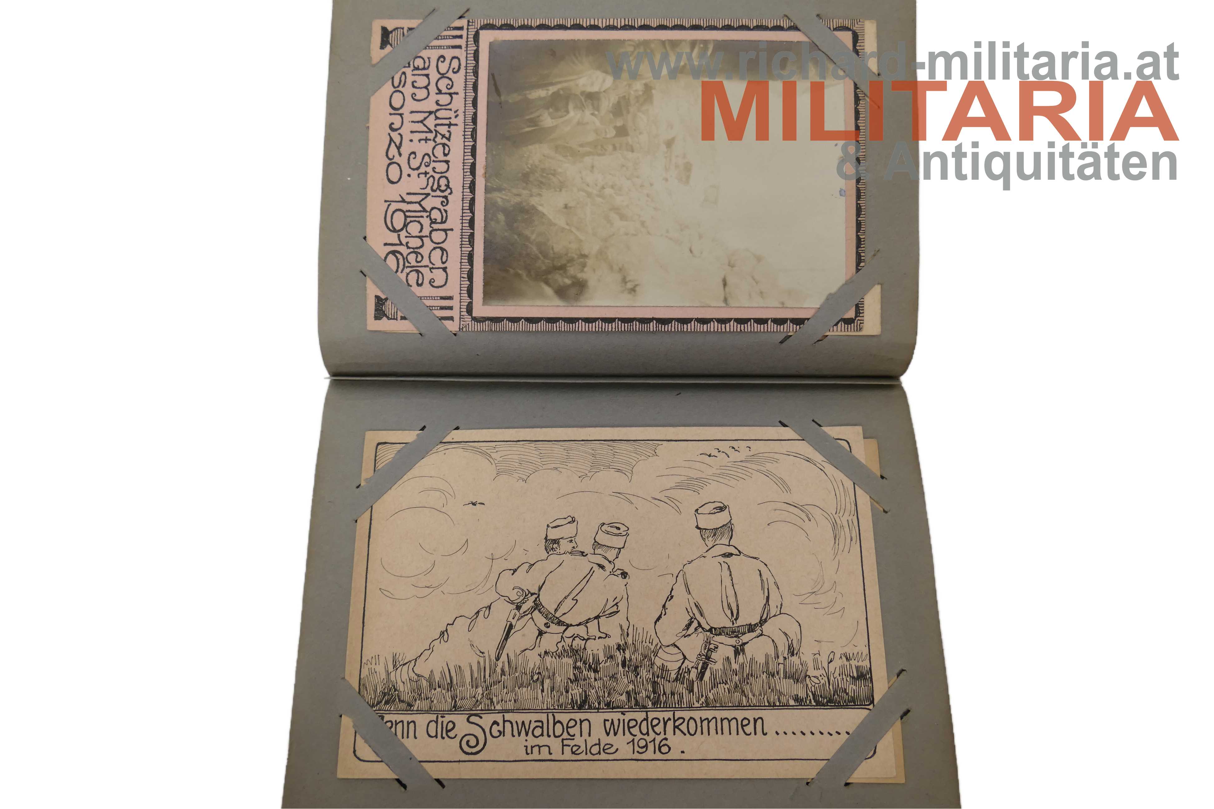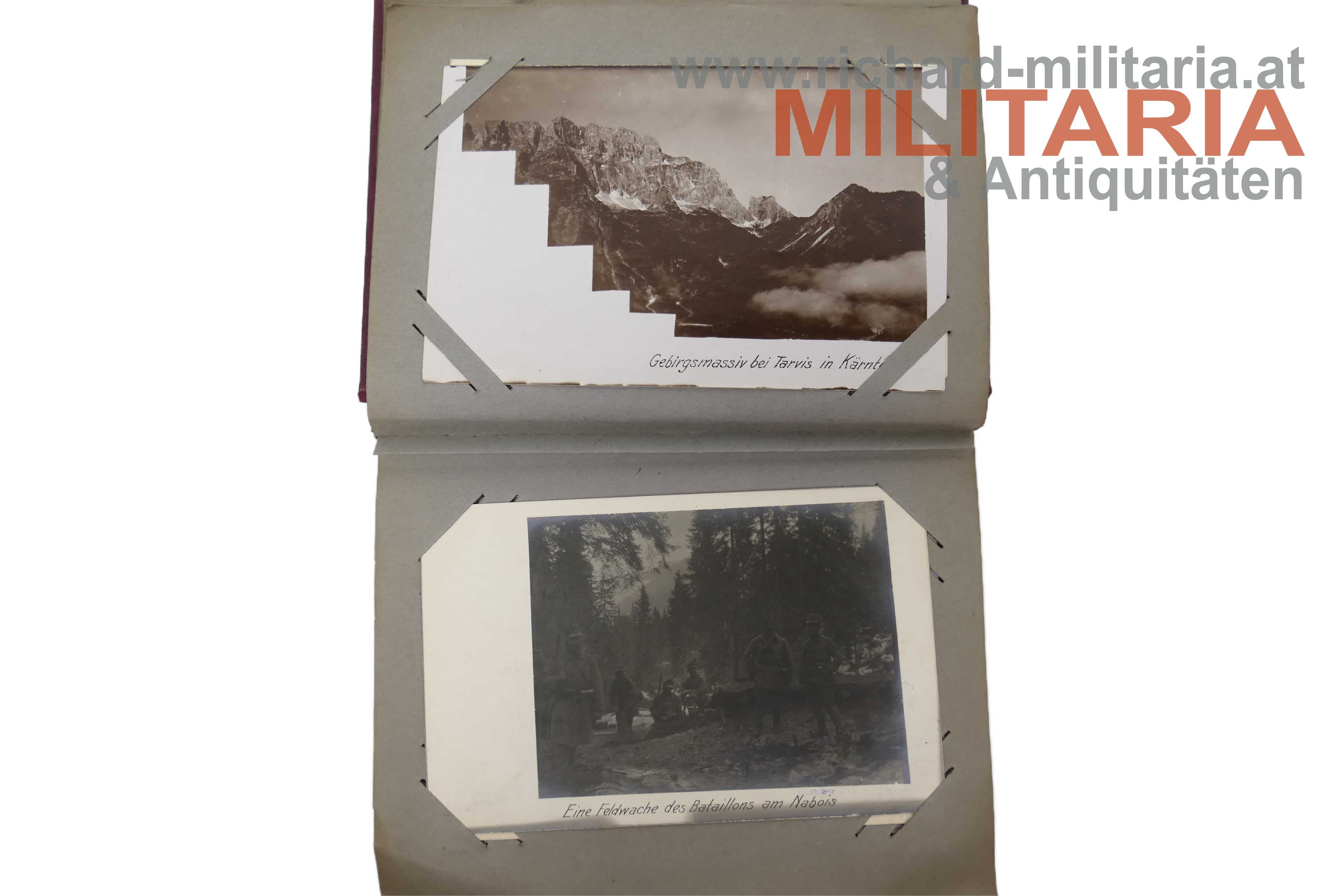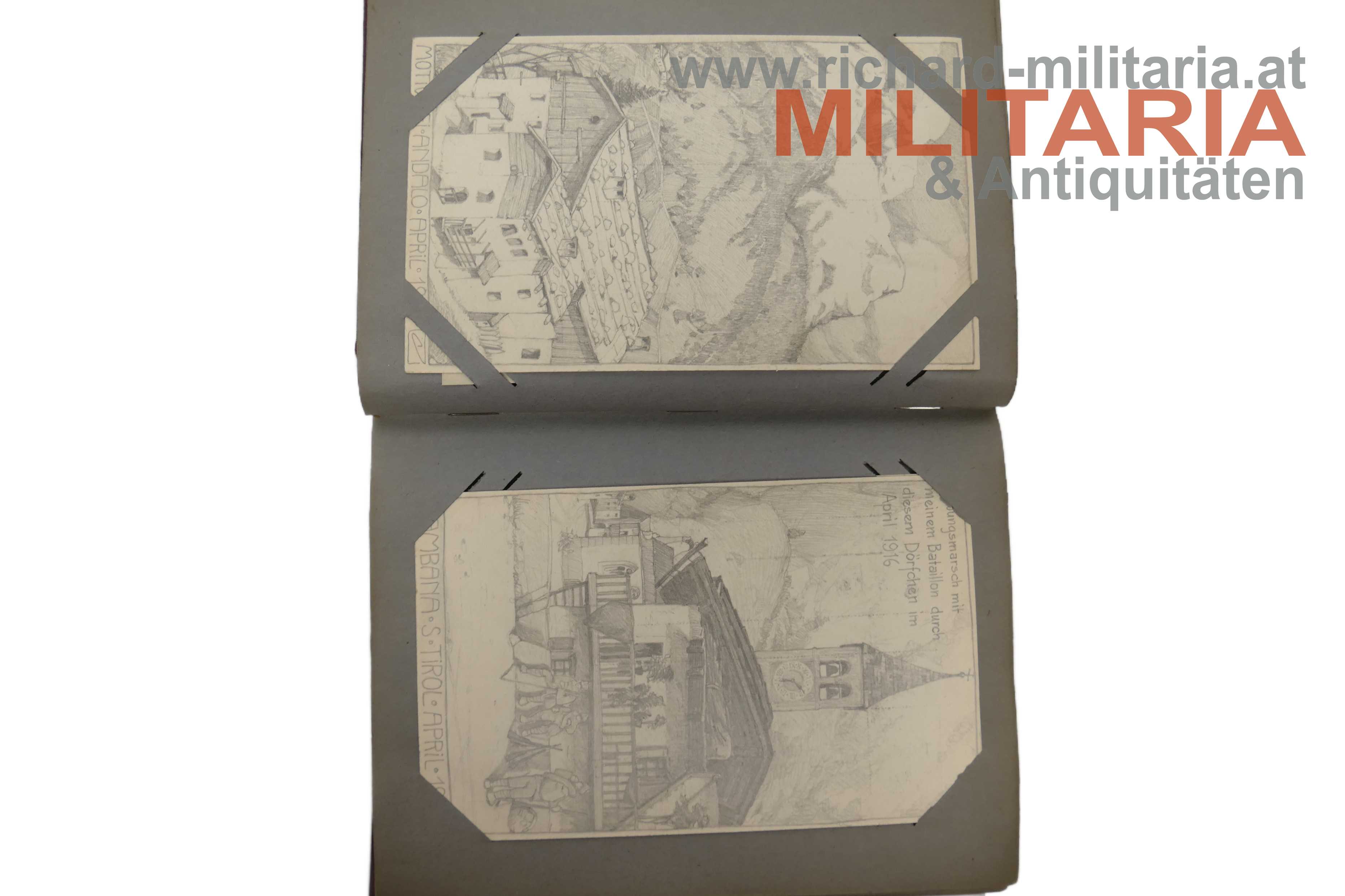 k.u.k. persönliches Fotoalbum des Oberstleutnant Johann Petermann Kommandant des 2. Feldbaons des steirischen Infanterie Regiment Nr. 27 an der Italienfront im Jahre 1916; mit 99 Aufnahmen bzw. handgezeichneten Feldpostkarten mit aufgeklebten Fotos; vollständig und fein säuberlich beschriftet; Postkarten revers an Fräulein Liserl Petermann adressiert und meist mit "Infanterie Regiment 27" gestempelt; viele handbemalte oder handgezeichnete Feldpostkarten mit aufgeklebten Bildern;