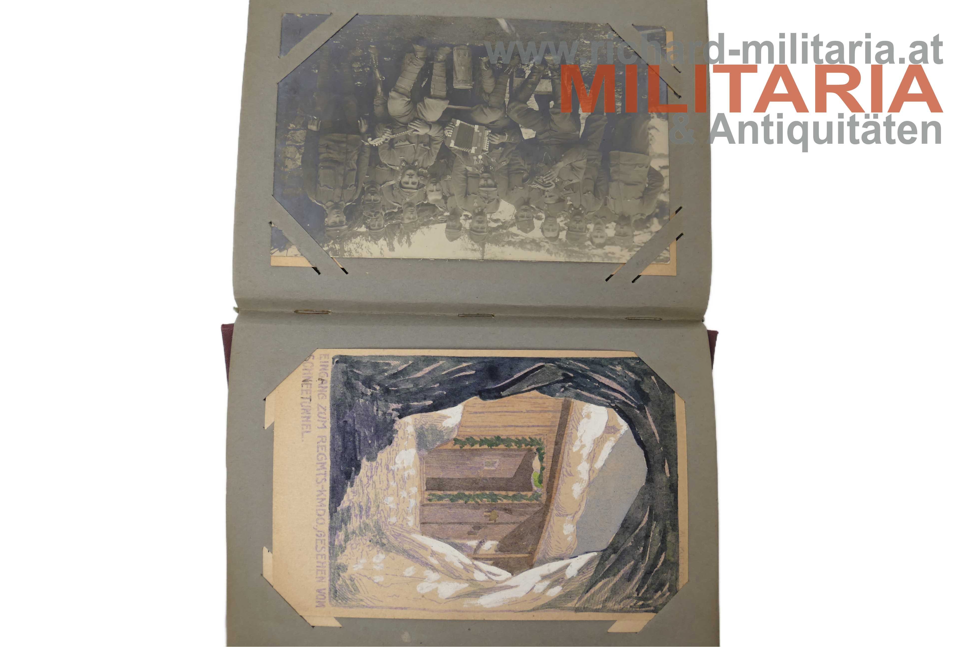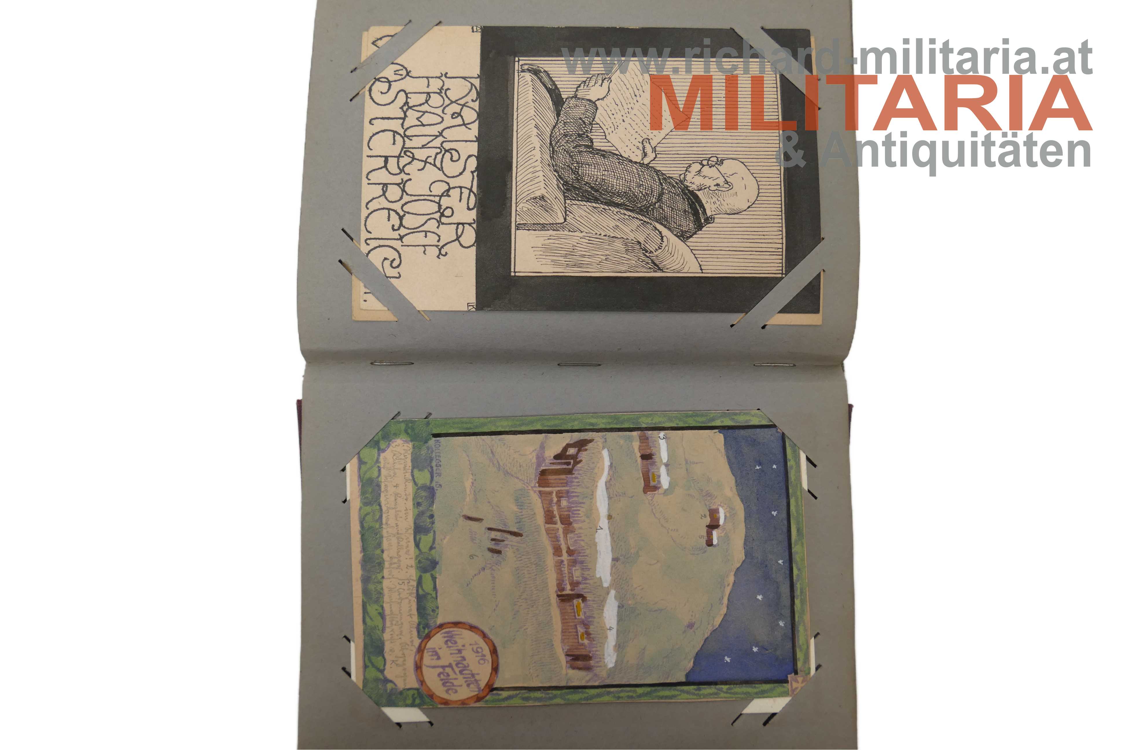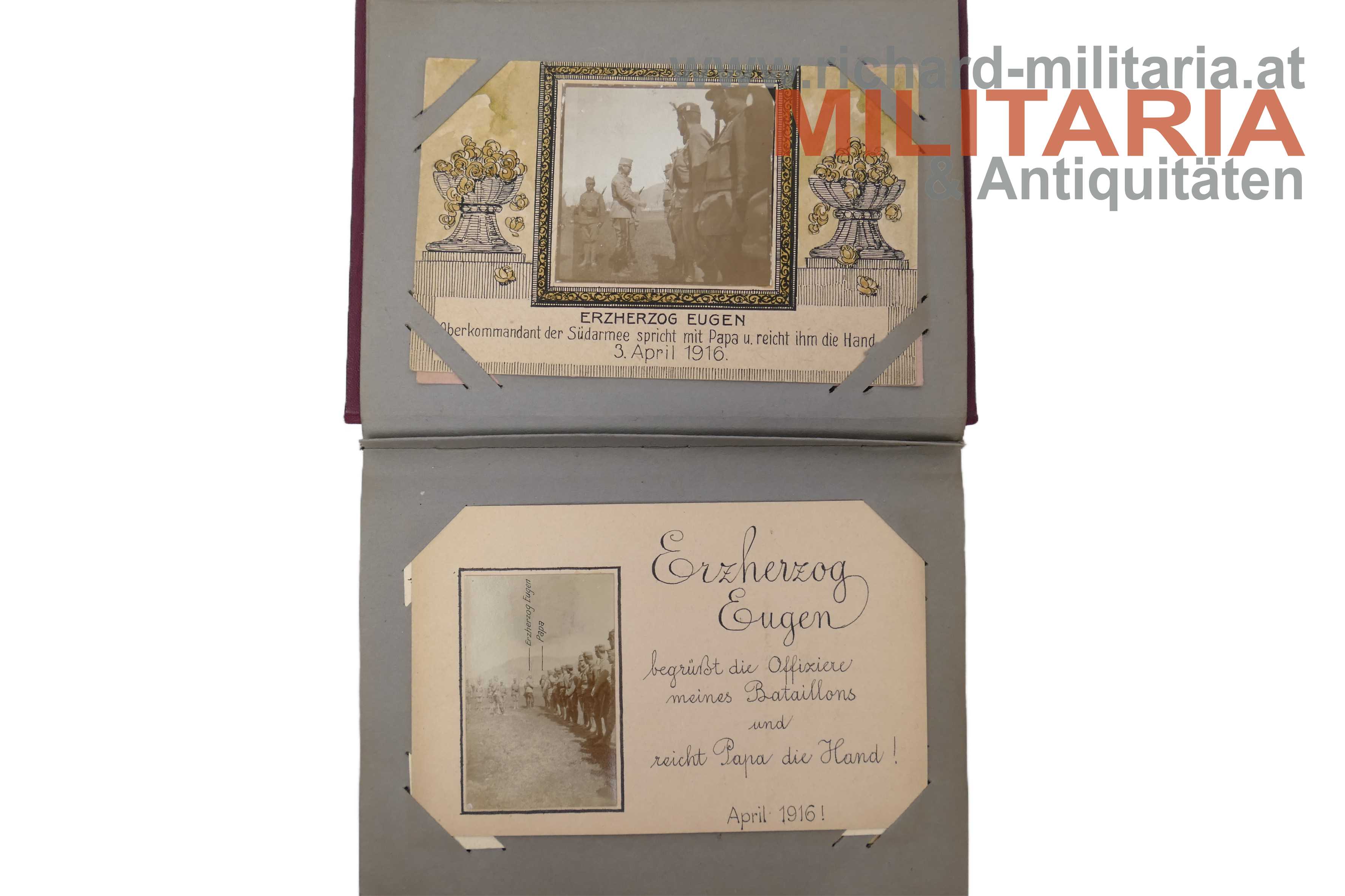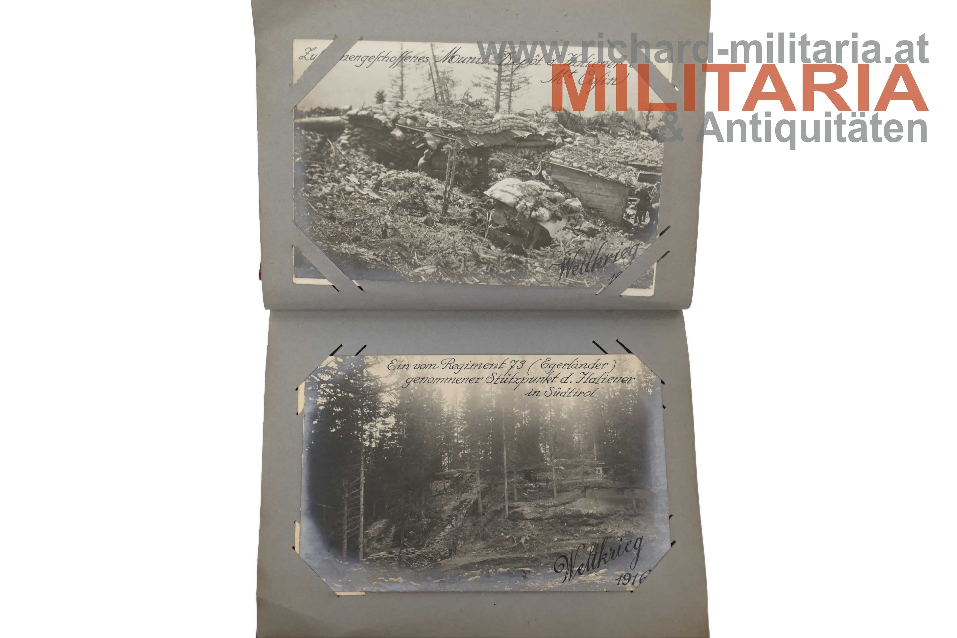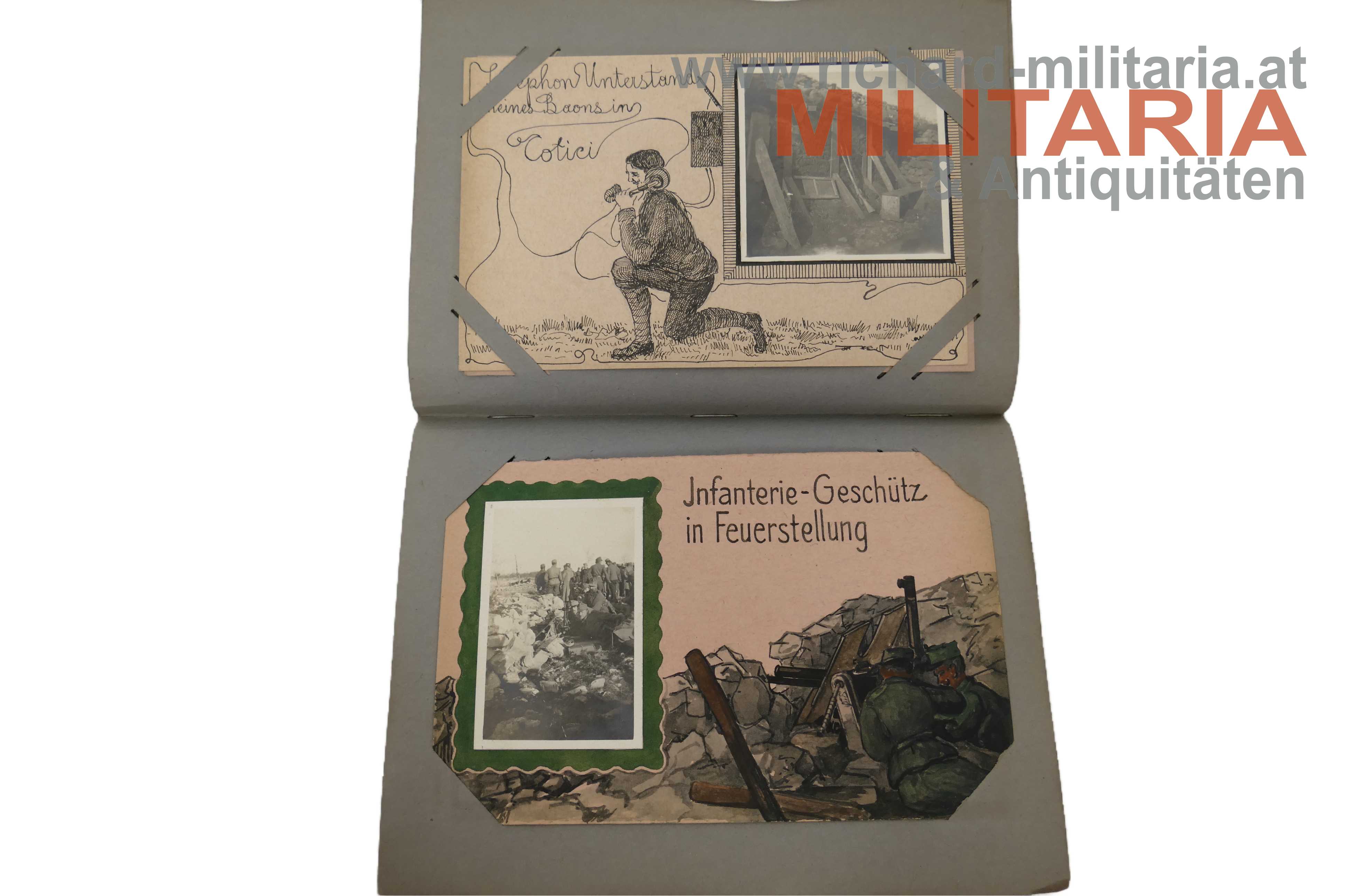 k.u.k. persönliches Fotoalbum des Oberstleutnant Johann Petermann Kommandant des 2. Feldbaons des steirischen Infanterie Regiment Nr. 27 an der Italienfront im Jahre 1916; mit 99 Aufnahmen bzw. handgezeichneten Feldpostkarten mit aufgeklebten Fotos; vollständig und fein säuberlich beschriftet; Postkarten revers an Fräulein Liserl Petermann adressiert und meist mit "Infanterie Regiment 27" gestempelt; viele handbemalte oder handgezeichnete Feldpostkarten mit aufgeklebten Bildern;