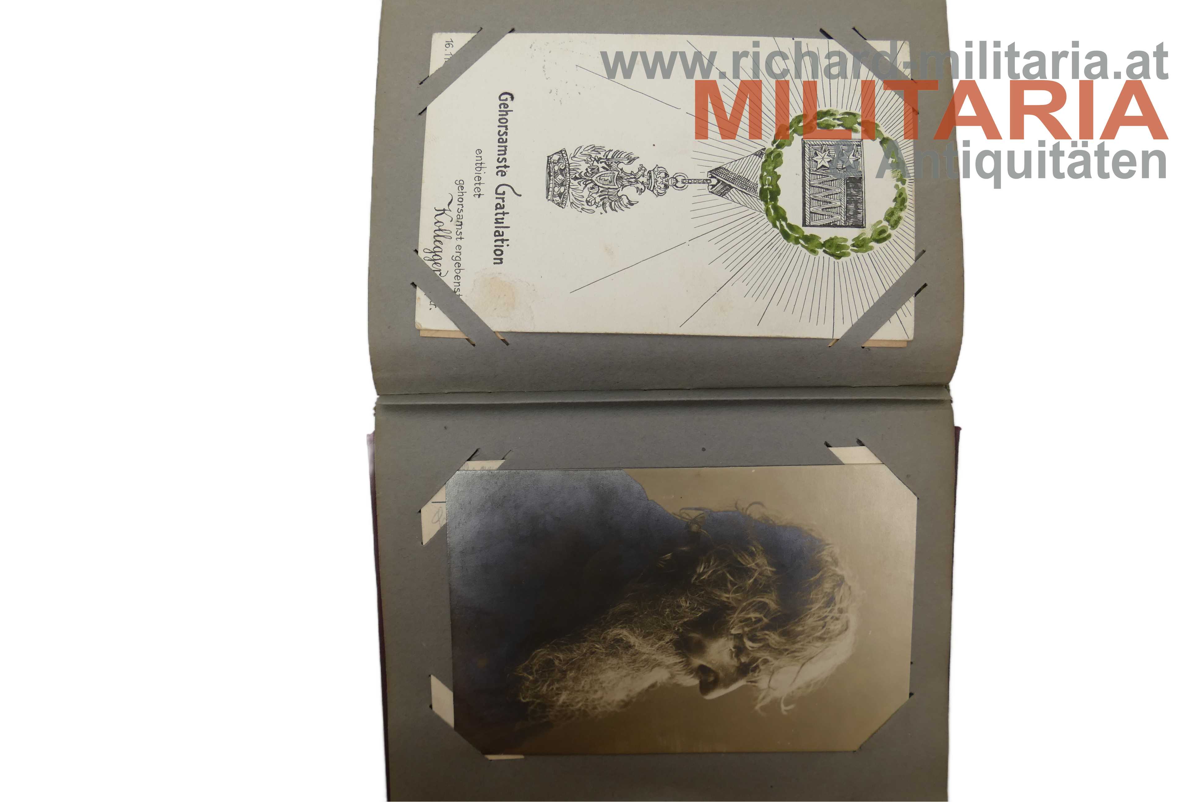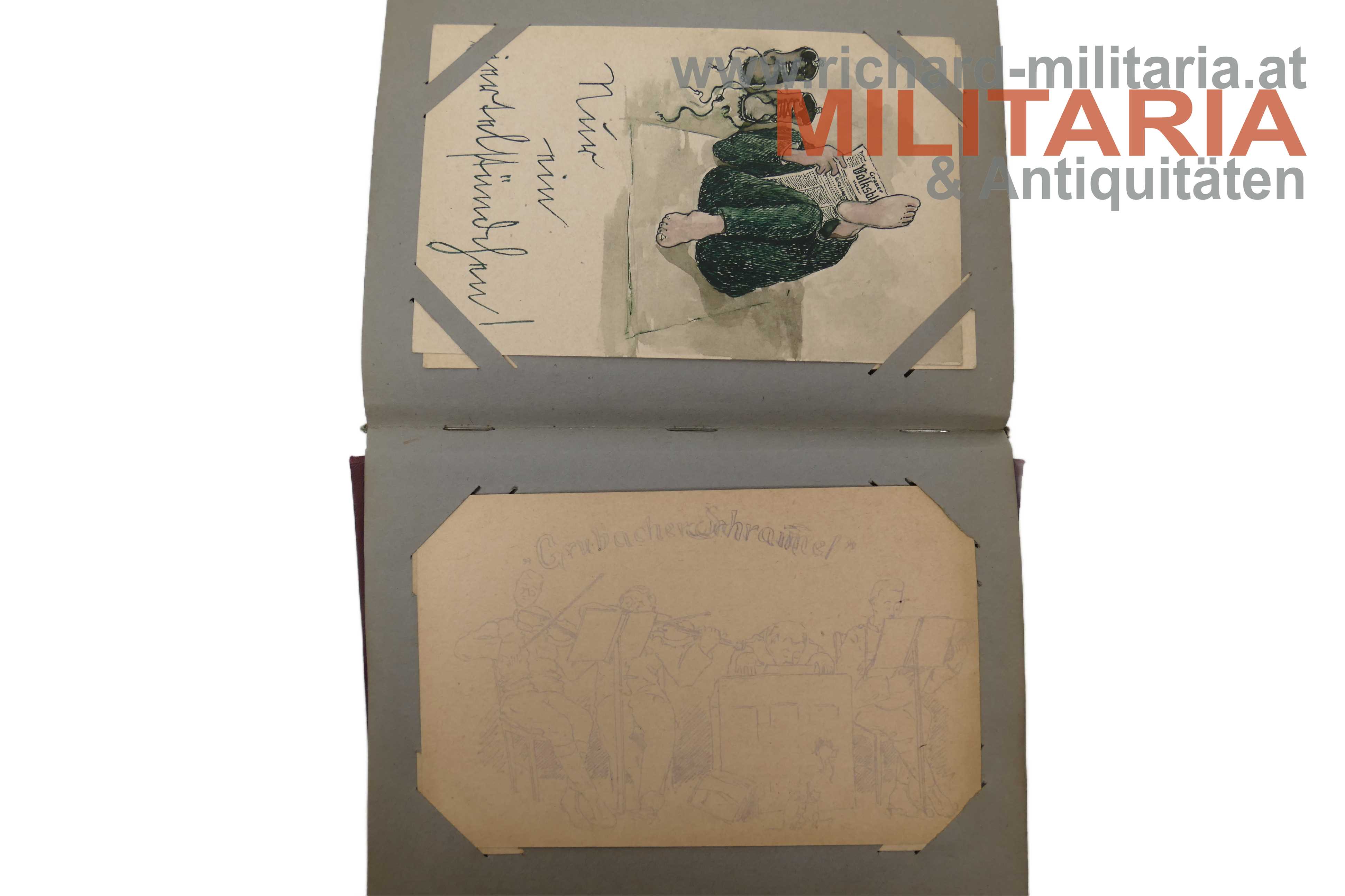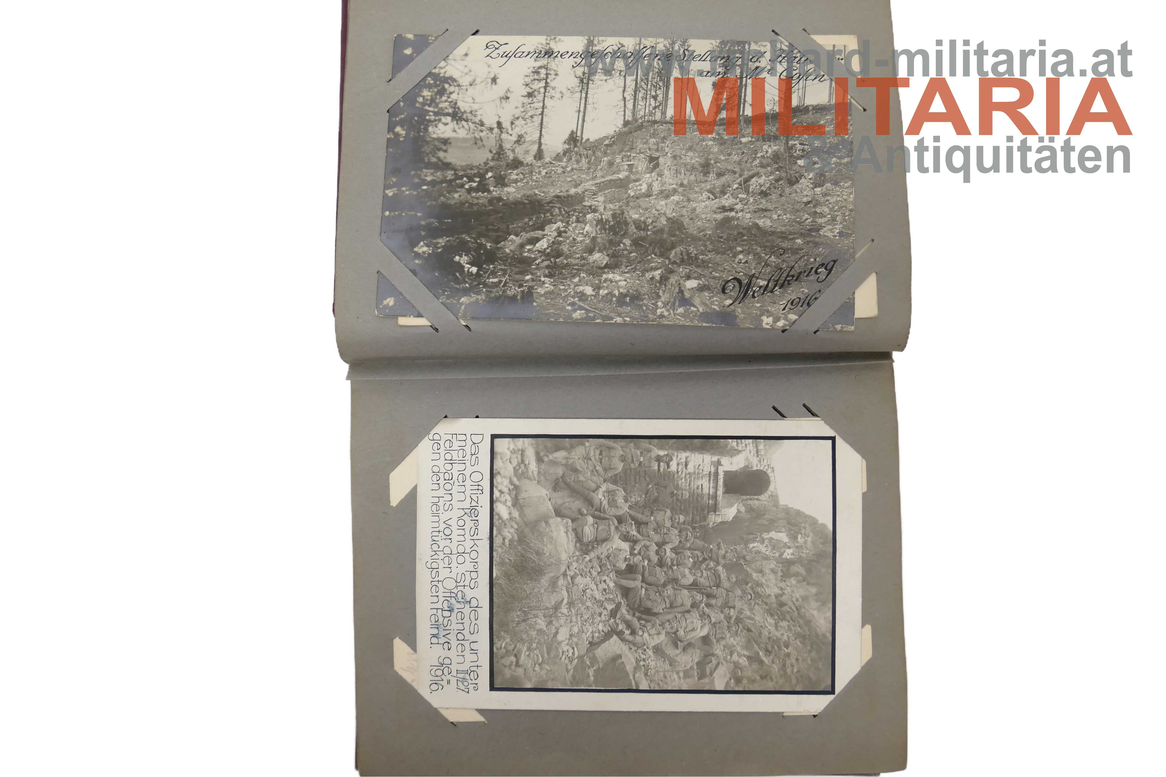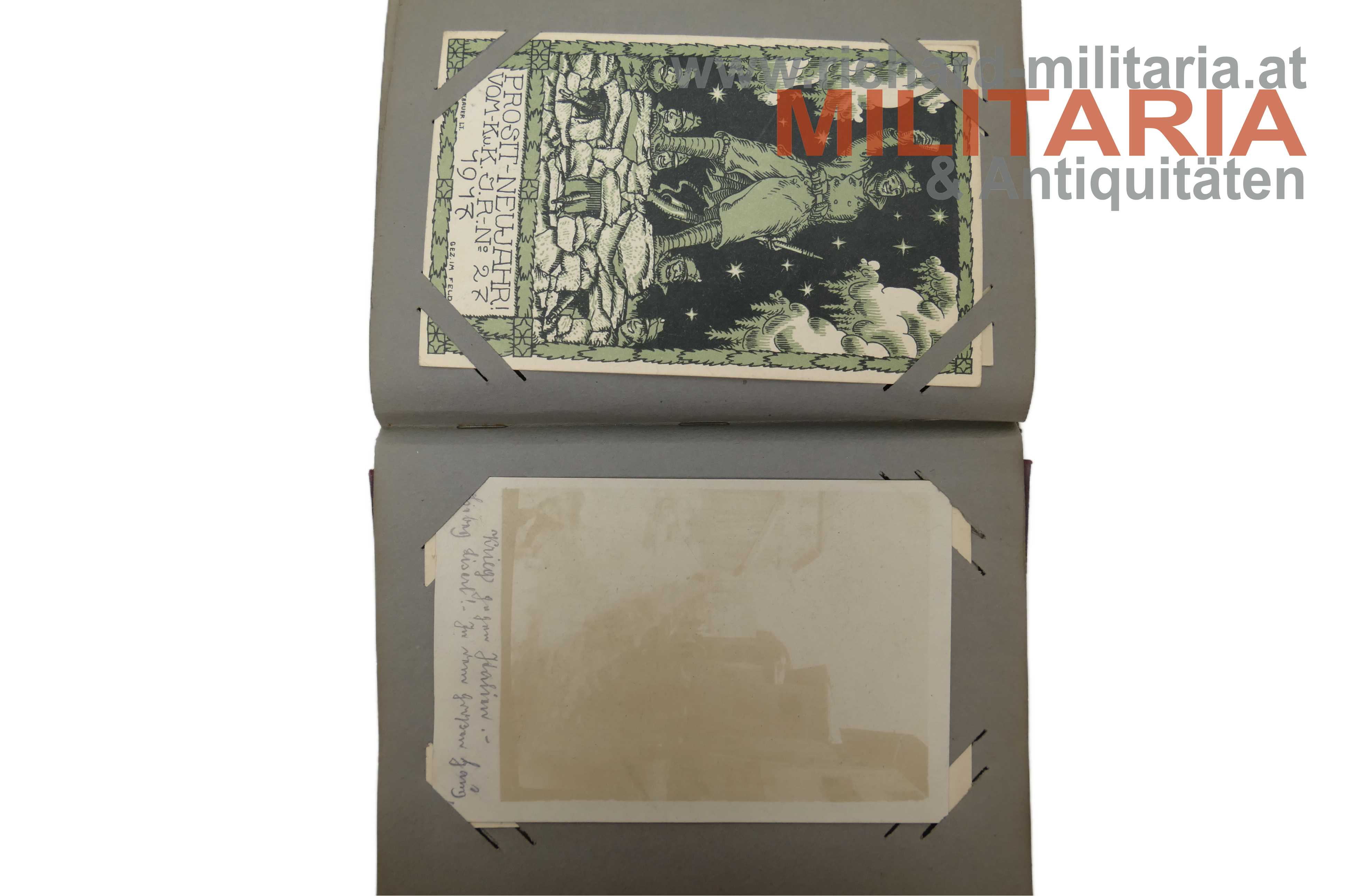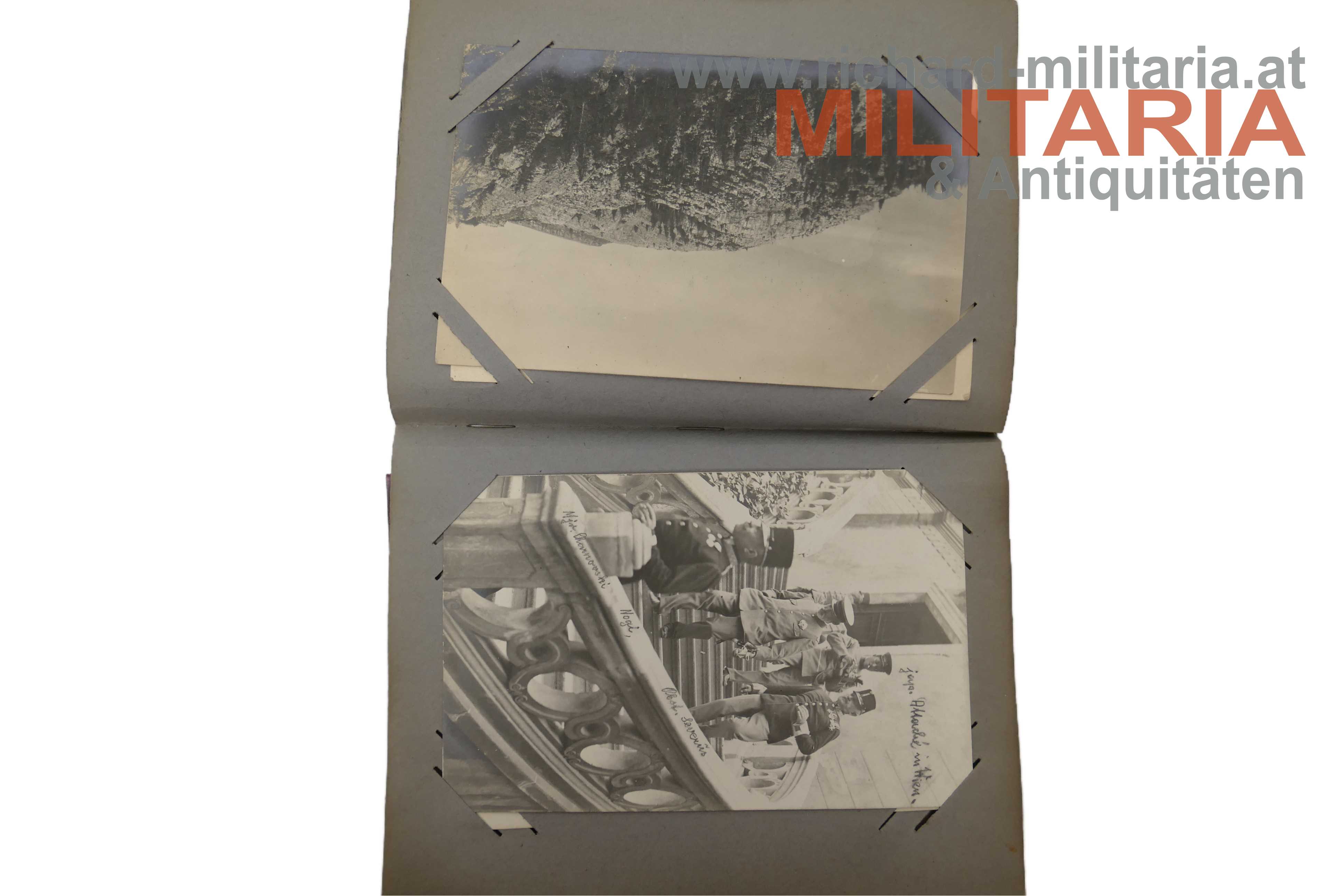 k.u.k. persönliches Fotoalbum des Oberstleutnant Johann Petermann Kommandant des 2. Feldbaons des steirischen Infanterie Regiment Nr. 27 an der Italienfront im Jahre 1916; mit 99 Aufnahmen bzw. handgezeichneten Feldpostkarten mit aufgeklebten Fotos; vollständig und fein säuberlich beschriftet; Postkarten revers an Fräulein Liserl Petermann adressiert und meist mit "Infanterie Regiment 27" gestempelt; viele handbemalte oder handgezeichnete Feldpostkarten mit aufgeklebten Bildern;