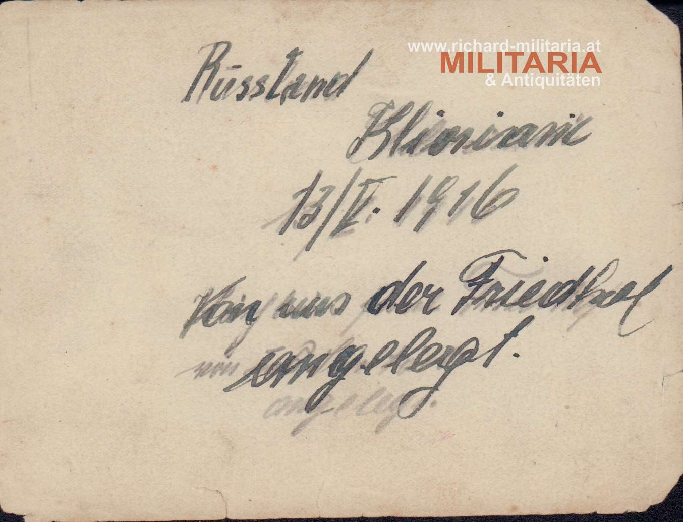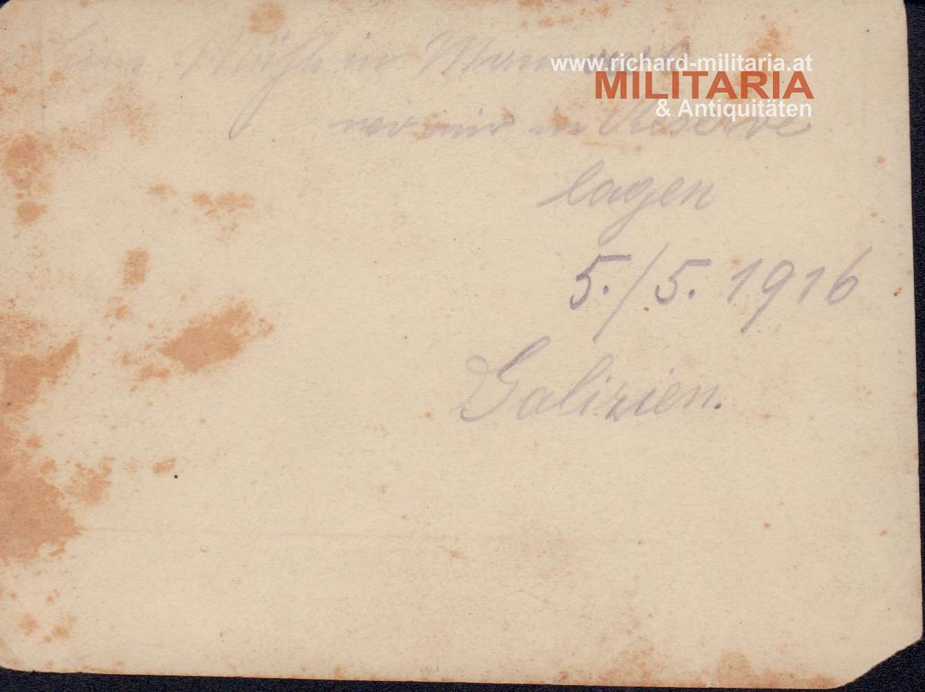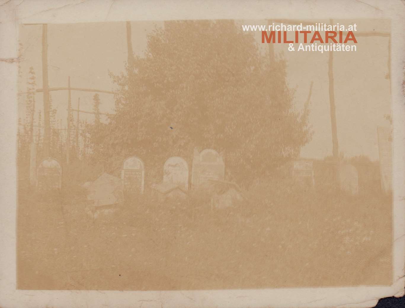 kleines Fotokonvolut eines Soldaten der k.u.k. Armee während seines Einsatzes in Galizien/Russland 1914 - 1916; originale Fotos meist in Postkartenformat; auf der Rückseite beschrieben und datiert; u.a. Pionier-GefreiterFranz Artitsch, Judenfriedhof, Husaren Truppenverschiebung, Feldlazarett, ...