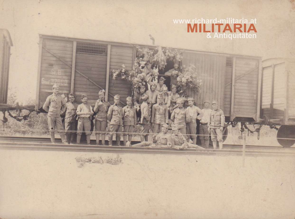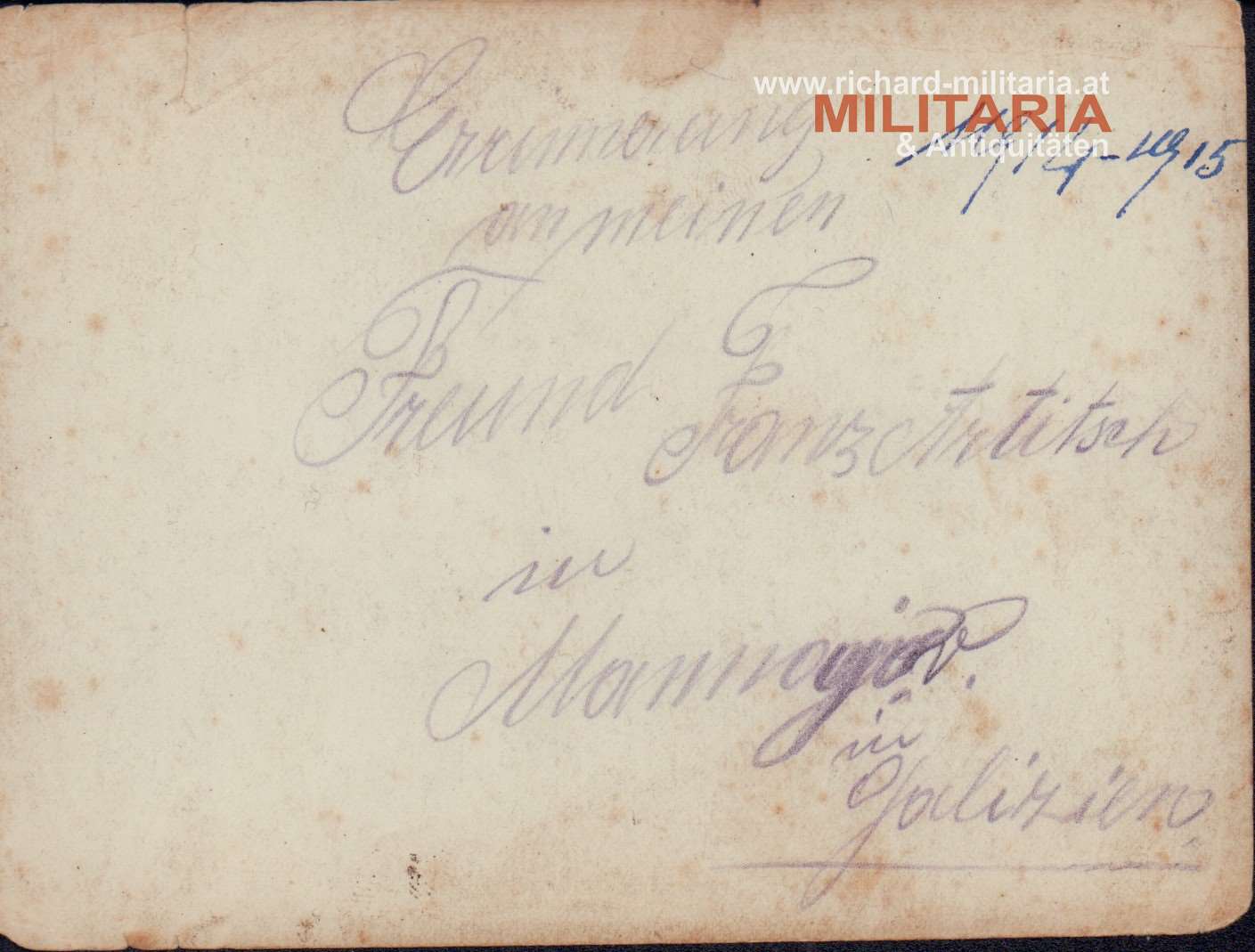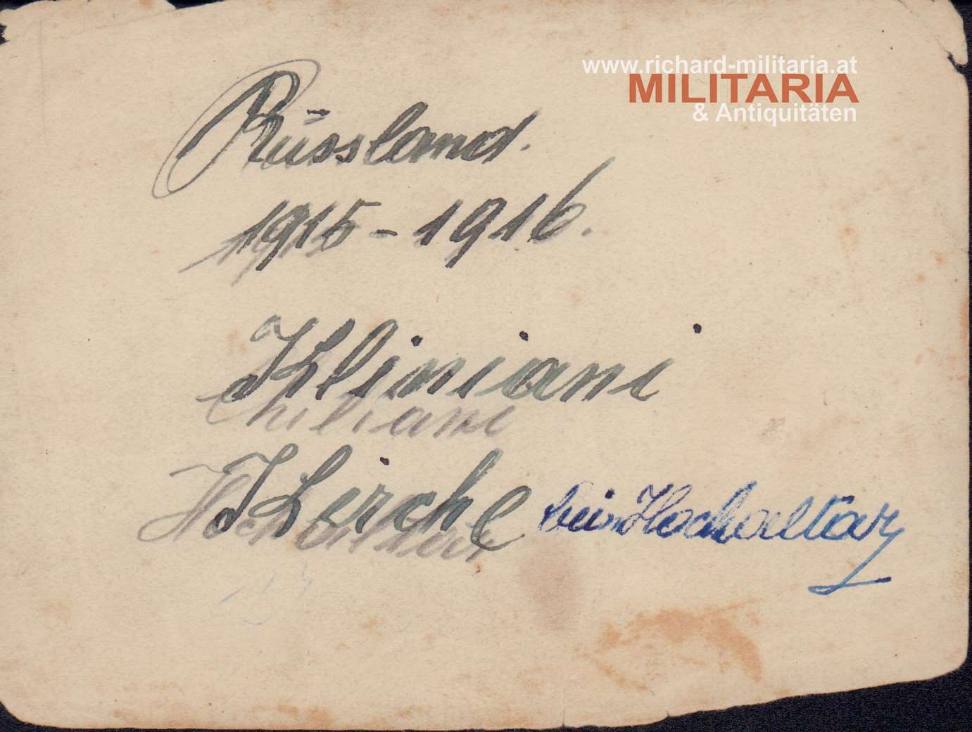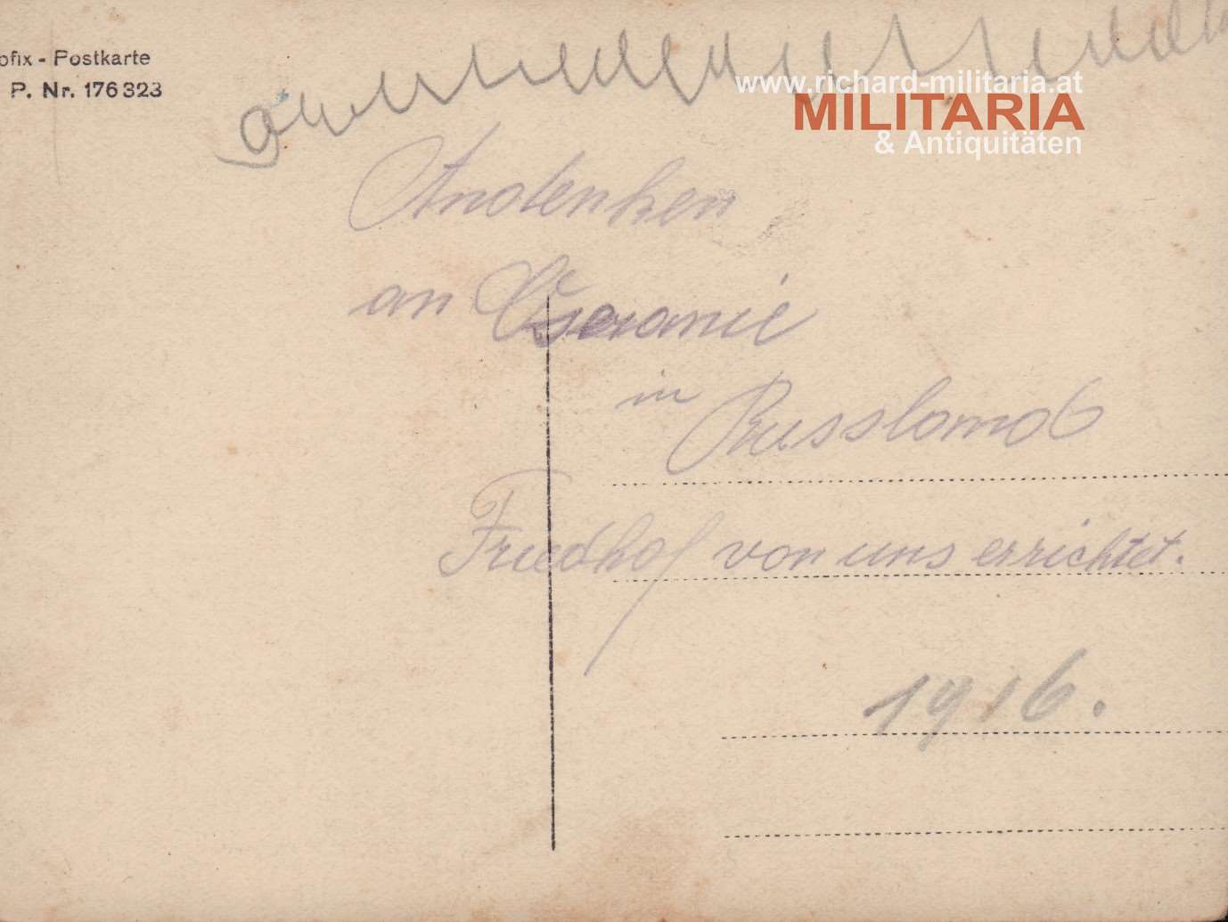 kleines Fotokonvolut eines Soldaten der k.u.k. Armee während seines Einsatzes in Galizien/Russland 1914 - 1916; originale Fotos meist in Postkartenformat; auf der Rückseite beschrieben und datiert; u.a. Pionier-GefreiterFranz Artitsch, Judenfriedhof, Husaren Truppenverschiebung, Feldlazarett, ...
