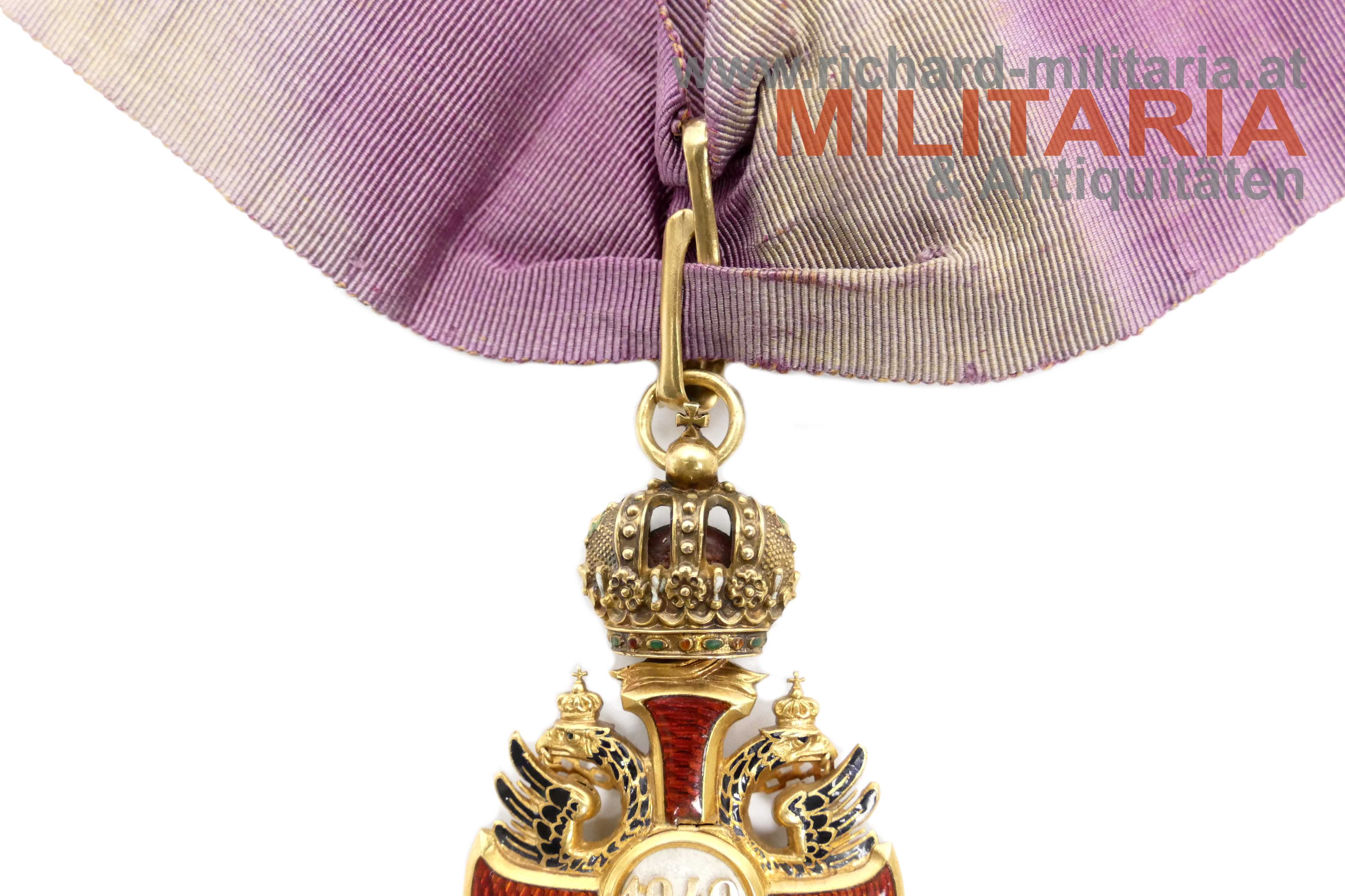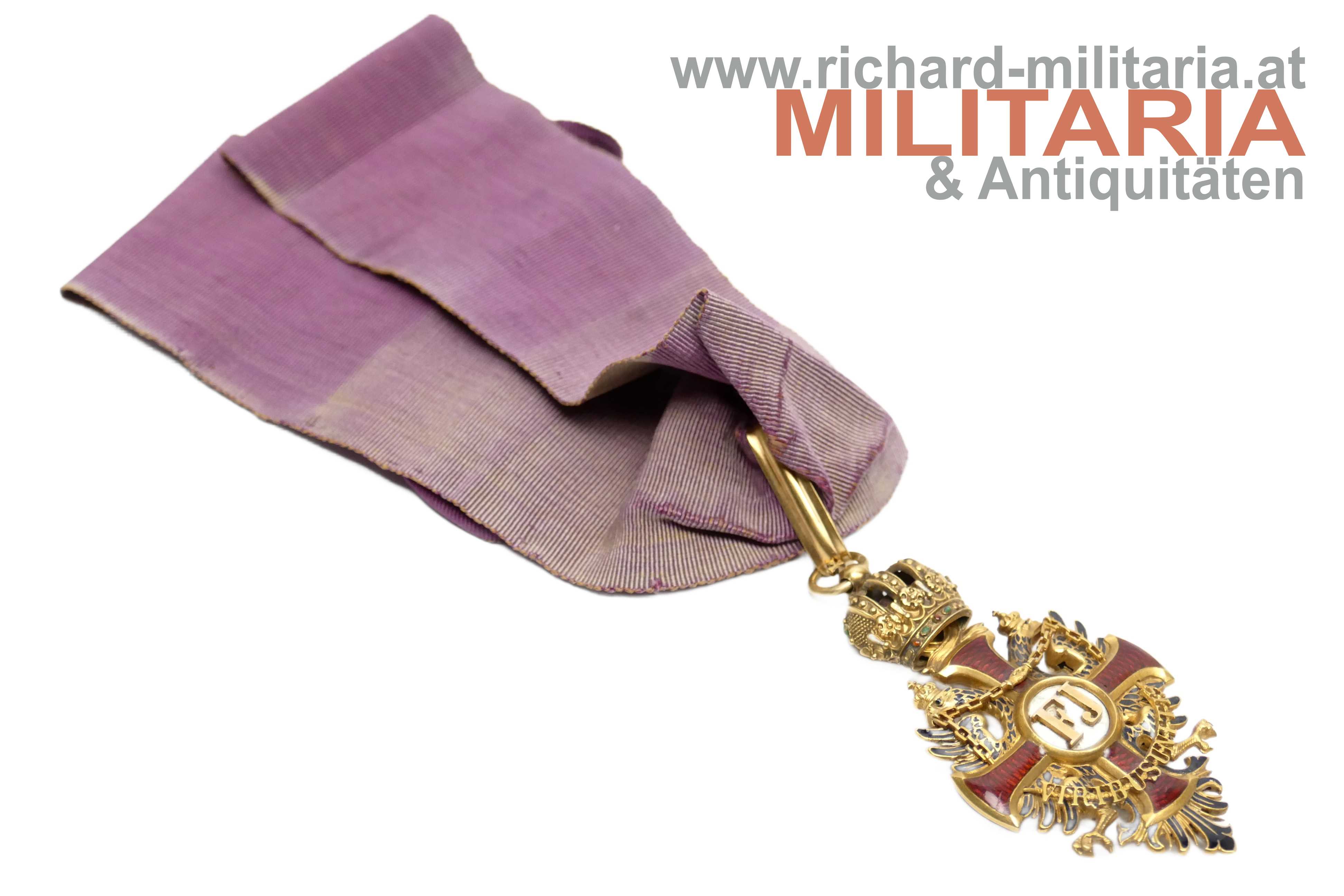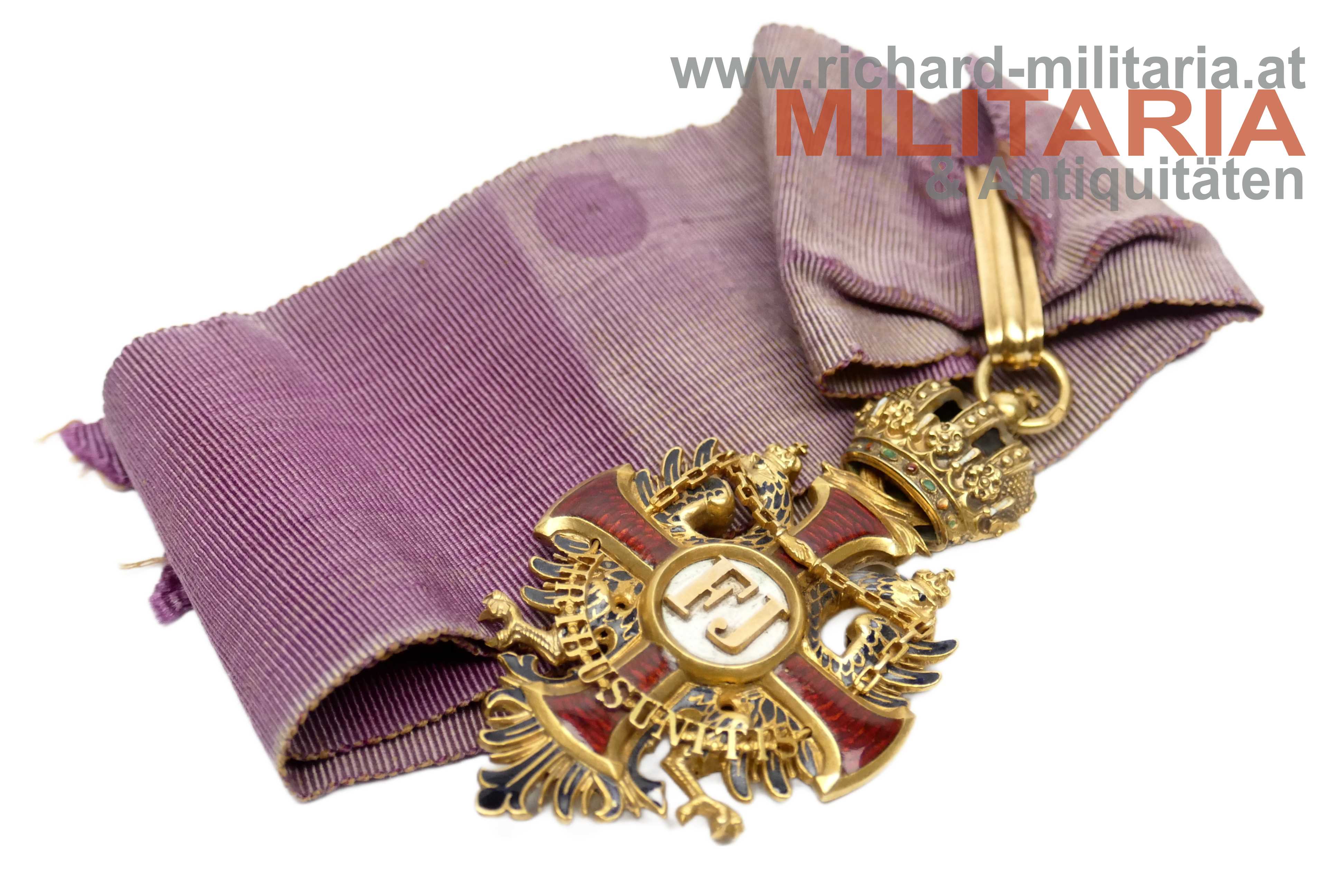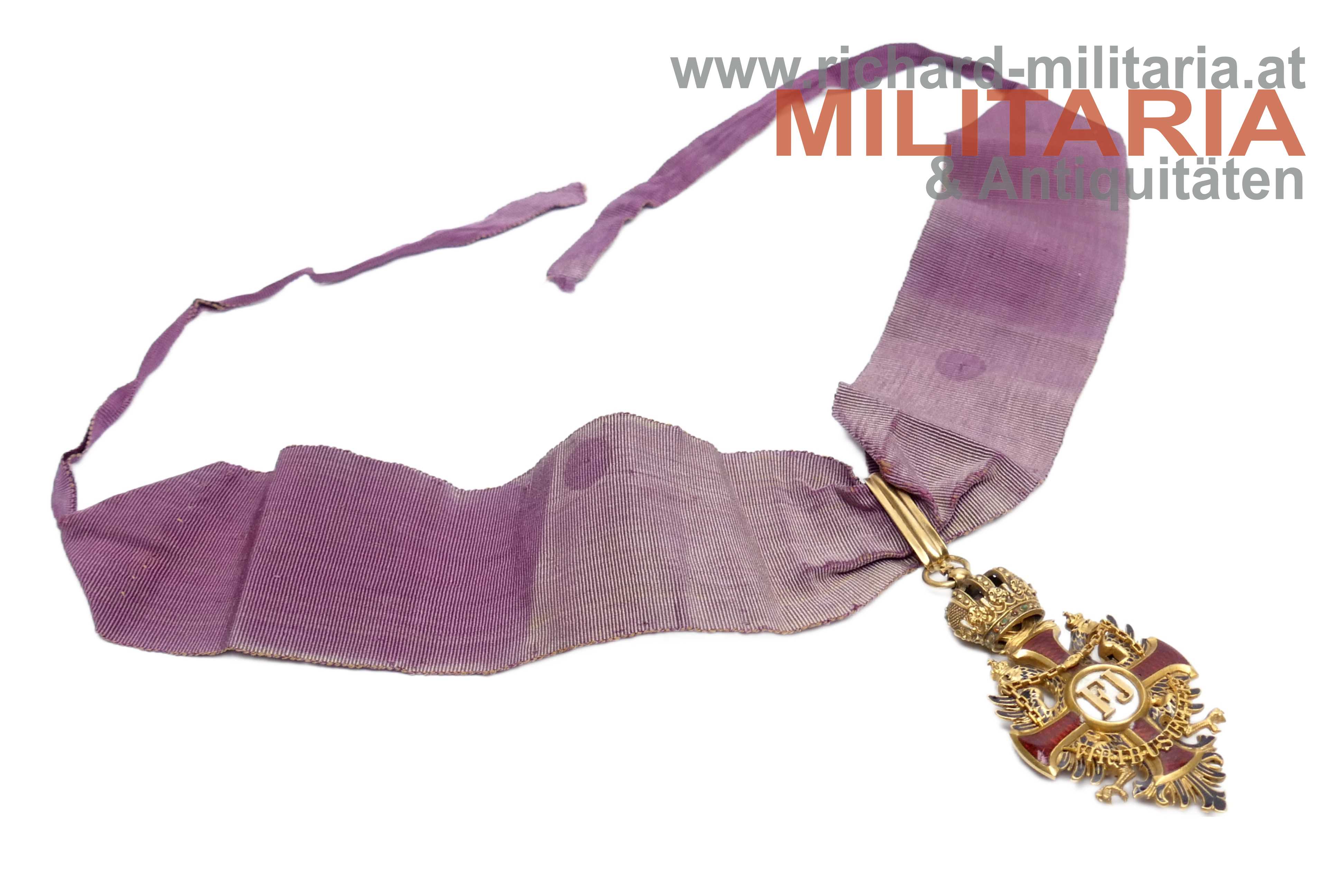 k.u.k. Franz Joseph-Orden - Komtur; GOLD; Gemsenkopfpunzierung ab 1872 und Herstellerpunzierung "GR" (Gebrüder Resch); Emaillierung einwandfrei mit minimalen Tragespuren; Mittelmedaillon unbeschädigt jedoch etwas angeschmutzt; Mittelmedaillon revers öffnet und schließt einwandfrei; Durchzugsöse aus Gold unpunziert; am frühen violetten (!!), konfektioniertem Halsband; dieses altersbedingt etwas ausgeblichen;