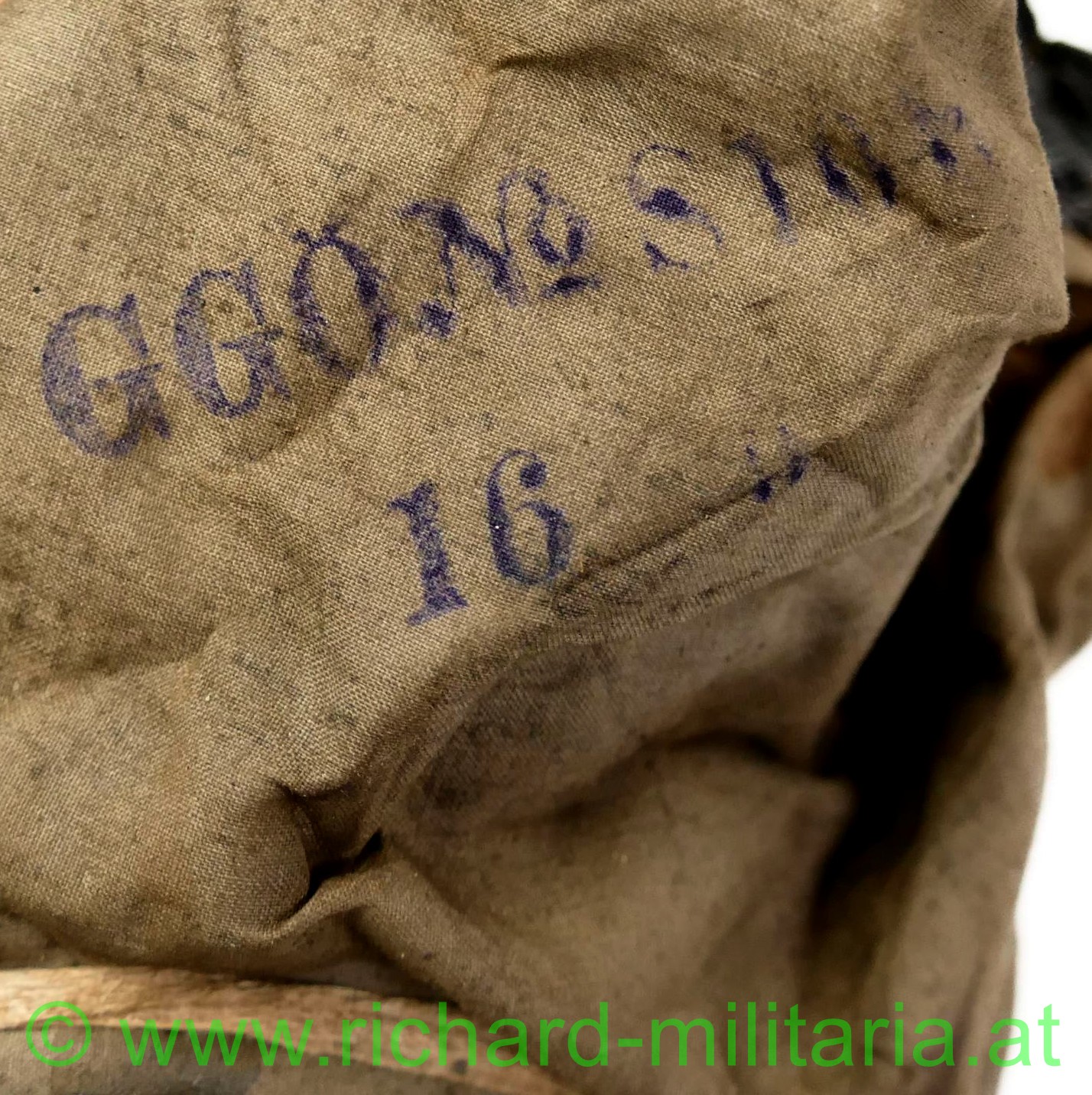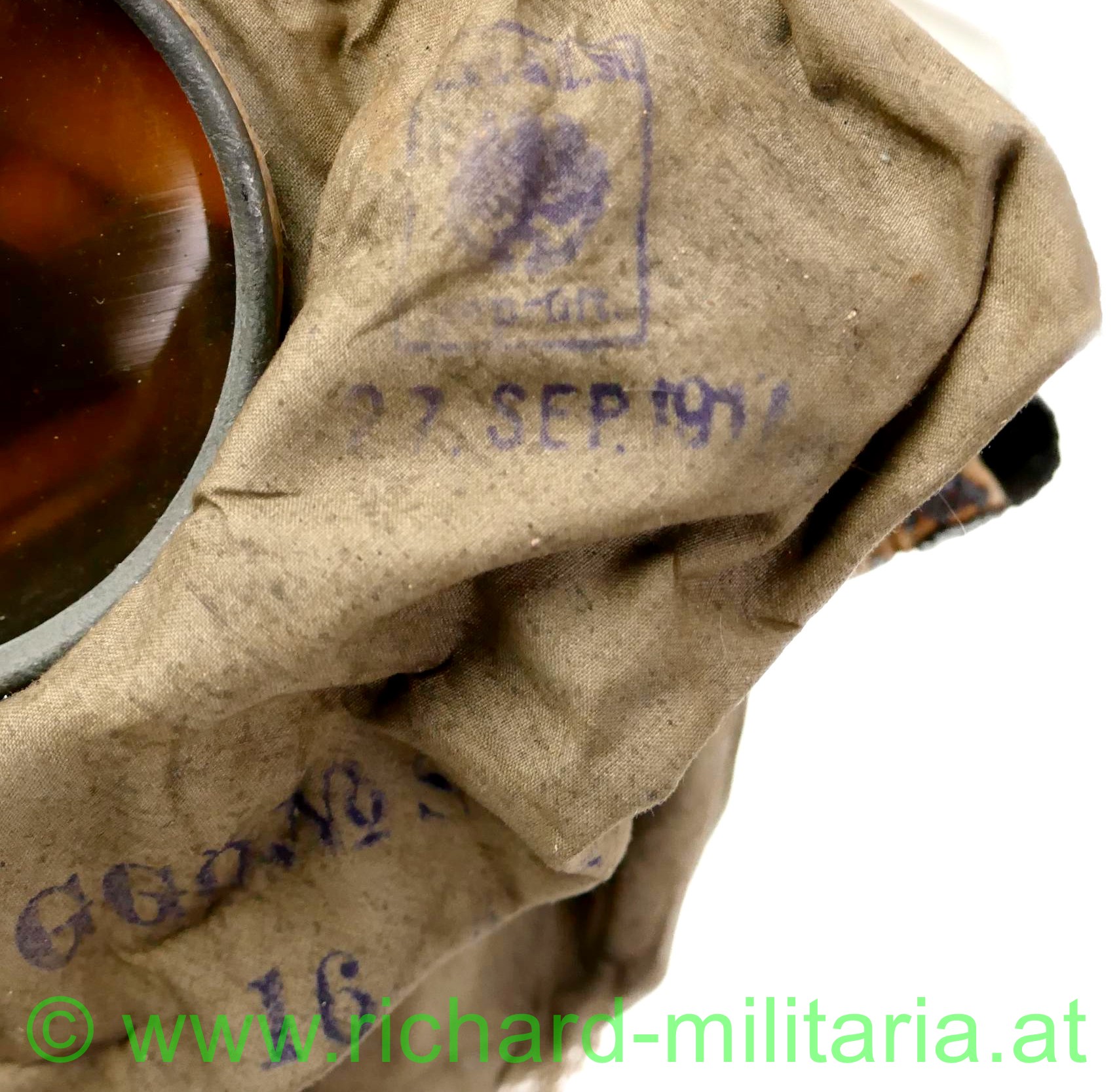 k.u.k. Rahmengasmaske TYP A5 Behälter der Firma AUER - komplett - österreichische Fertigung, Rahmenmaske 2. Modell mit diversen Stempelungen und Fertigungsdatum: "27. Sep. 1917 GGÖ No. S... - 16", alle Zugbänder vorhanden, k.u.k.-Stempelung am Einschraubstutzen, Gasfilter mit Datum: "31.8.17 - A 4 k.u.k." und Prägung: "K.u.k. P", passende Dose mit sehr viel original Lack und originaler Leinenberiemung - an einem Ende fehlt die Eisenniete, am Deckel bestoßen - läßt sich aber problemlos öffnen und schließen, kleines Loch - am Deckel;