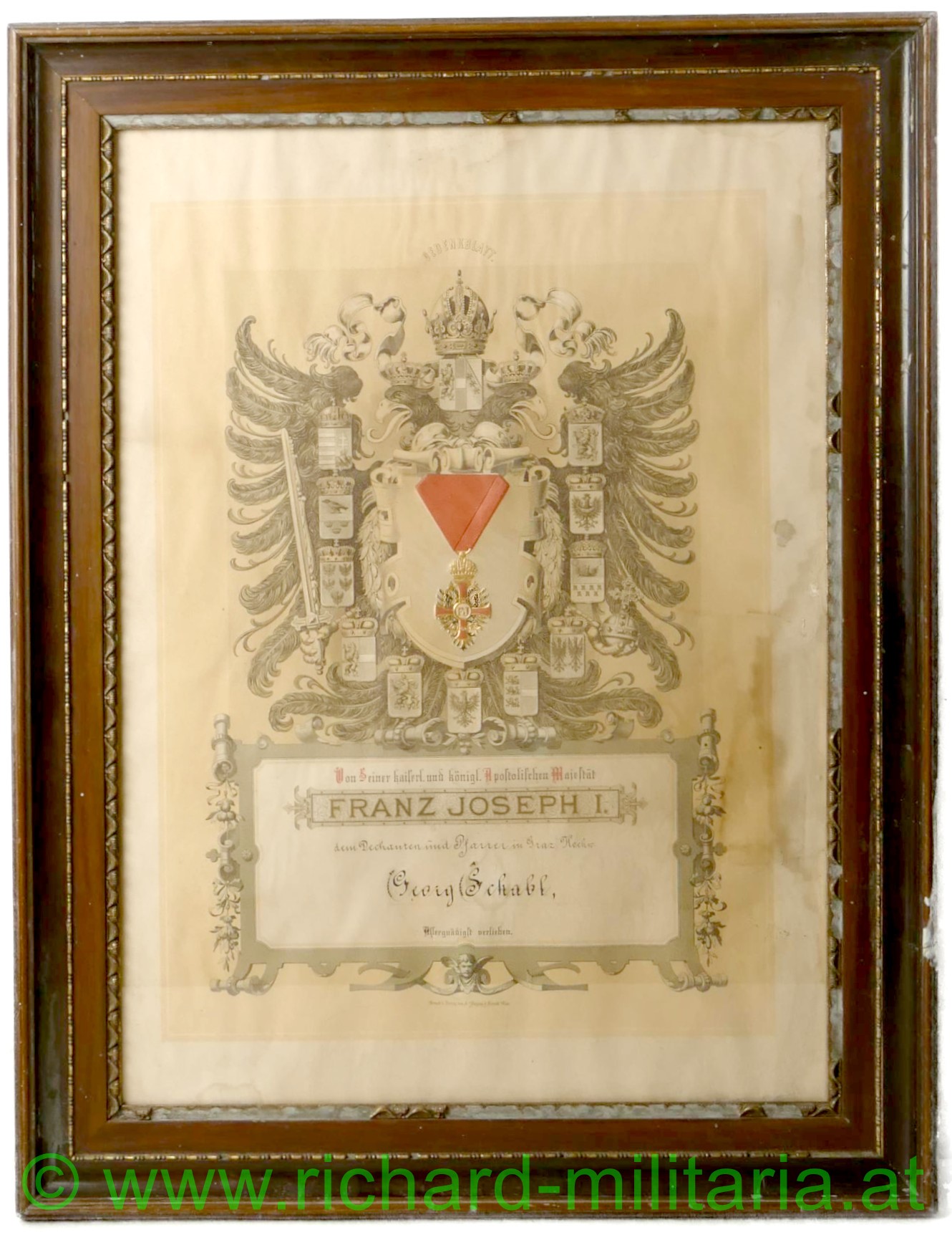 k.u.k. Schmuckurkunde Franz Joseph Orden für einen Pfarrer, Gedenkblatt für die Verleihung des Franz Joseph Ordens an den Pfarrer Georg Schabl aus Graz, Urkunde ist hinter Glas gerahmt - diese fleckig, erhaben geprägter Franz Joseph Orden - dieser koloriert; Rahmen ebenfalls mit leichten Beschädigungen - auf der Rückseite Aufhängevorrichtung;