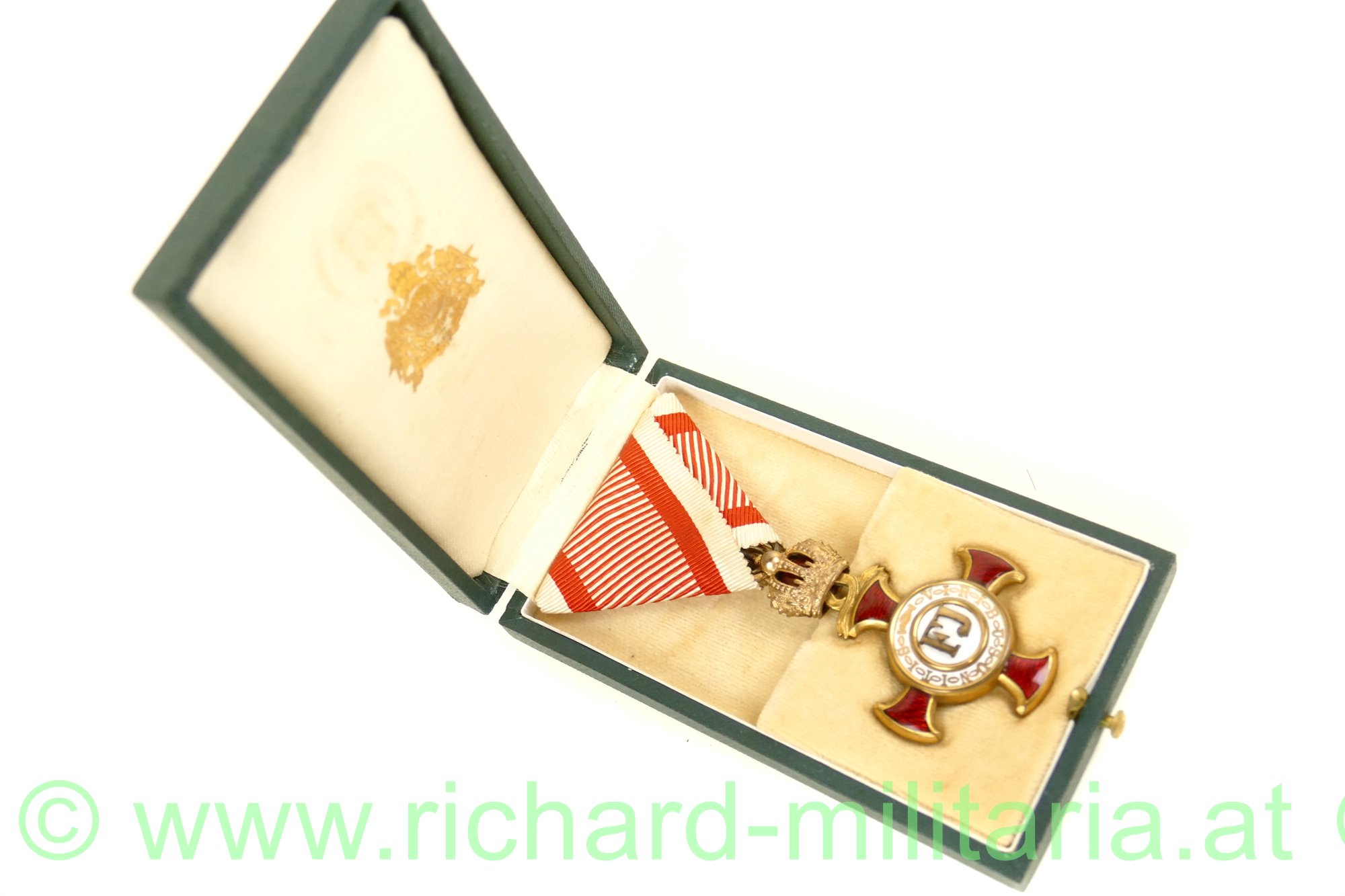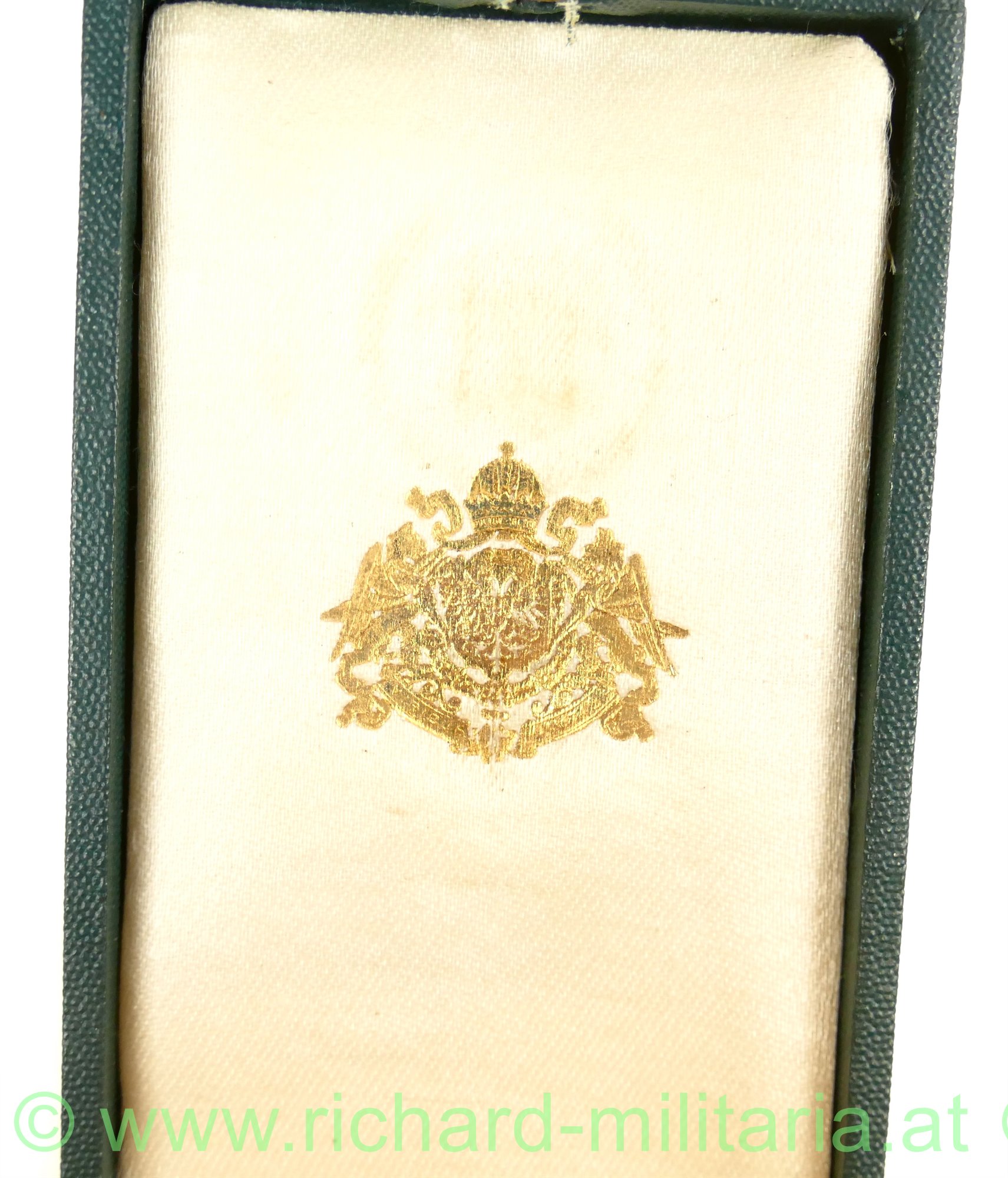 k.u.k. Goldenes Verdienstkreuz mit der Krone; bronze vergoldet und emailliert; mit seltenem Hersteller "K. Böhm", Sternpunzierung und "Wien" am Ring punziert; am originalen Band mit Schwertern; keine Beschädigungen und nur leichte Abnutzungsspuren; seltenes originales, grünes Etui mit in gold aufgedruckter varianter Schrift "V.K m.d.K."; auf der Rückseite "1916" und "Bronze" gestempelt;