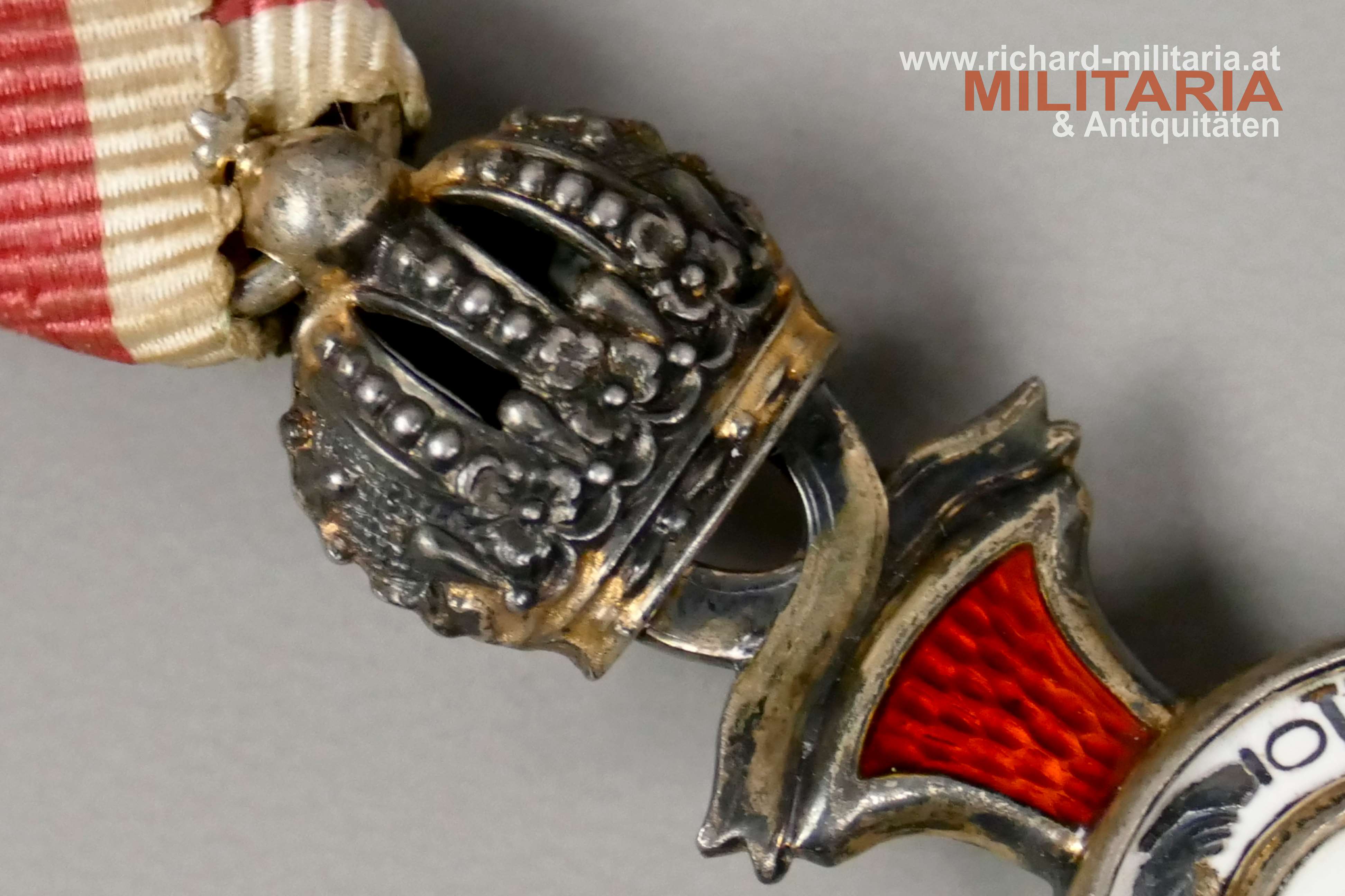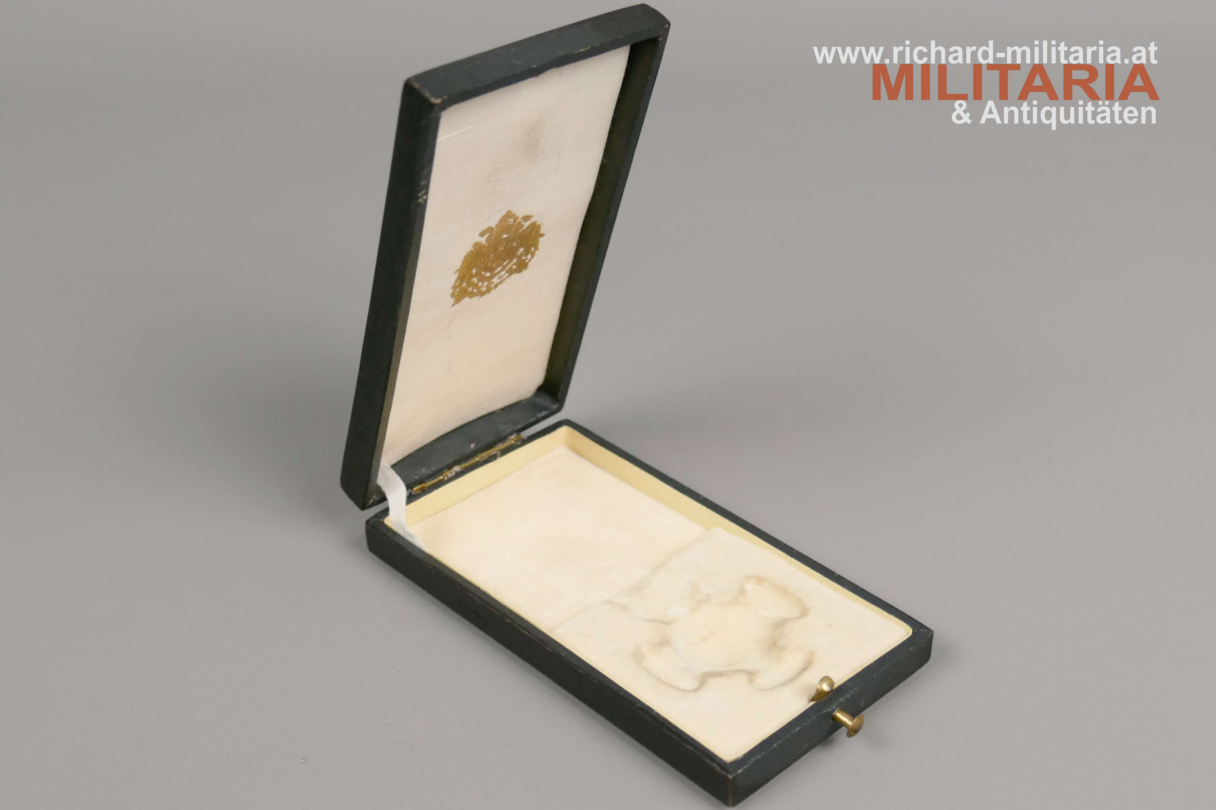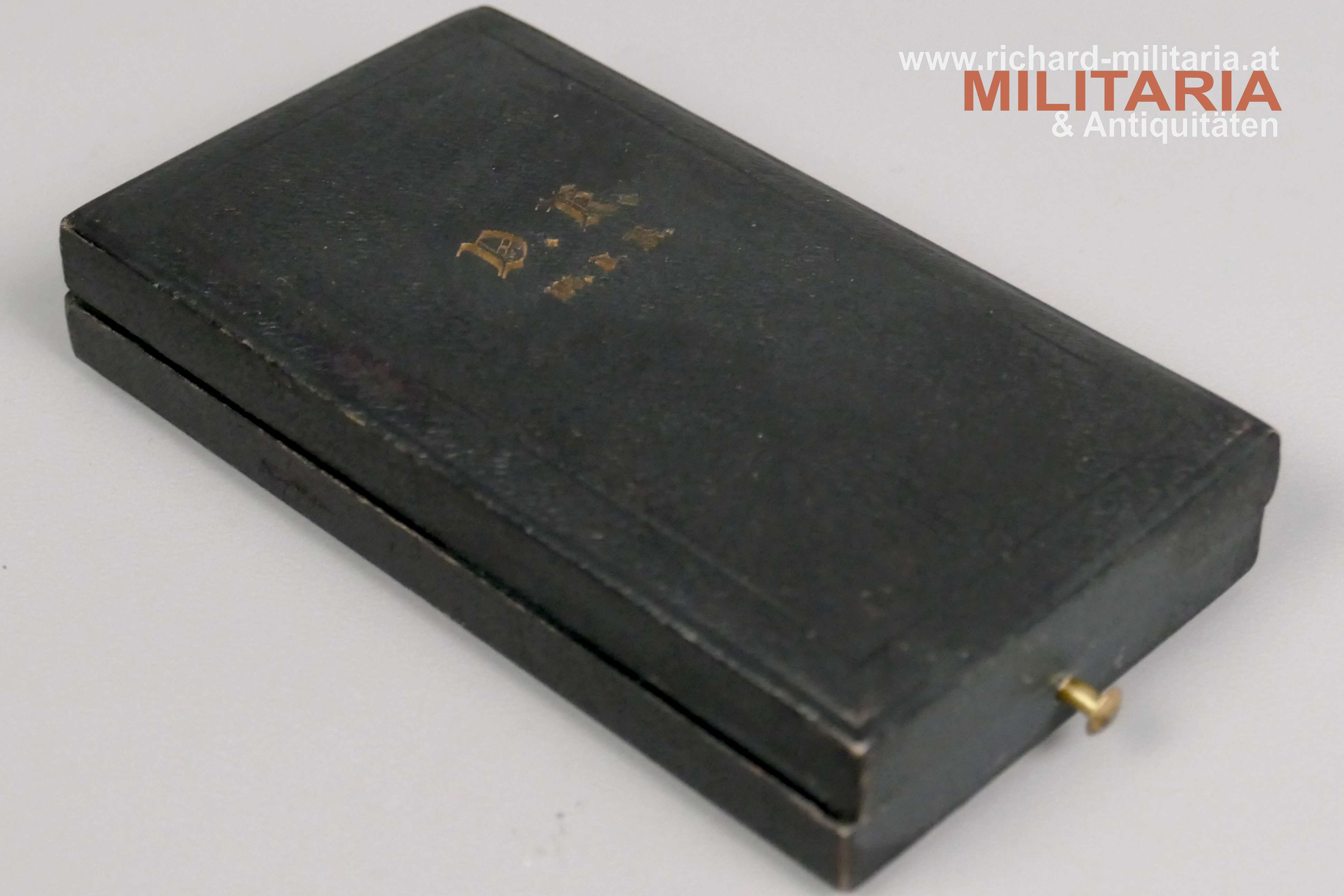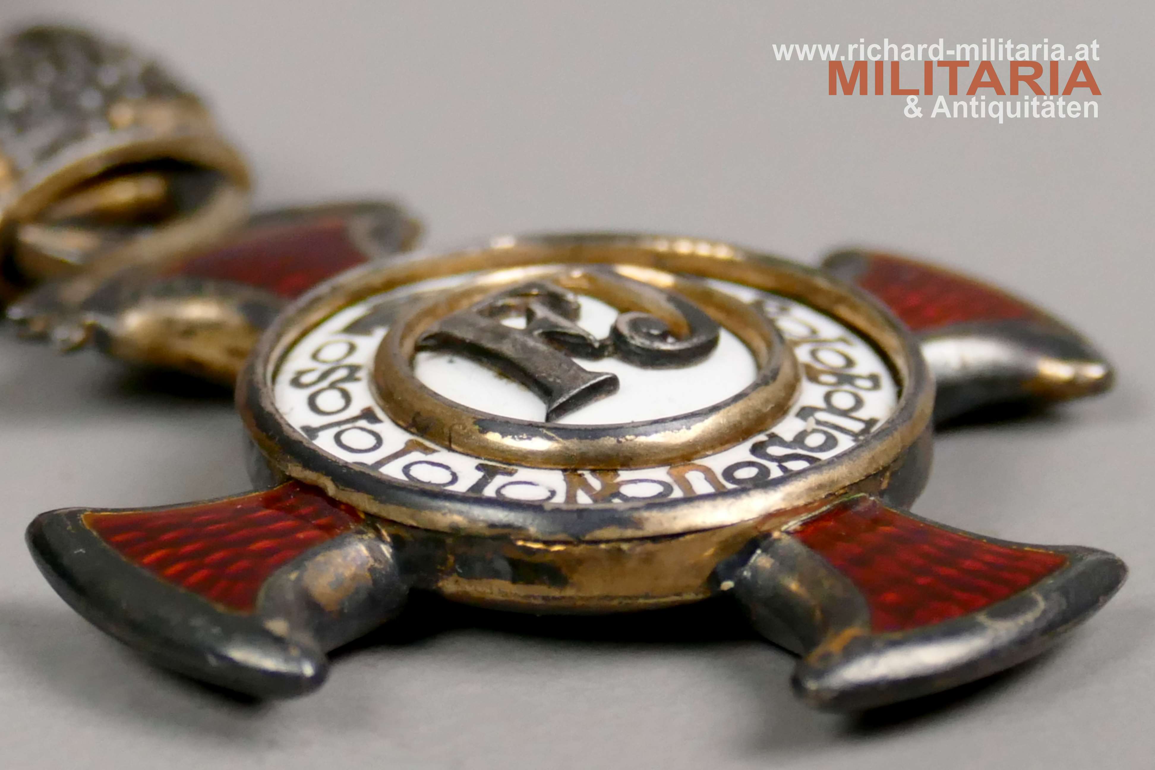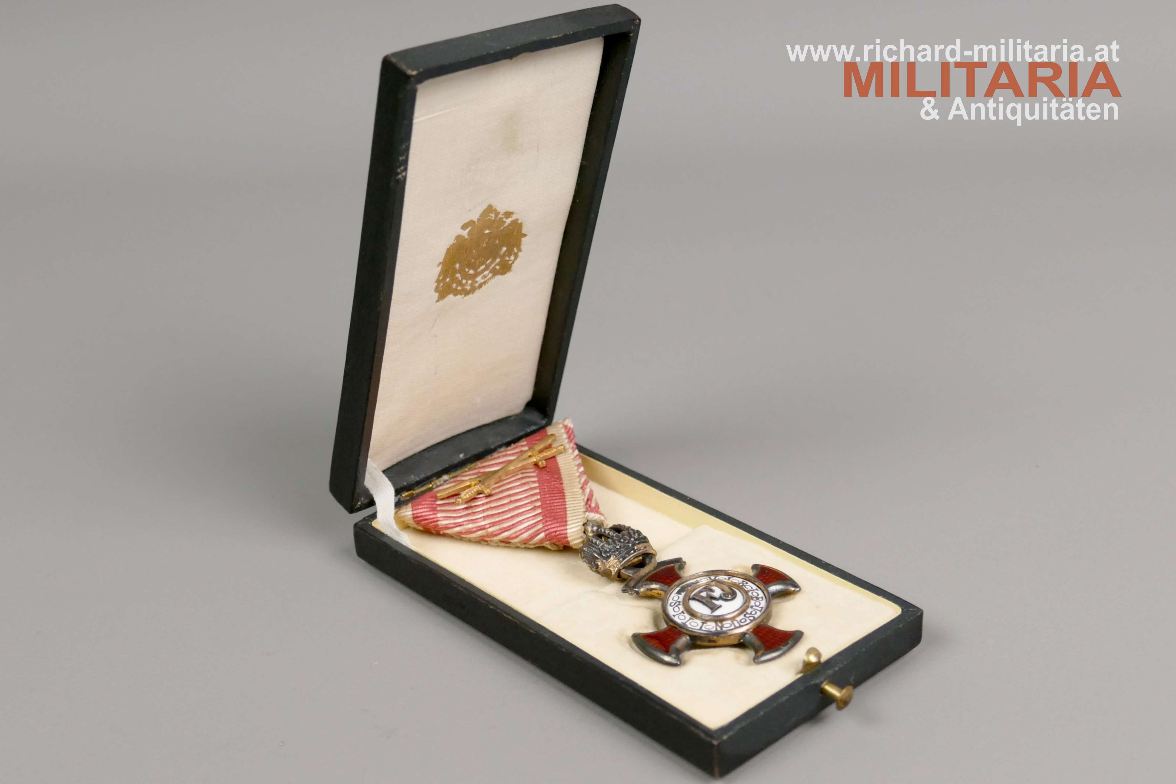 k.u.k. Goldenes Verdienstkreuz mit der Krone und Schwertern mit zugehörigem Etui; Silber vergoldet - Vergoldung großteils vergangen; vom seltenen Hersteller "HUW" (Heinrich Ulbricht's Witwe); "HUW" und die österreichische Einfuhrpunze 1902-1922 am Bandring; Variante mit weiß emaillierter Medailloneinfassung revers (!); Emaillierung einwandfrei; am originalen Band mit aufgesplinteten Schwertern; schwarzes Etui mit goldenem Deckelaufdruck "V. K. m. d. K."; revers mit "1916" gestempelt; Etui in sehr guter Erhaltung;