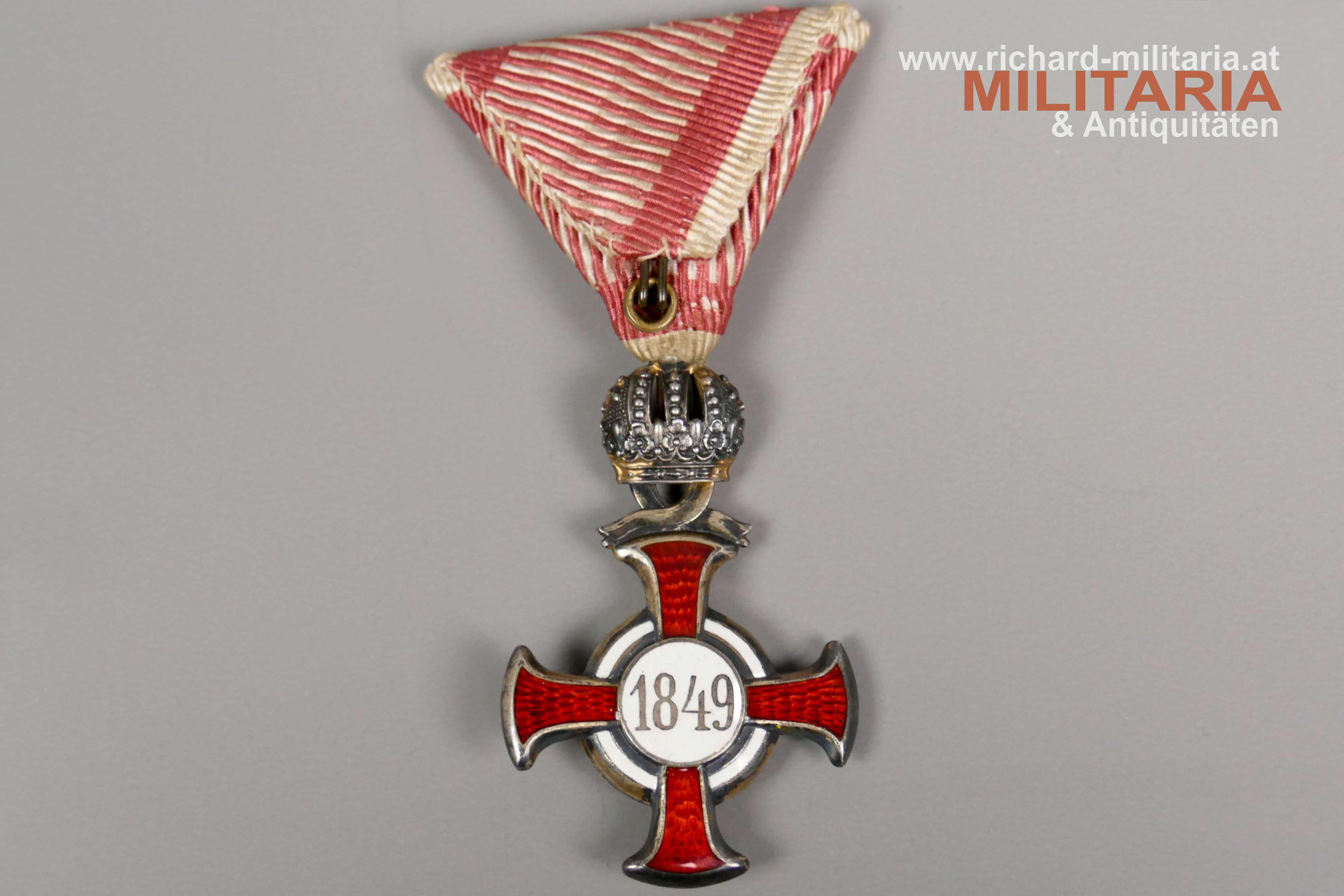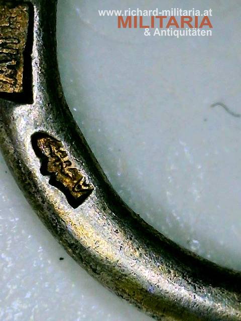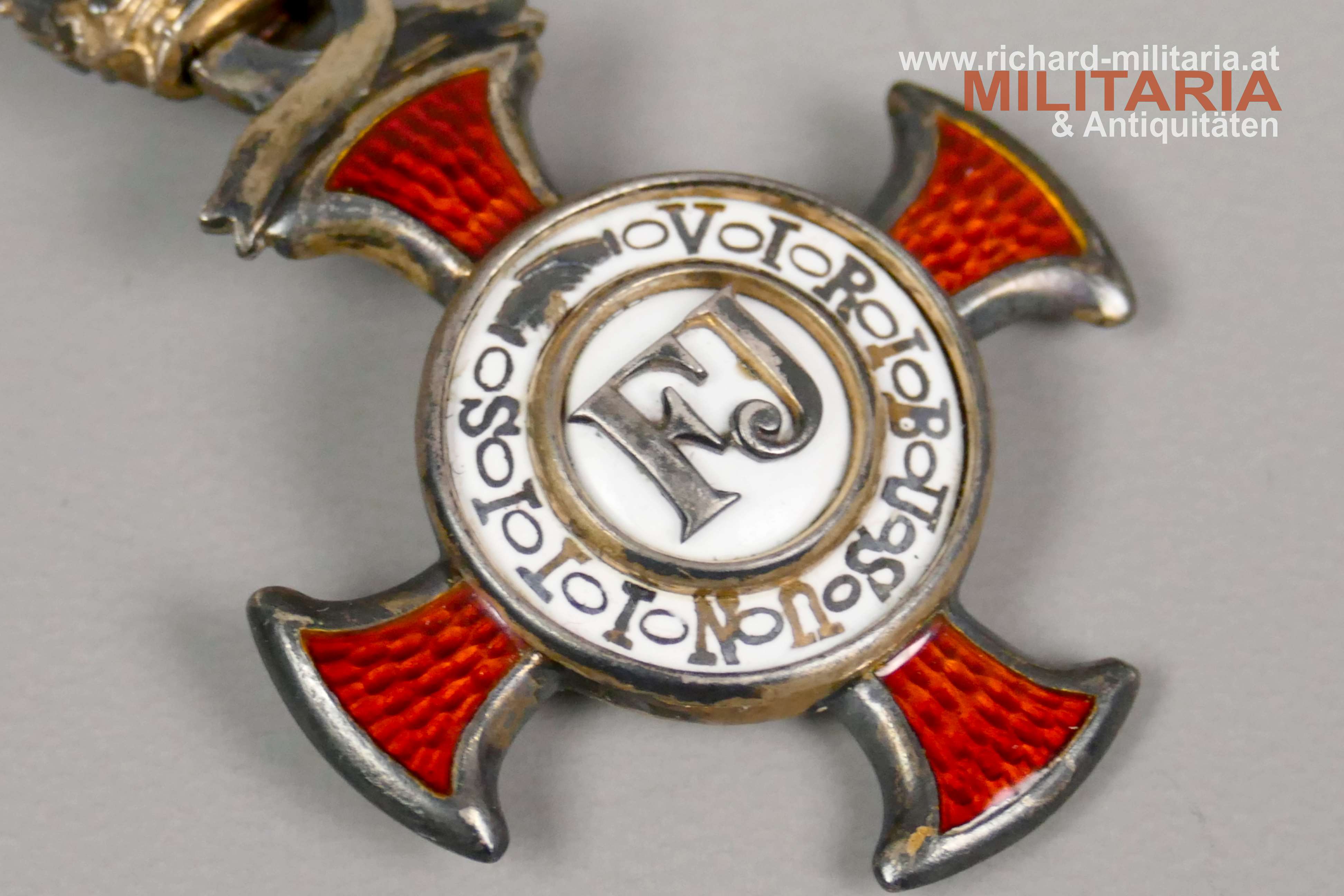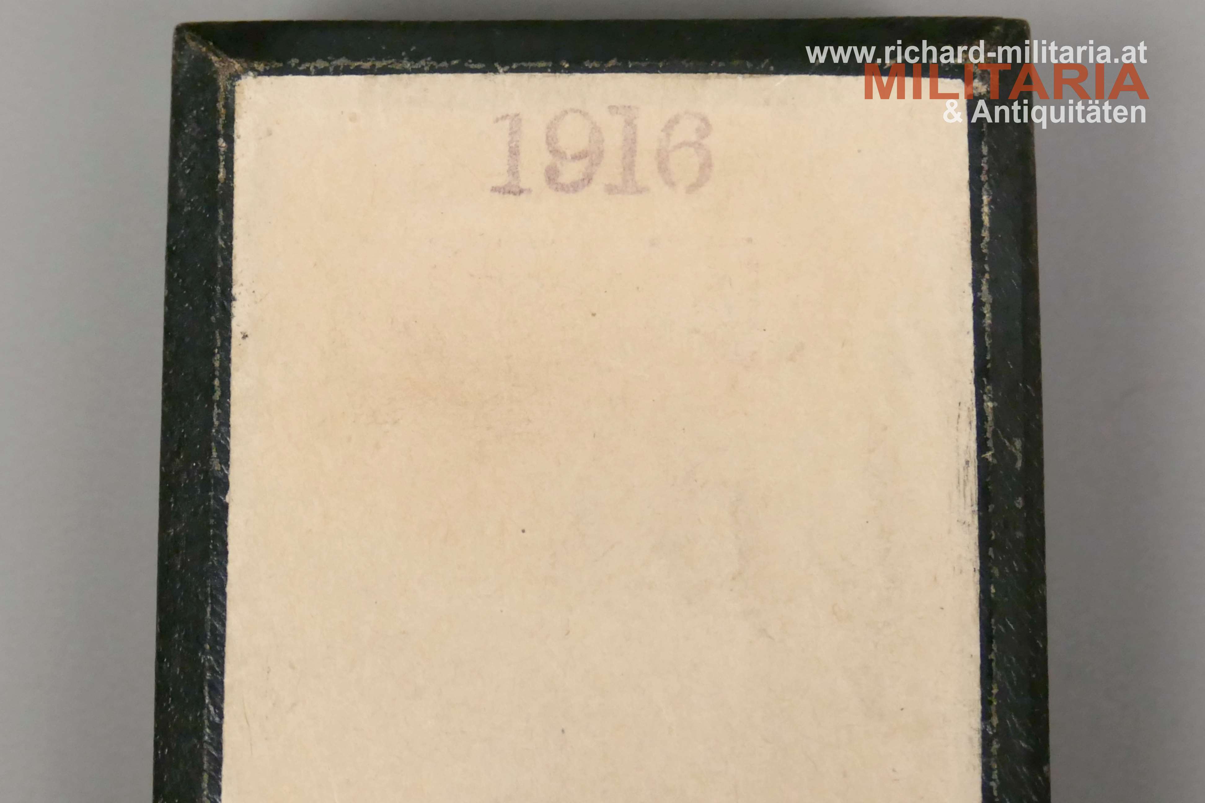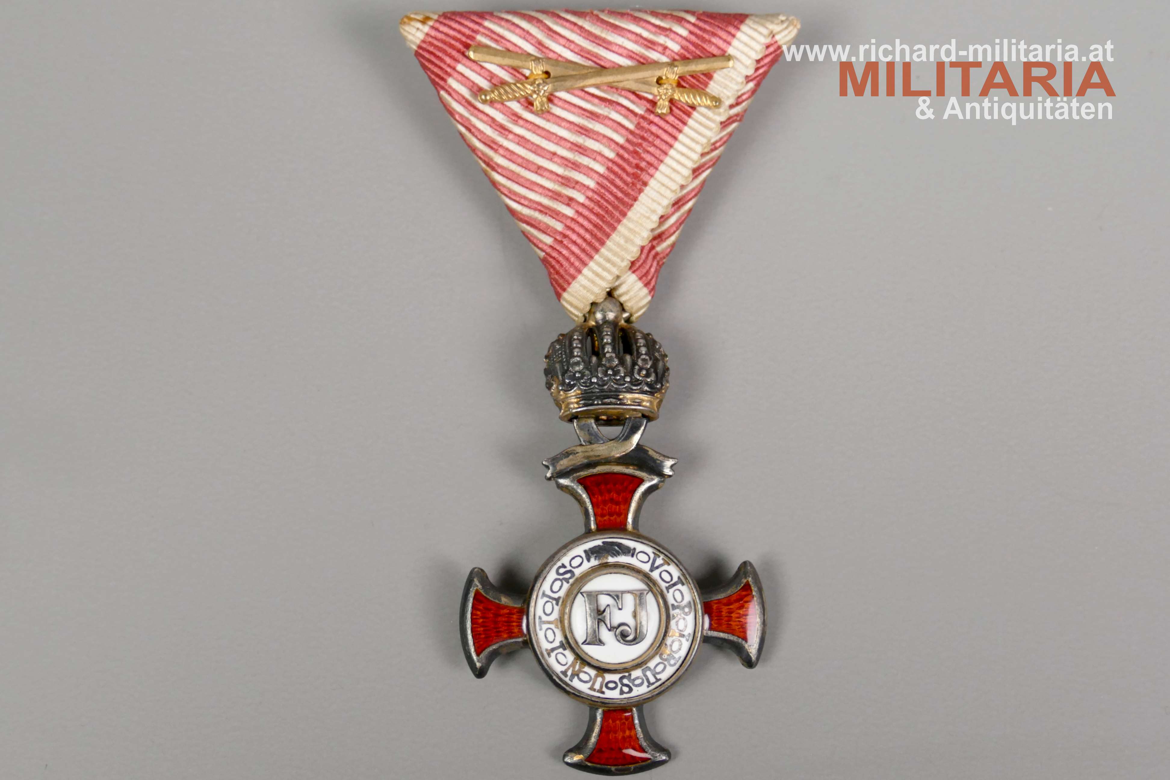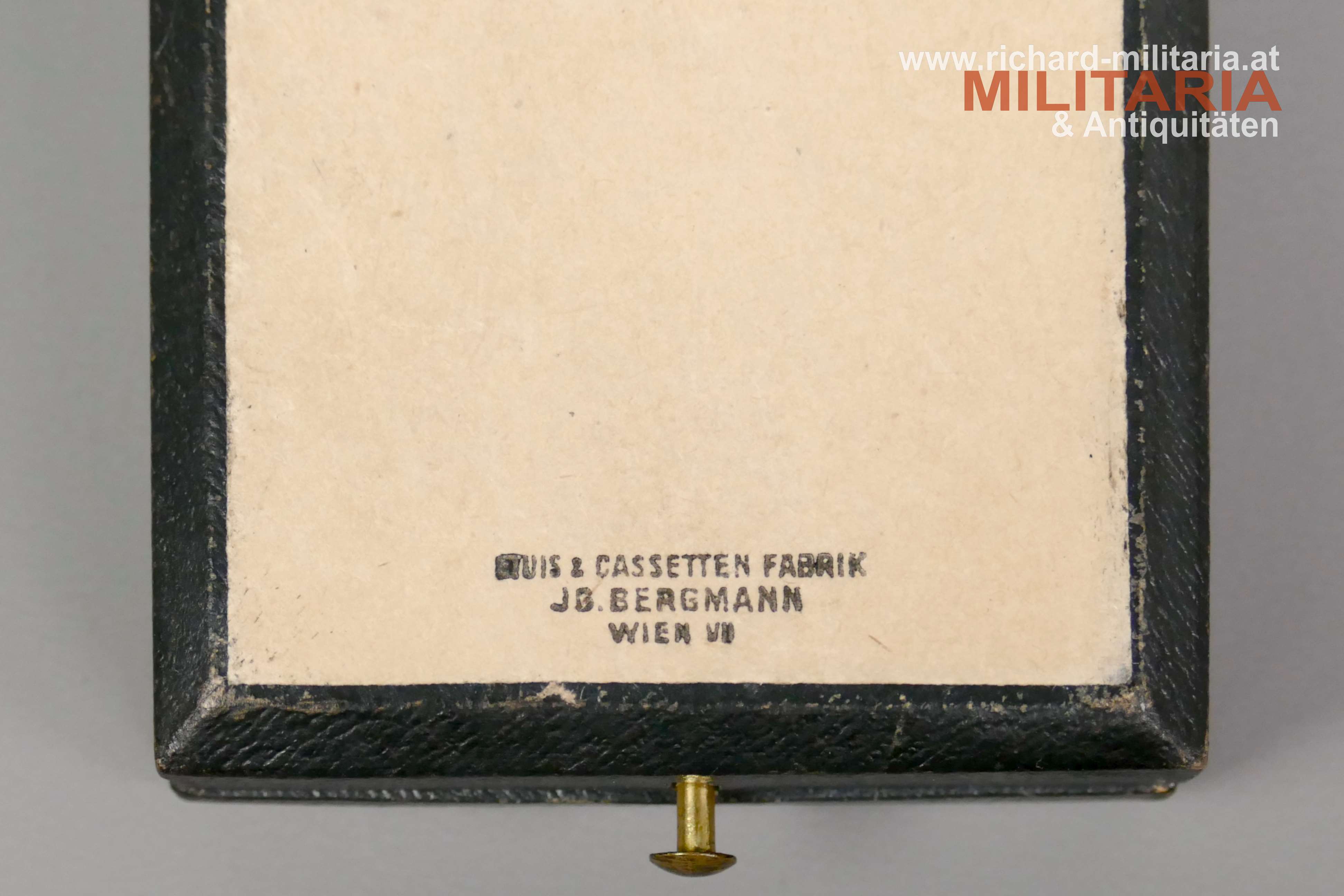 k.u.k. Goldenes Verdienstkreuz mit der Krone und Schwertern mit zugehörigem Etui; Silber vergoldet - Vergoldung großteils vergangen; vom seltenen Hersteller "HUW" (Heinrich Ulbricht's Witwe); "HUW" und die österreichische Einfuhrpunze 1902-1922 am Bandring; Variante mit weiß emaillierter Medailloneinfassung revers (!); Emaillierung einwandfrei; am originalen Band mit aufgesplinteten Schwertern; schwarzes Etui mit goldenem Deckelaufdruck "V. K. m. d. K."; revers mit "1916" gestempelt; Etui in sehr guter Erhaltung;