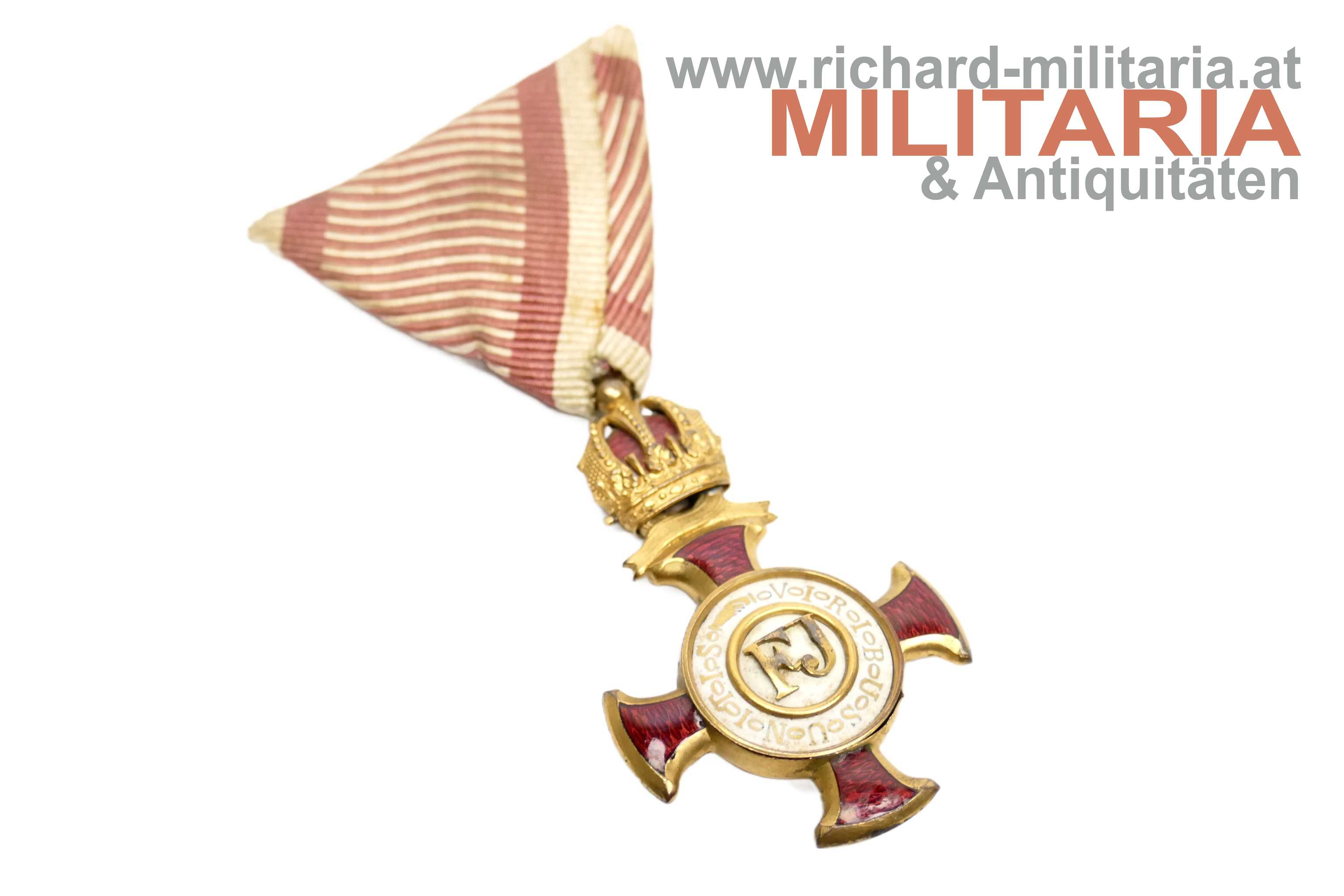 k.u.k. Goldenes Verdienstkreuz mit der Krone; Bronze vergoldet; am Bandring die Herstellerpunze "Wilh. Kunz", "Wien X" und Sternpunzierung; auf den Pendilen eine weitere Sternpunzierung; avers am unteren Kreuzarm eine kleine oberflächliche Emailbeschädigung; Vergoldung sehr gut erhalten; am originalen Kriegsband;