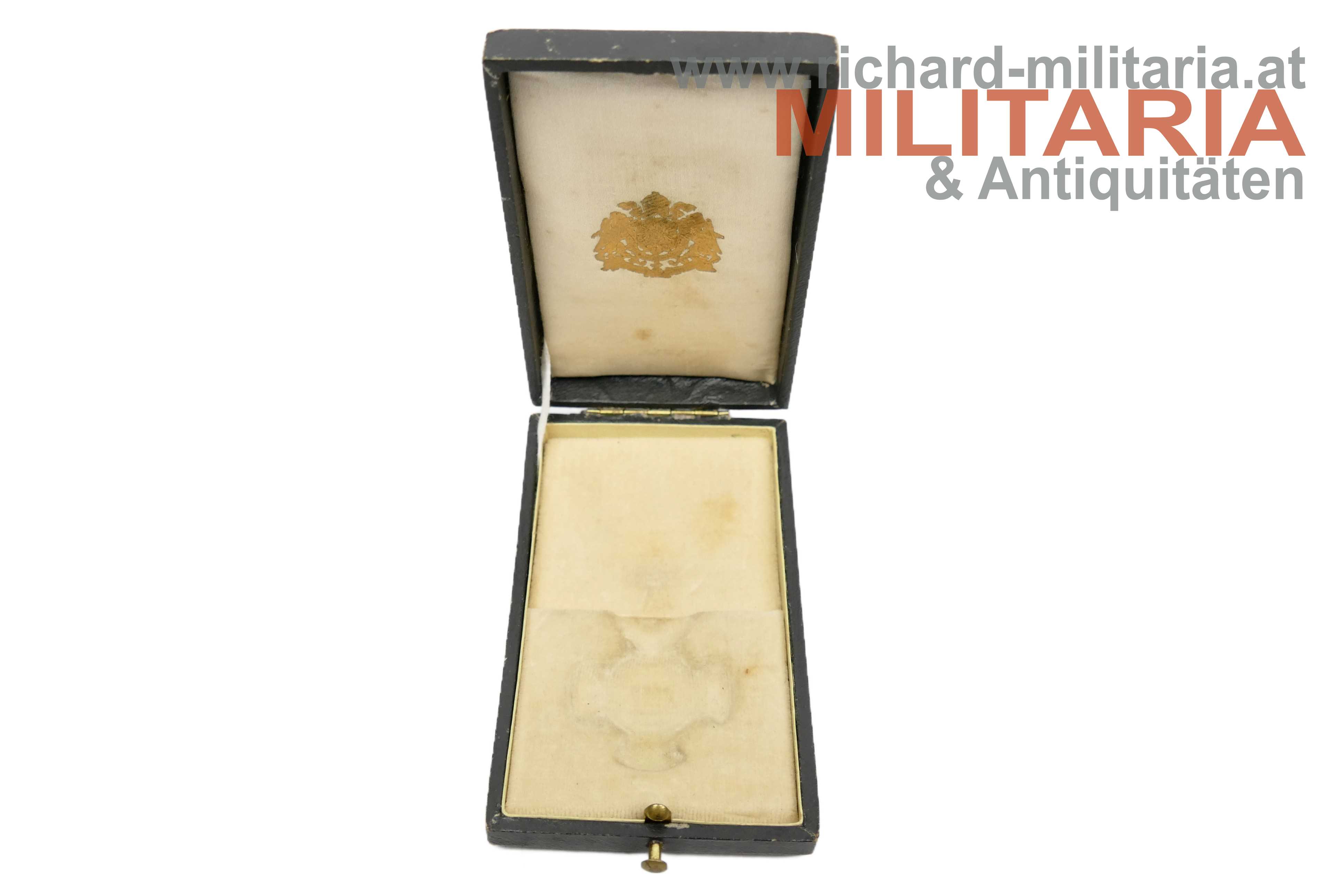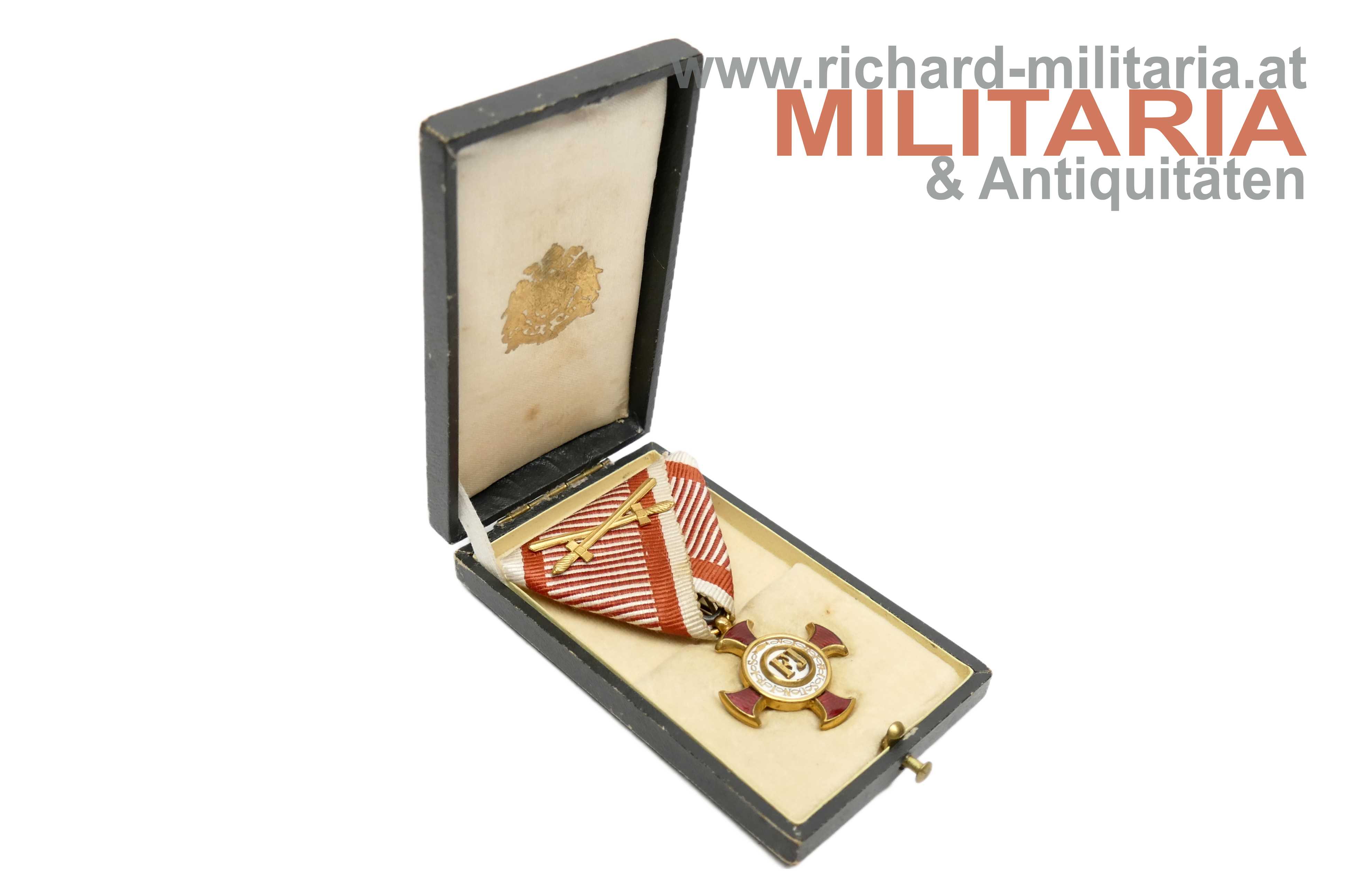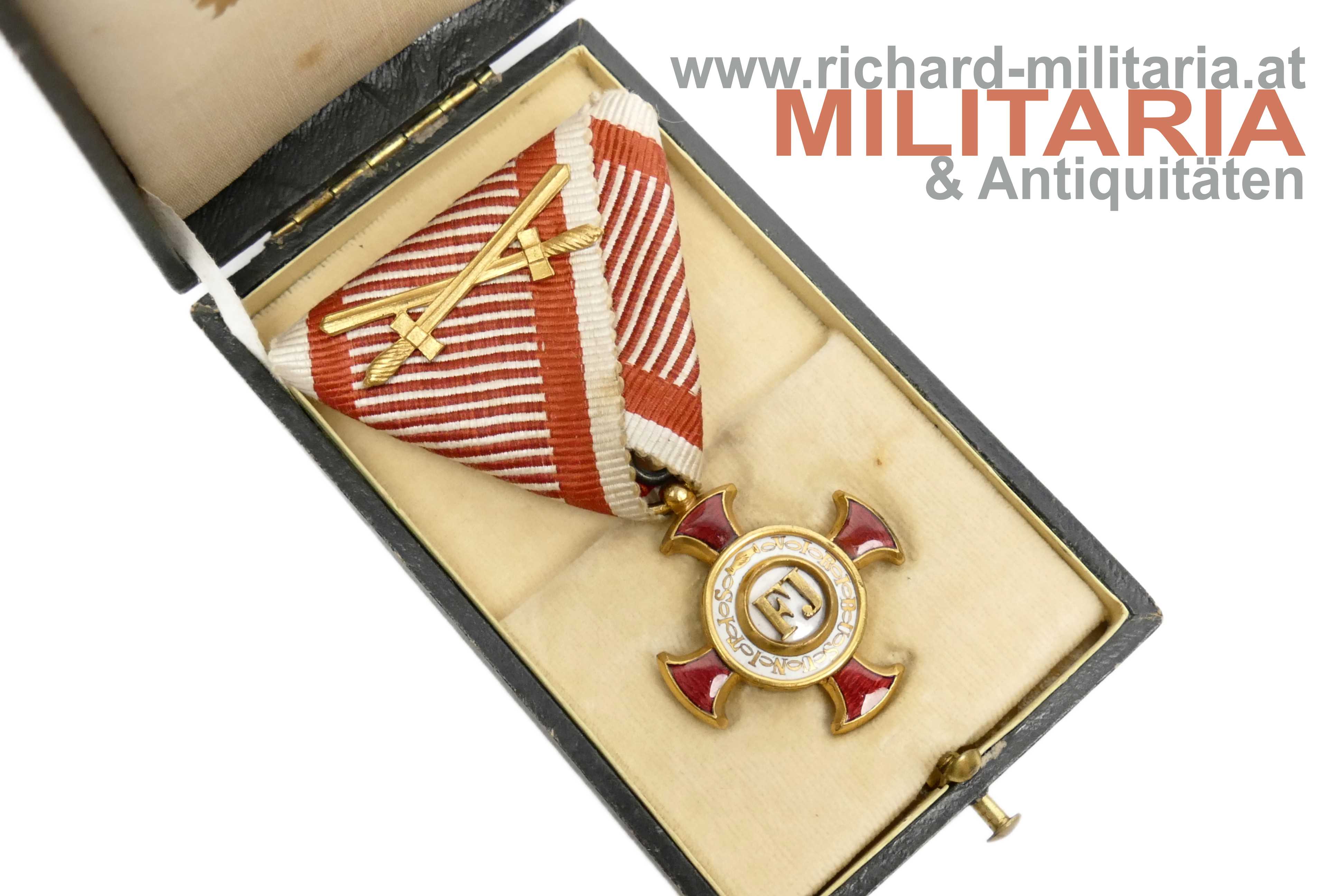 k.u.k. Goldenes Verdienstkreuz mit Schwertern im Etui; Bronze vergoldet; am Bandring "V. Mayers Söhne", "In Wien" und Sternpunzierung am Bandring; Emaillierung einwandfrei; Schwerter auf originalem Band aufgesplintet; Etui mit goldener Deckelprägung; Etui am Bonden mit "1916" und "Bronze" gestempelt; Etui mit altersüblichen Abnutzungsspuren;