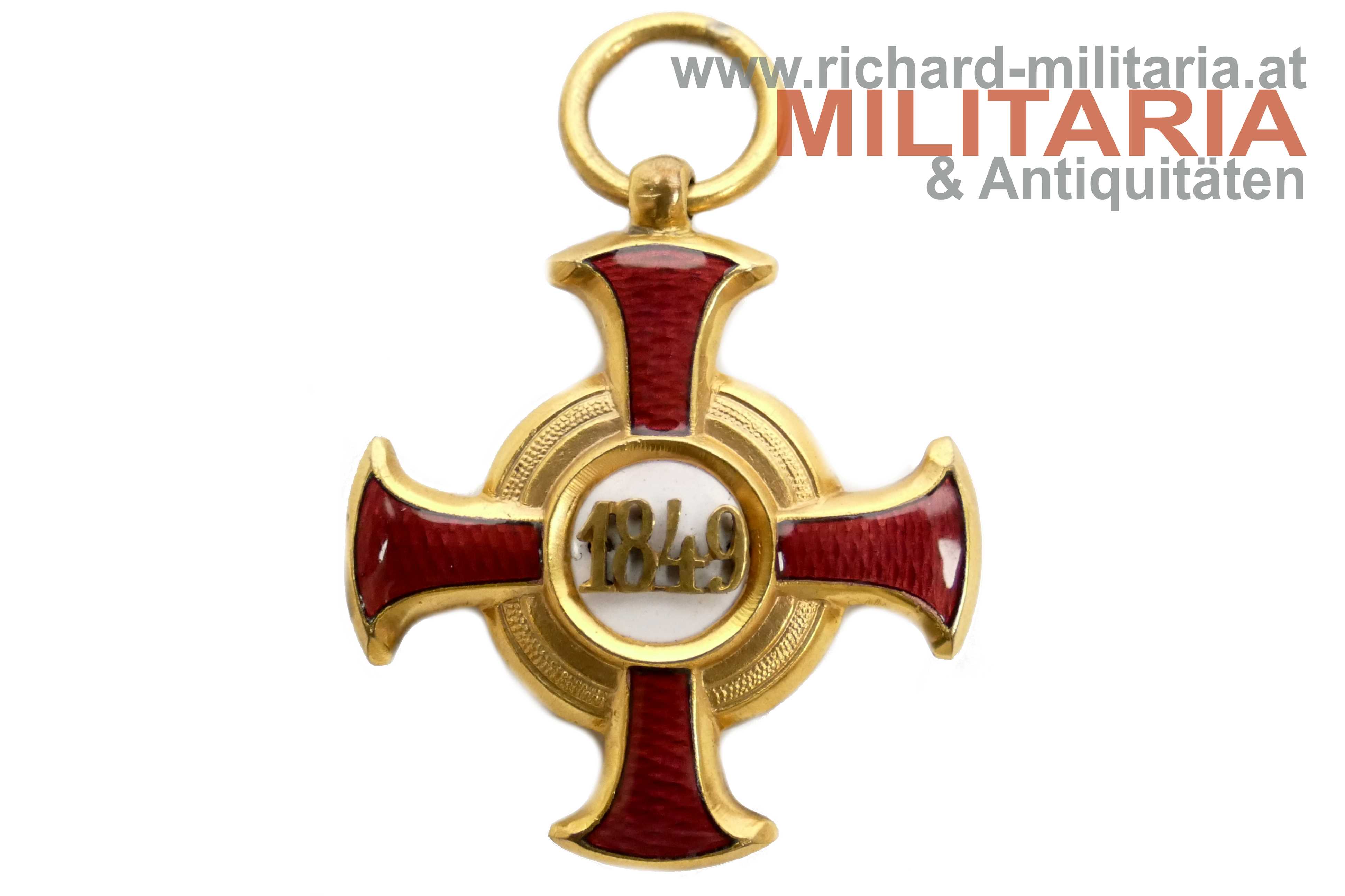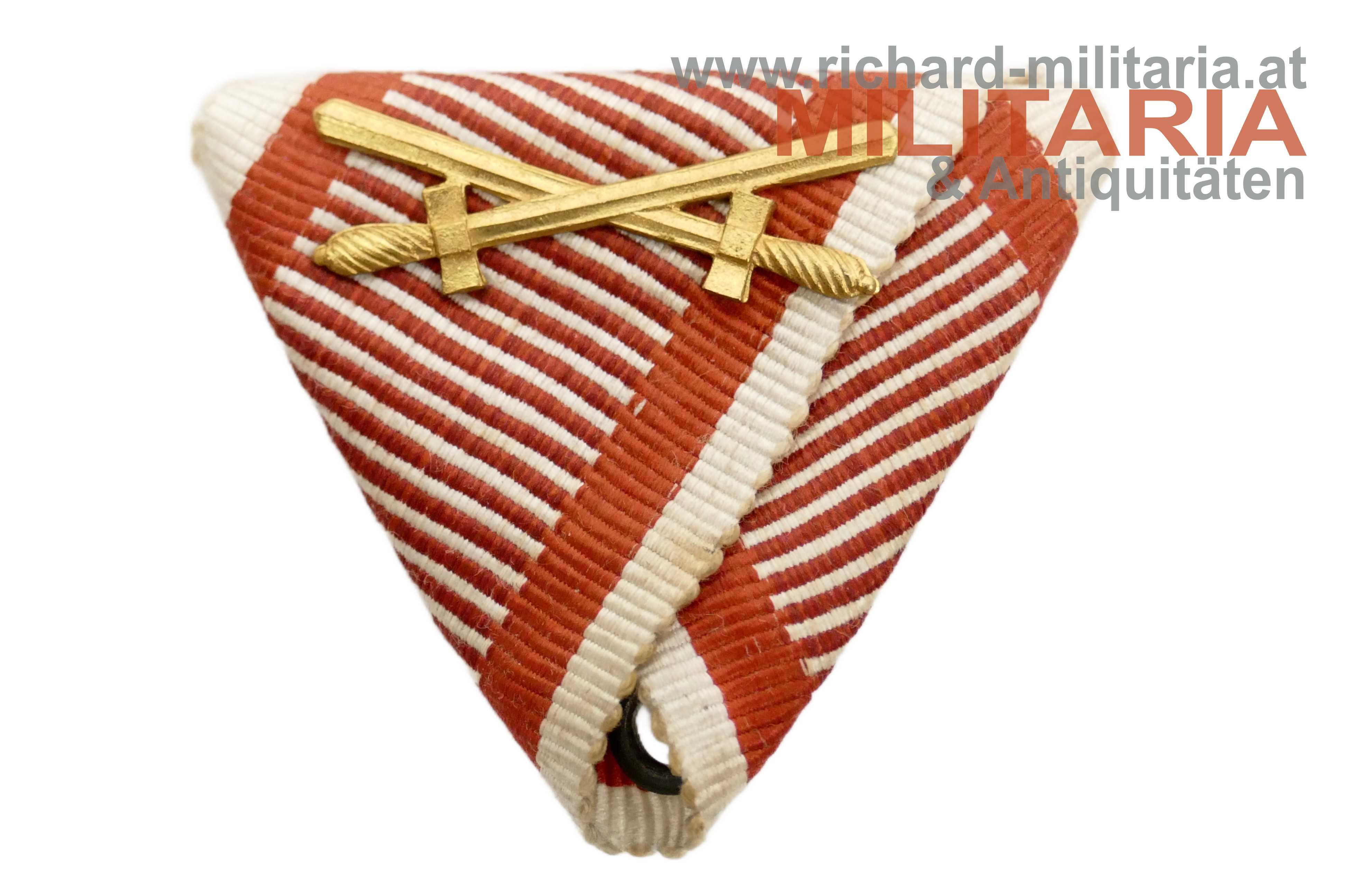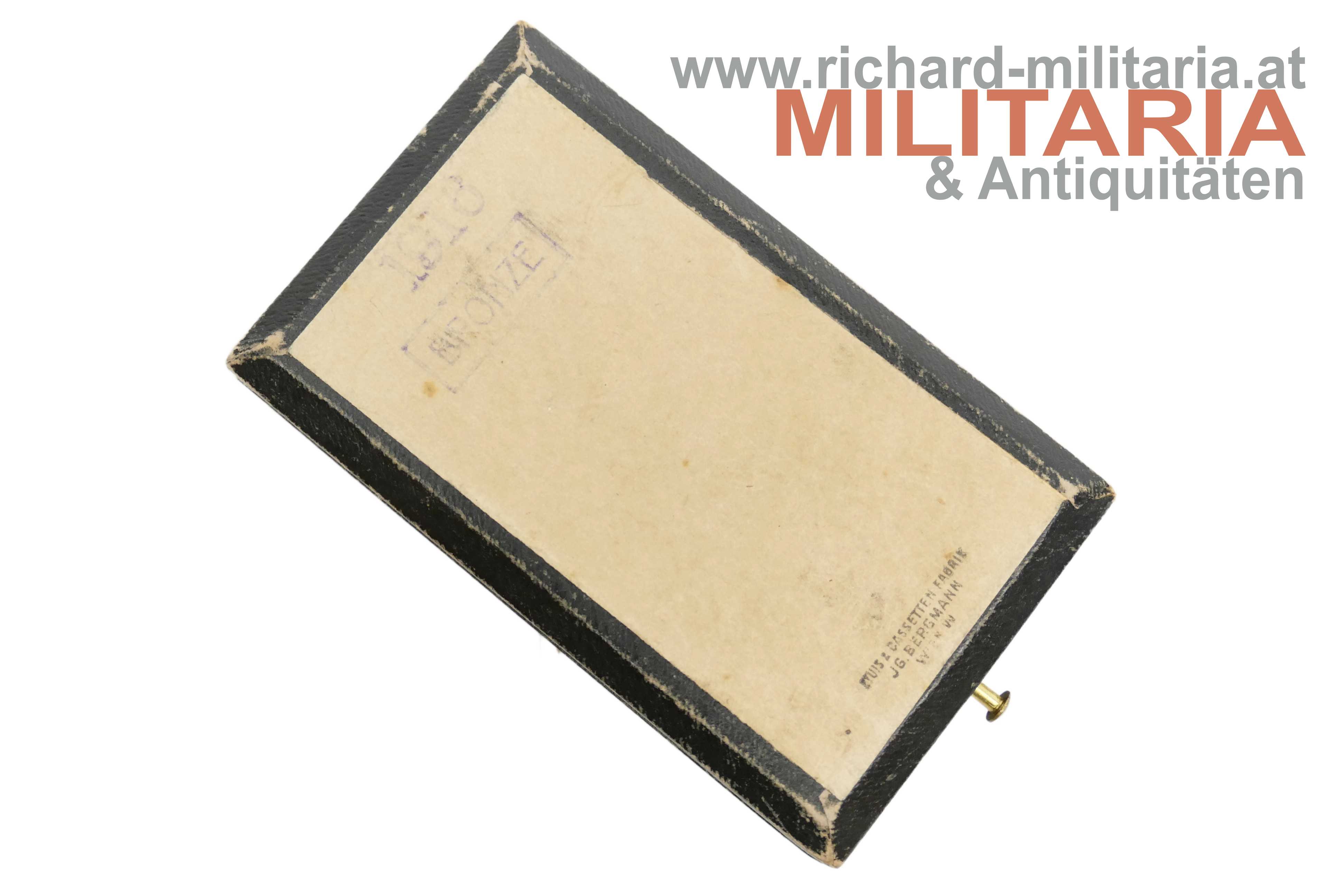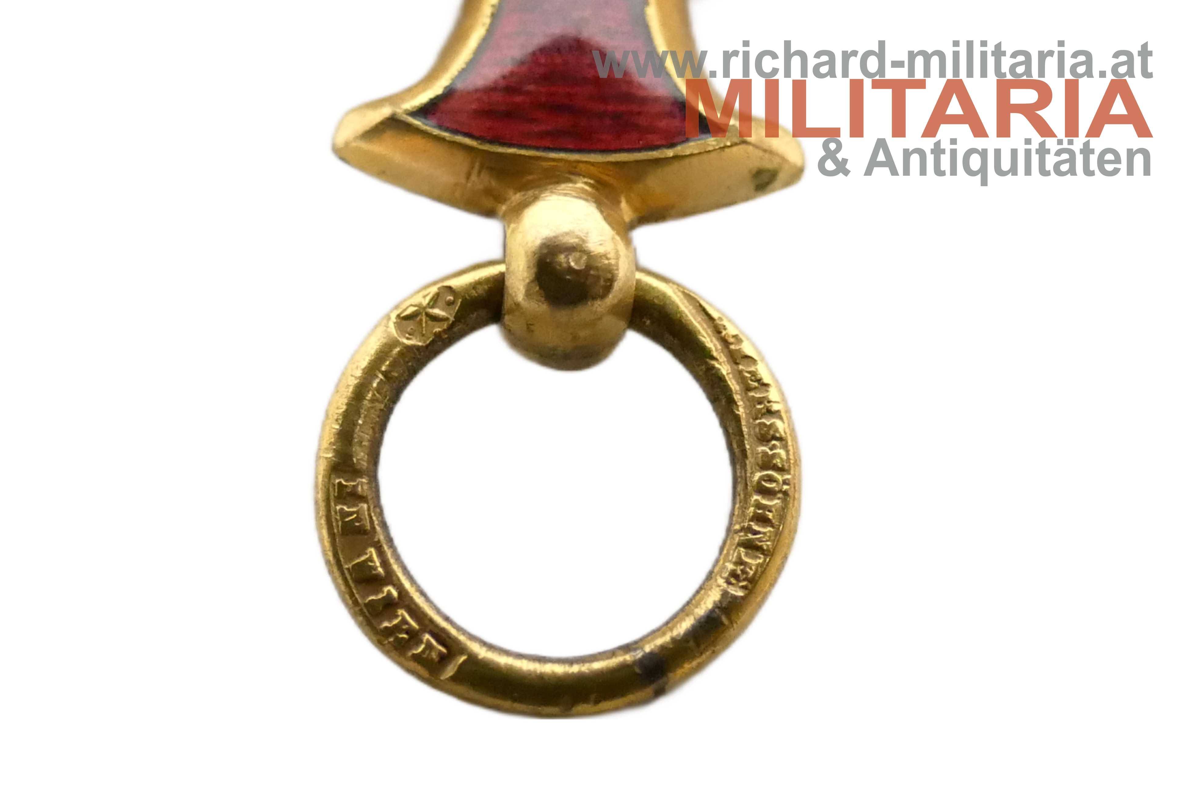 k.u.k. Goldenes Verdienstkreuz mit Schwertern im Etui; Bronze vergoldet; am Bandring "V. Mayers Söhne", "In Wien" und Sternpunzierung am Bandring; Emaillierung einwandfrei; Schwerter auf originalem Band aufgesplintet; Etui mit goldener Deckelprägung; Etui am Bonden mit "1916" und "Bronze" gestempelt; Etui mit altersüblichen Abnutzungsspuren;