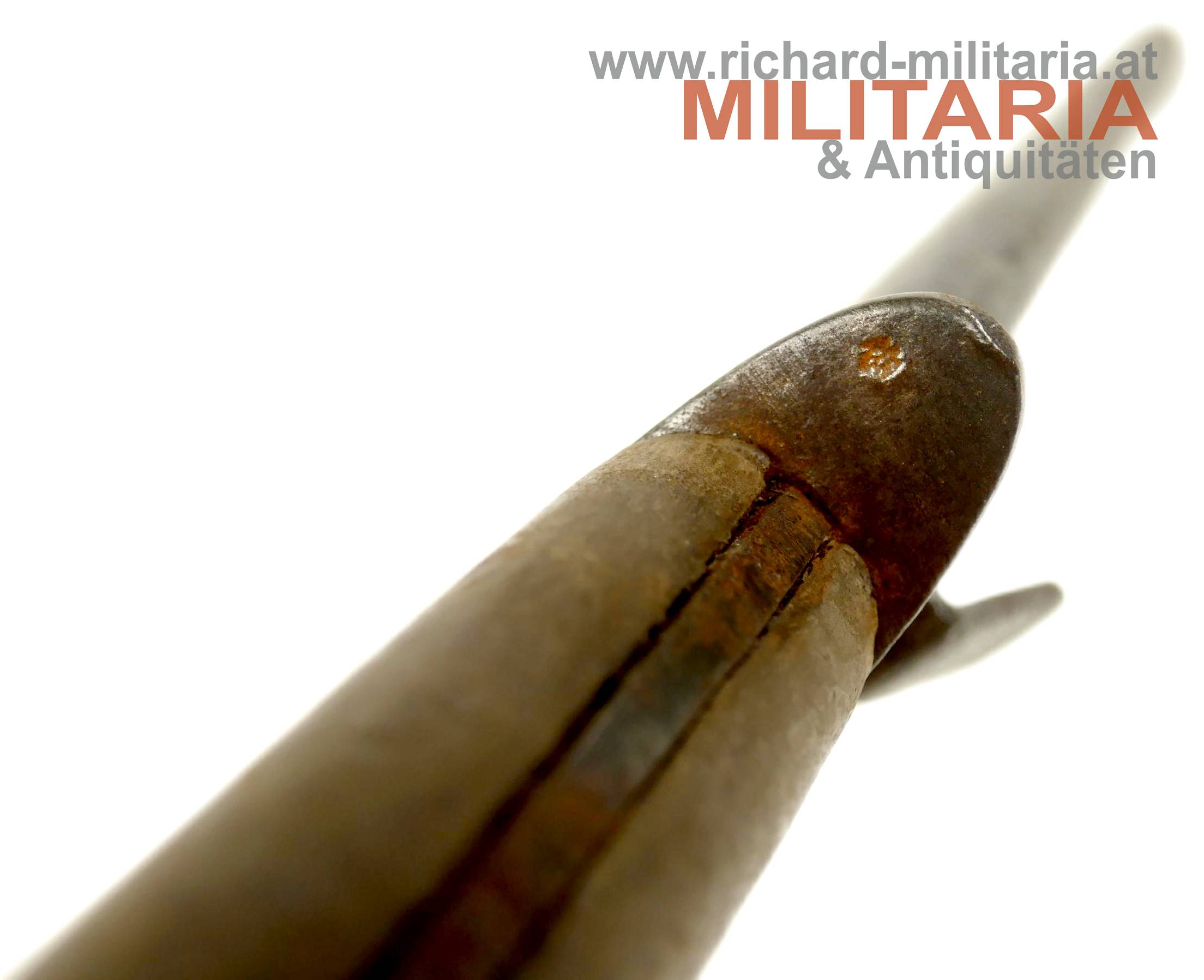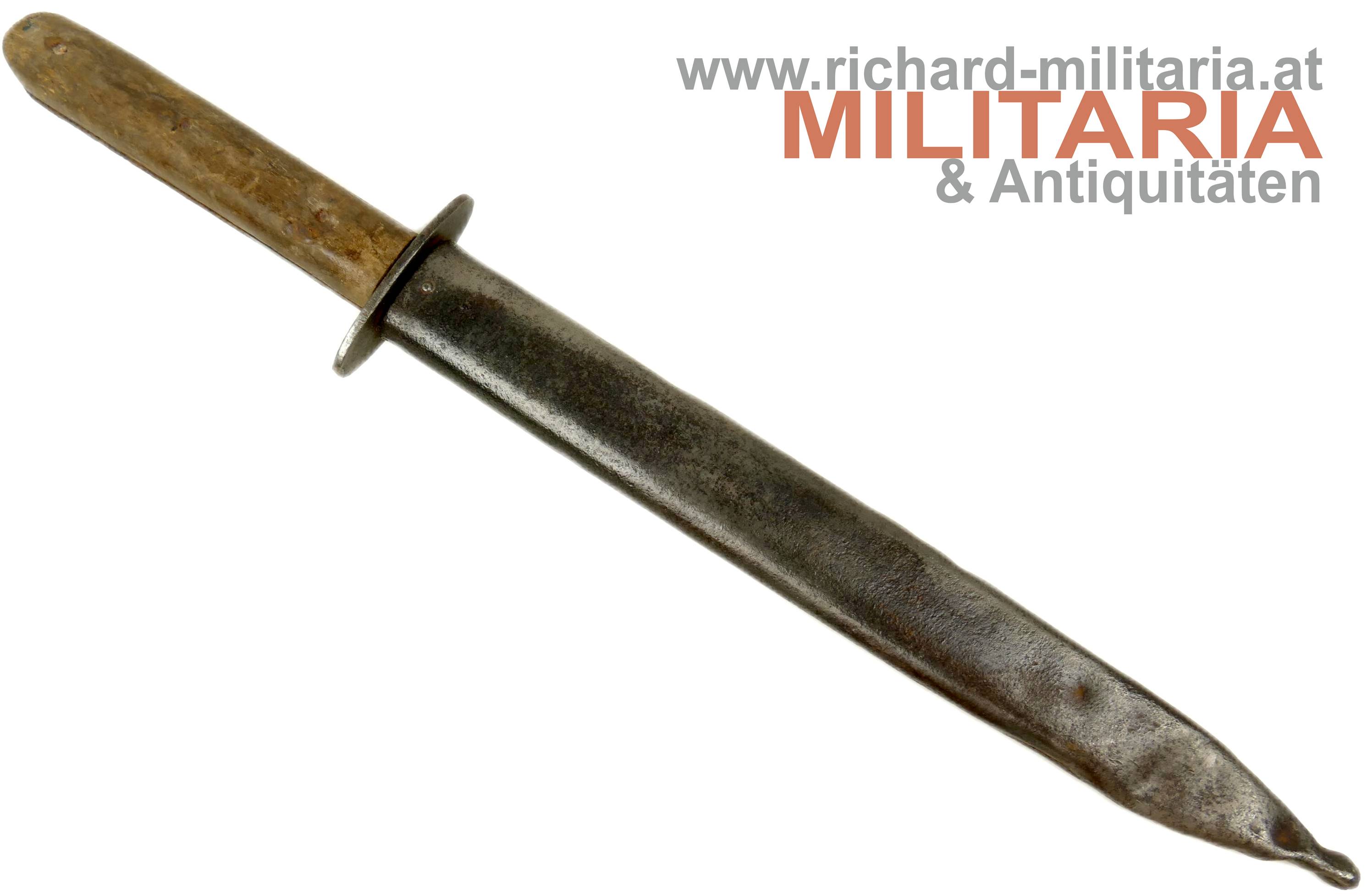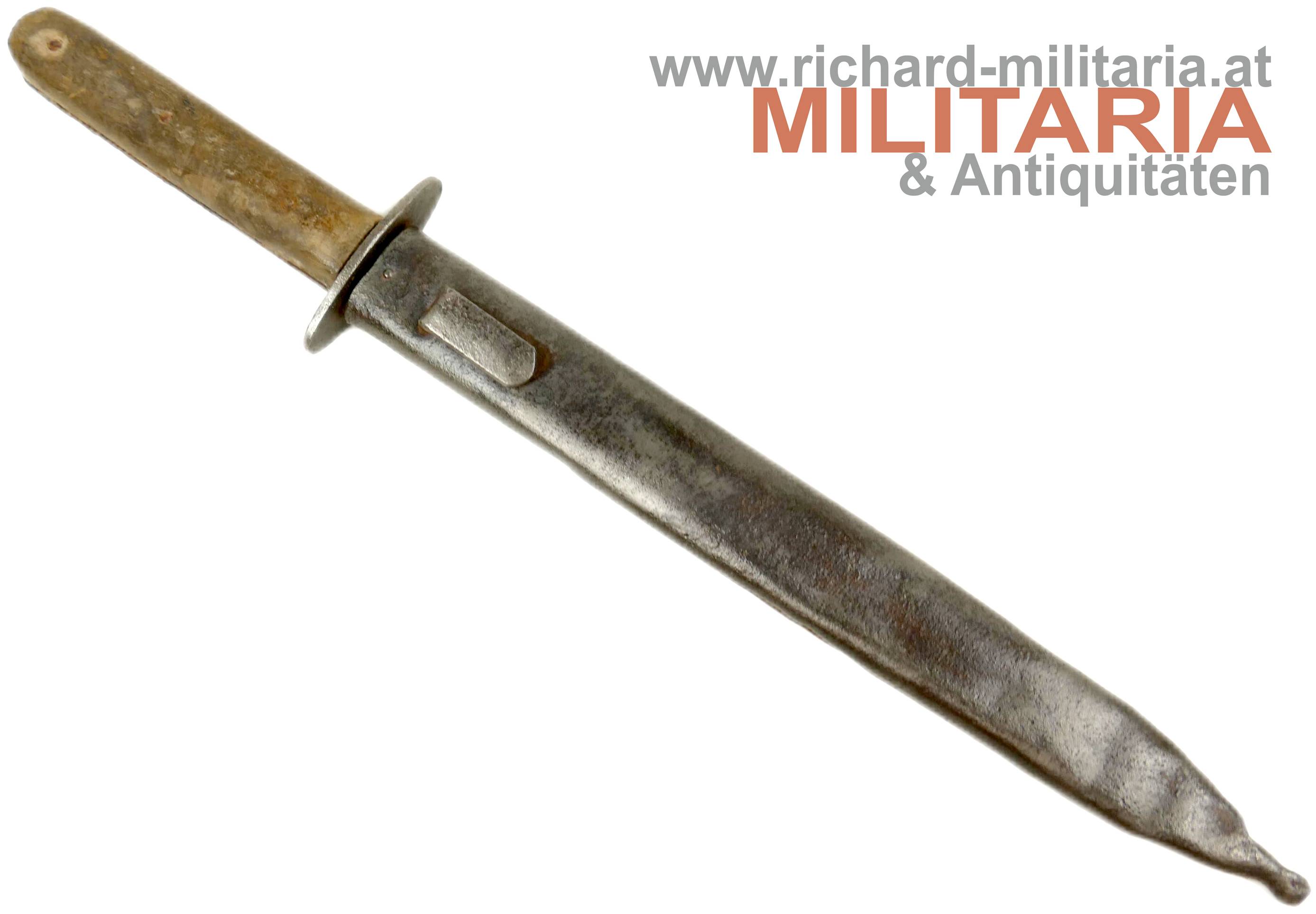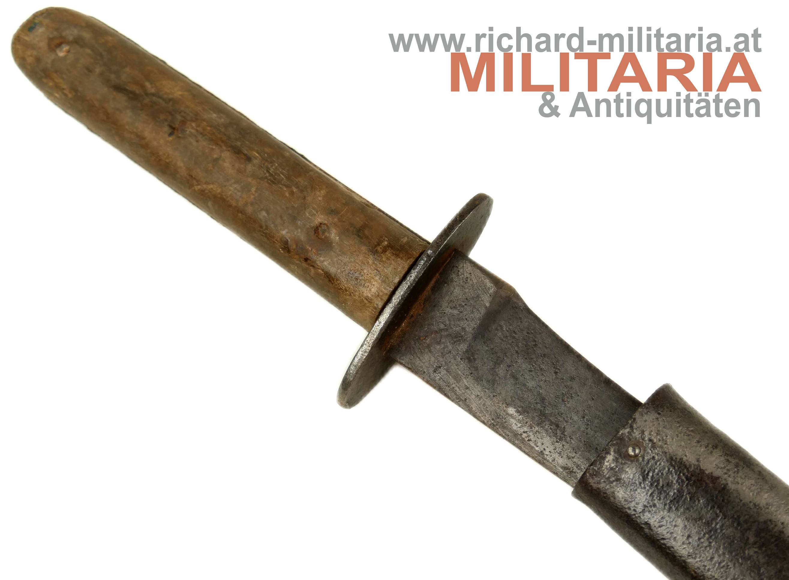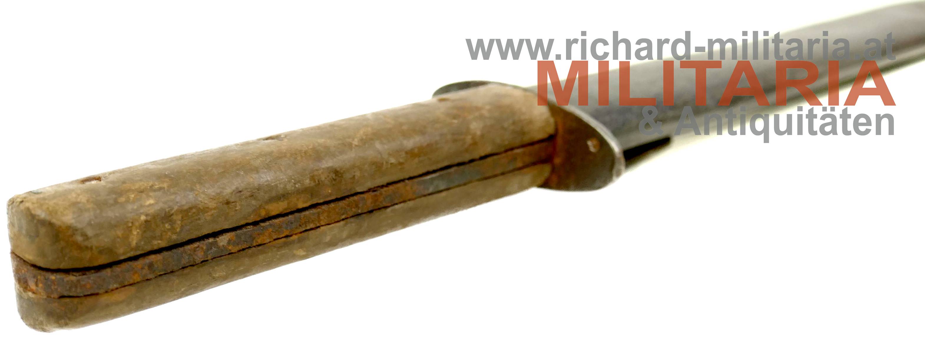 k.u.k. Grabendolch M17; dunkelbraune Holzgriffschalen - 3fach vernietet - Metallteil am Griff stark rostig; ovale Parierstange mit k.u.k. Armeeabnahme (leicht narbig); stark beschliffene Klinge - kein Hersteller mehr erkennbar; als Scheide dient eine M95 Bajonettscheide - Tragehaken wackelig; gereinigt/narbig und verbeult;
