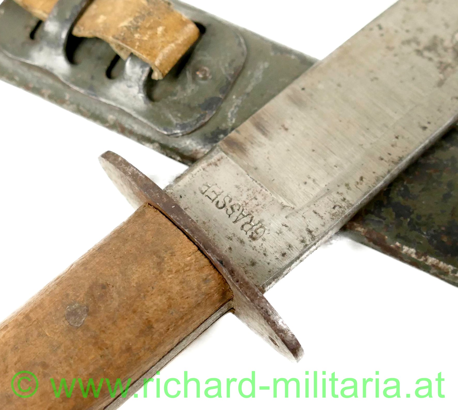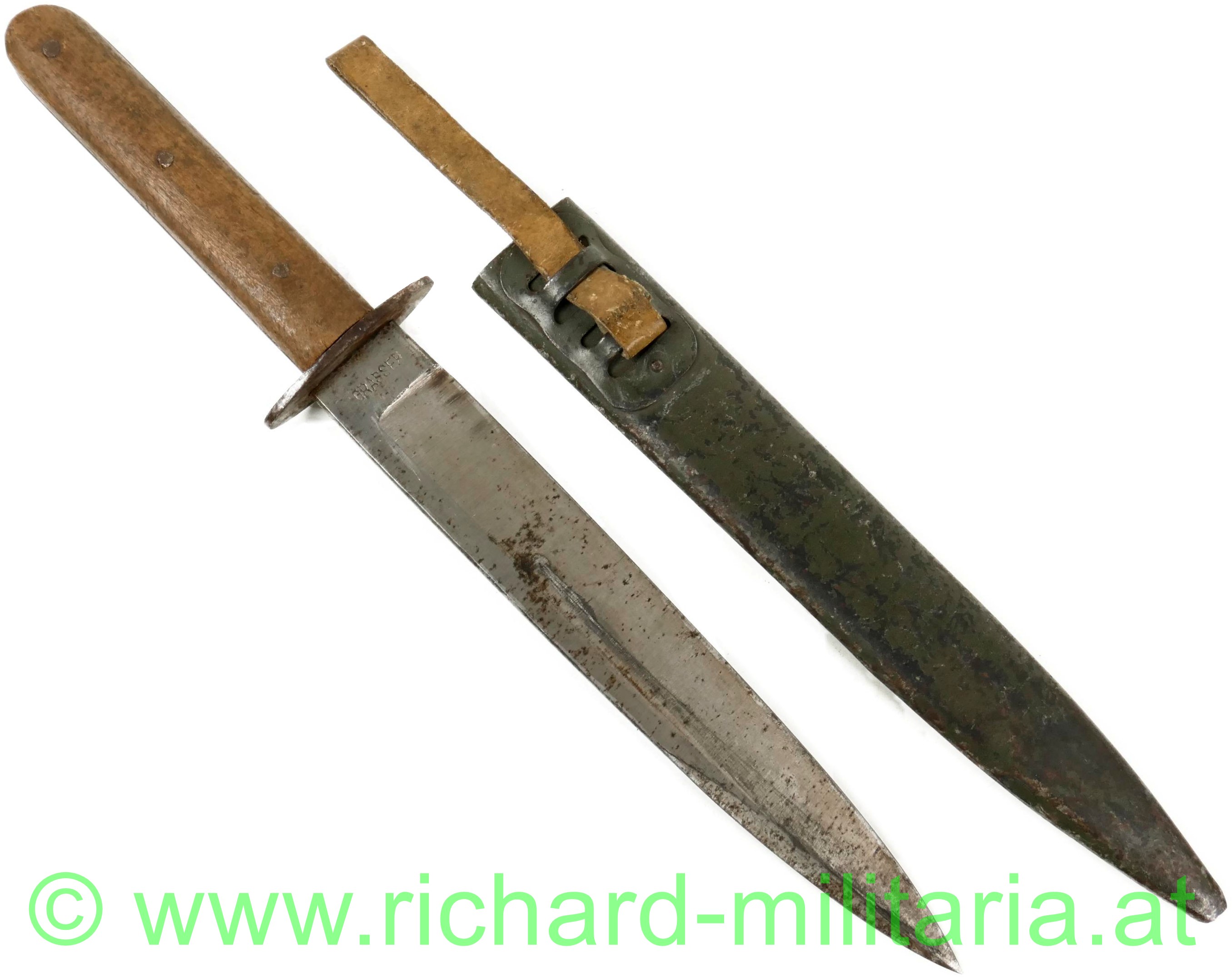 k.u.k. Grabendolch M17 des extrem seltenen Herstellers GRASSER; dunkelbraune Holzgriffschalen - 3-fach vernietet; ovale Parierstange mit k.u.k. Armeeabnahme; schöne unbeschliffene Klinge - fleckig - mit Hersteller "GRASSER"; Scheide Typ A mit Halterung Typ 4 und originaler weißer Ledertragelasche; 90% originale feldgraue Lackierung (!);