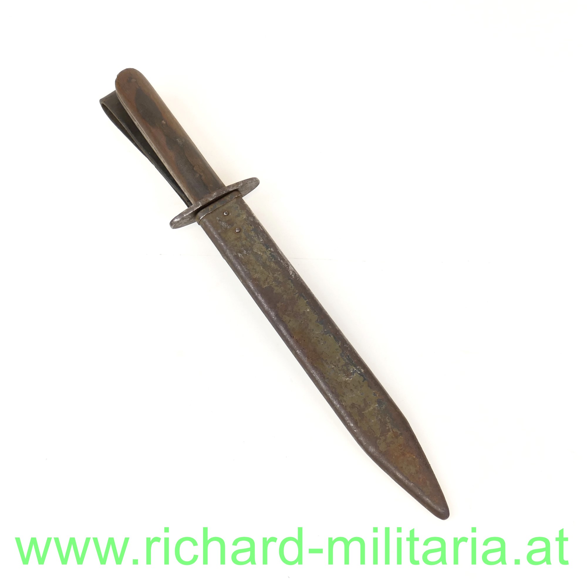 k.u.k. Grabendolch M17; Hersteller: Wlaszlovits / Stocsz; Klinge sehr scharf und fleckig, Spitze etwas in Mitleidenschaft gezogen; auf der Parierstange befindet sich der Honved-Abnahmestempel; 3-fach vernietete Holzgriffschalen; Scheide Typ B/2; ergänzte breite Ledertrageschlaufe - diese offen; original grün lackierte Stahlscheide - an den Lackfehlstellen rostig - verbesserungsfähig;