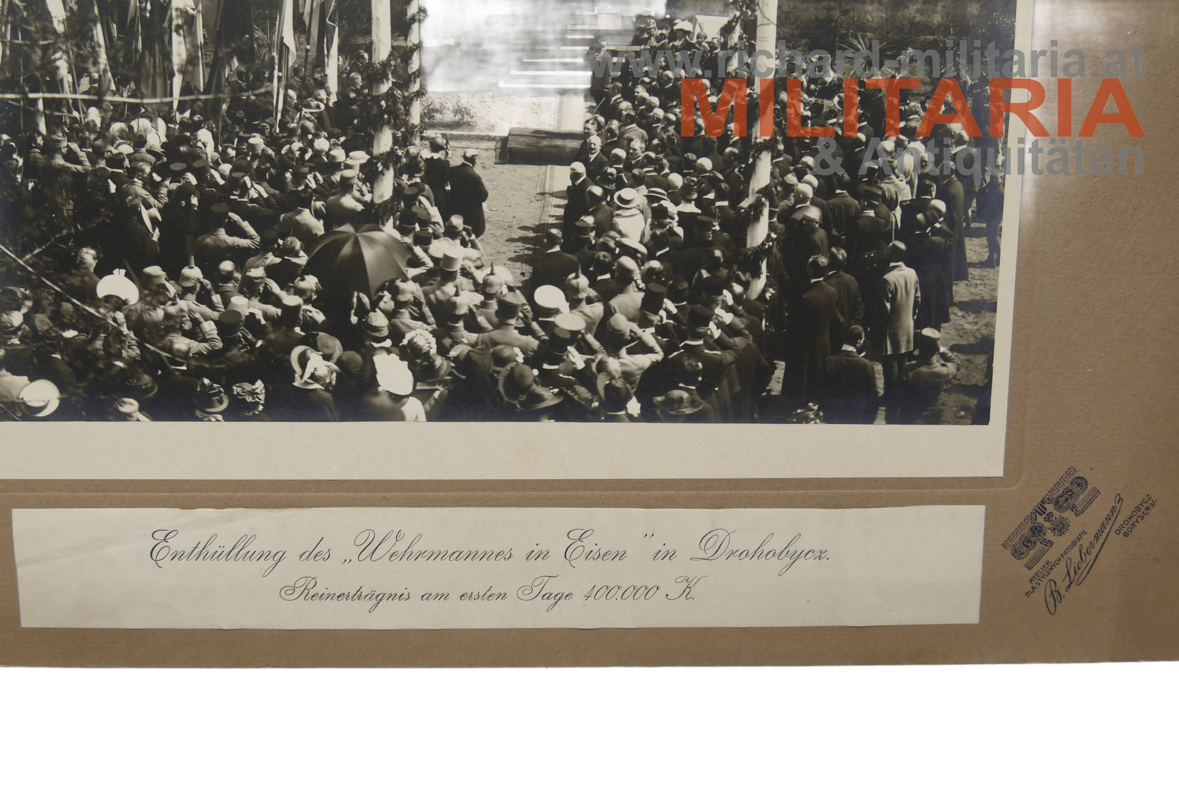 k.u.k. Hartkartonfoto - "Enthüllung des Wehrmannes in Eisen in Drohobycz - Reinerträgnis am ersten Tage 400.000 K."; großformatiges Bild aufgeklebt auf eine Hartkartonplatte; diese mit Herstellerprägung "B. Liebermann";