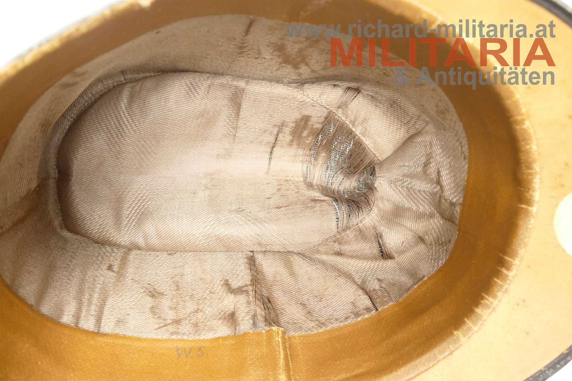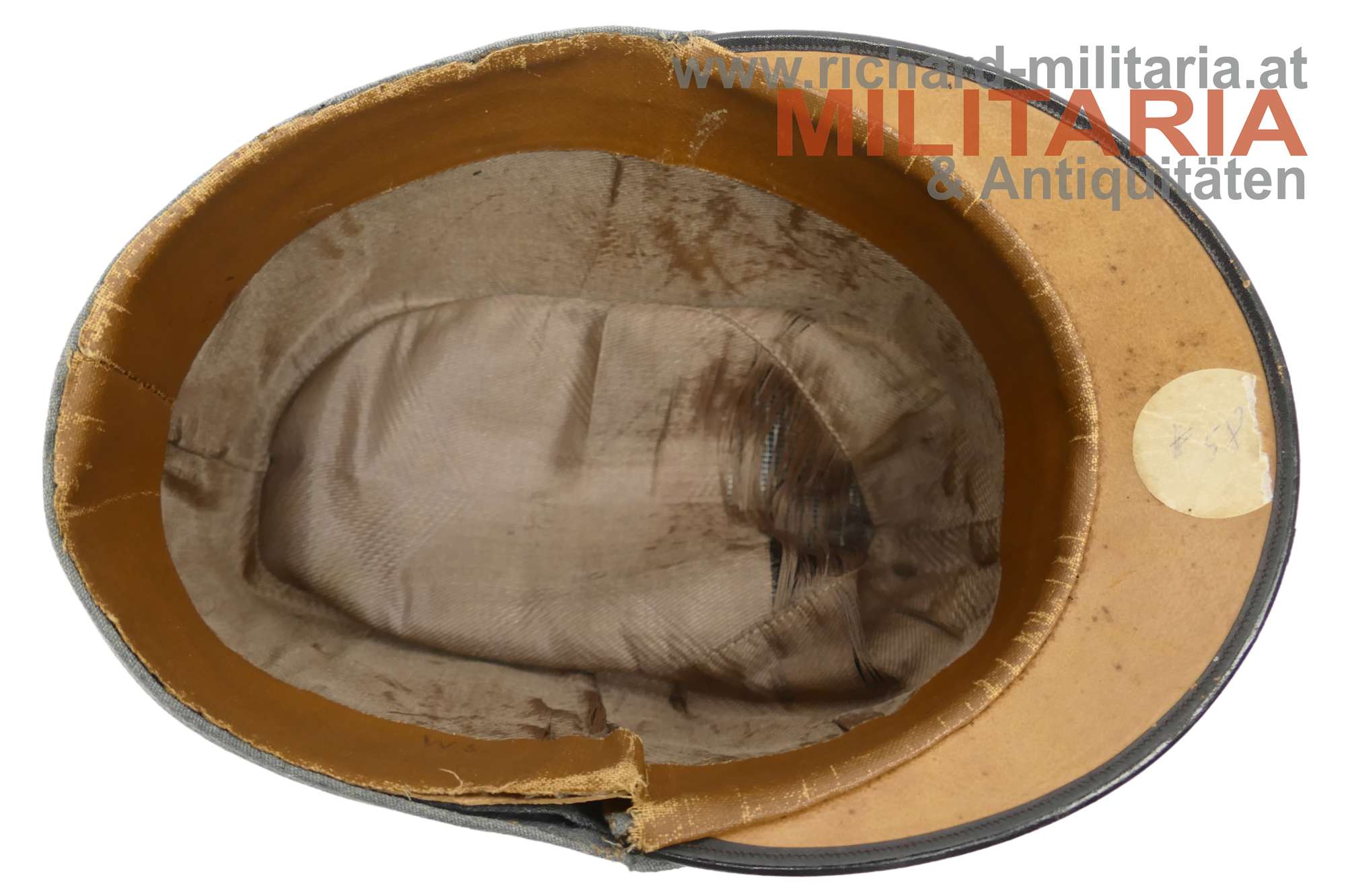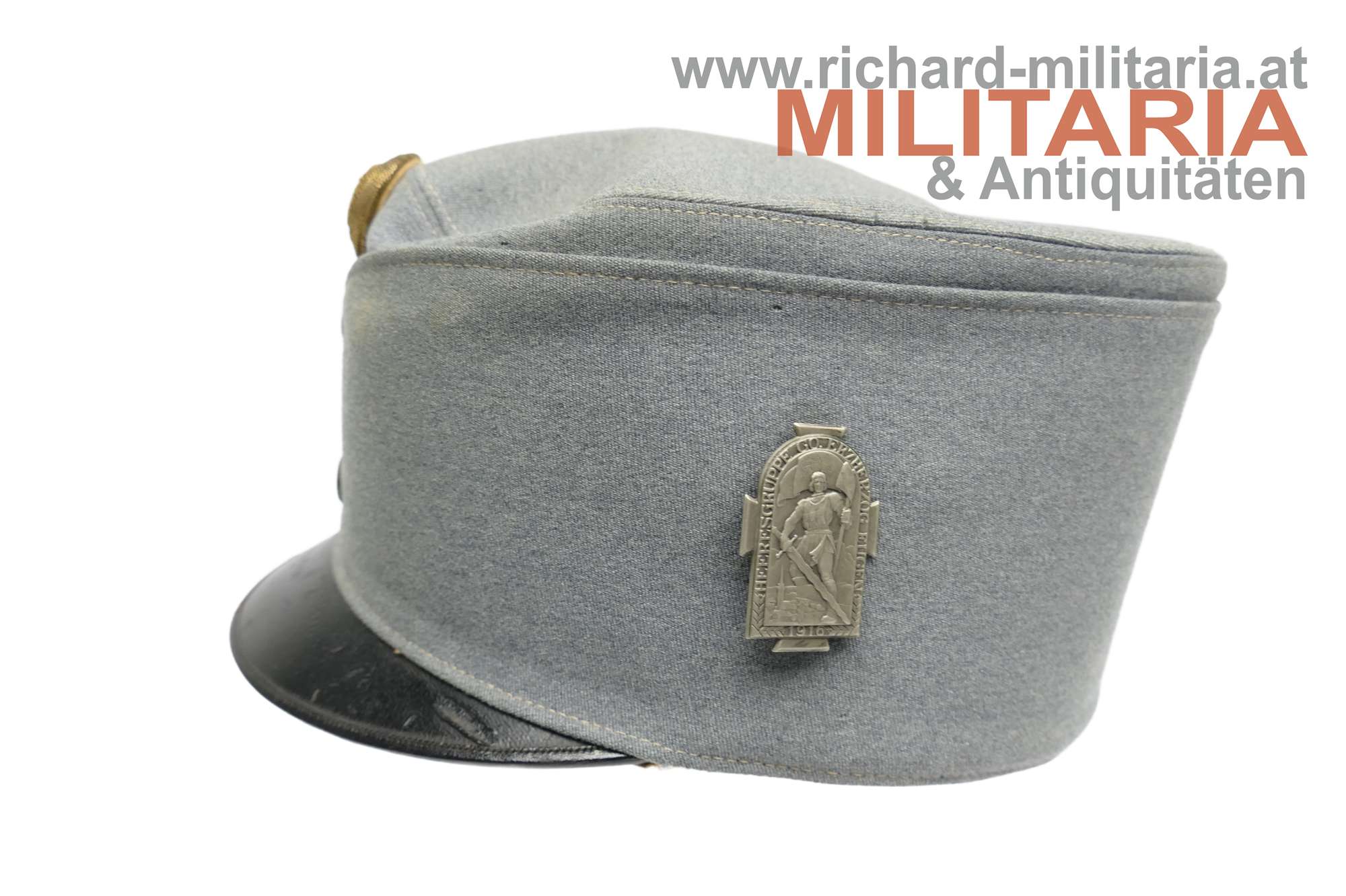 k.u.k. hechtgraue Feldkappe für Offiziere der Artillerie; hechtgrauer feiner Stoff; vorne mittig zwei Artillerie-Knöpfe und darüber die Offizierskokarde mit dem Allerhöchsten Namenszug "FJ1"; auf der linken Seite das Kappenabzeichen Heeresgruppe Erzherzog Eugen aus Weißmetall; schwarzer Lackleder-Kappenschirm; braunes Stirnleder; innen der Seidenstoff zerschlissen; nicht ganz formstabil (rechte Seite); kleinere Mottenschäden auf der Außenseite;