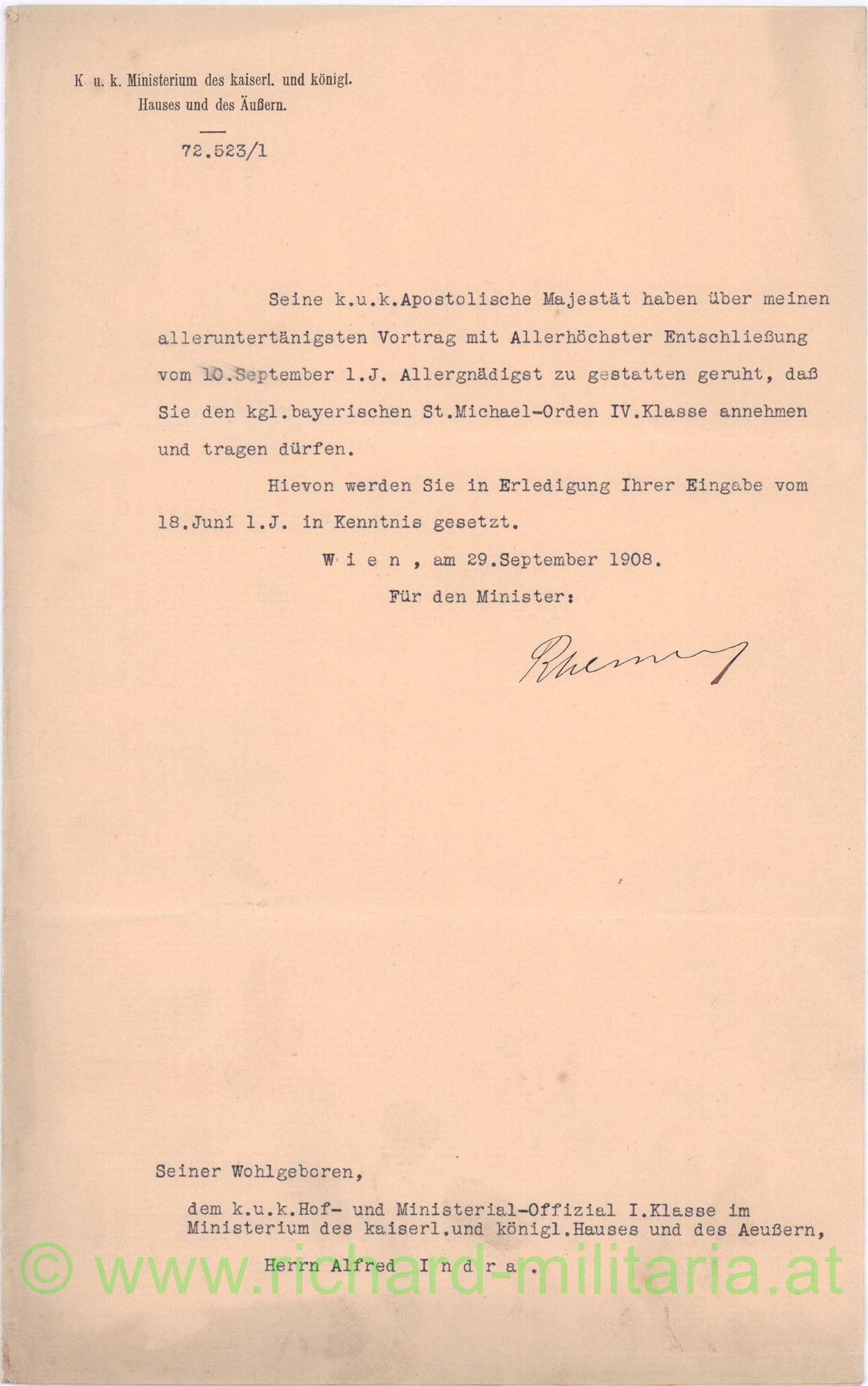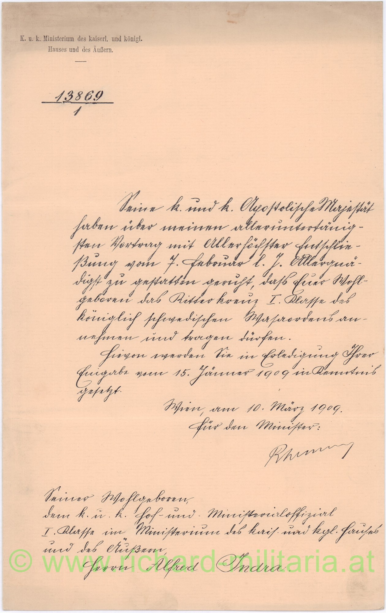 Urkundennachlass des k.u.k. Hof- und Ministerialoffizial I. Classe Alfred Indra beim Ministerium des kaiserl. und königl. Hauses und des Äußeren - bestehend aus