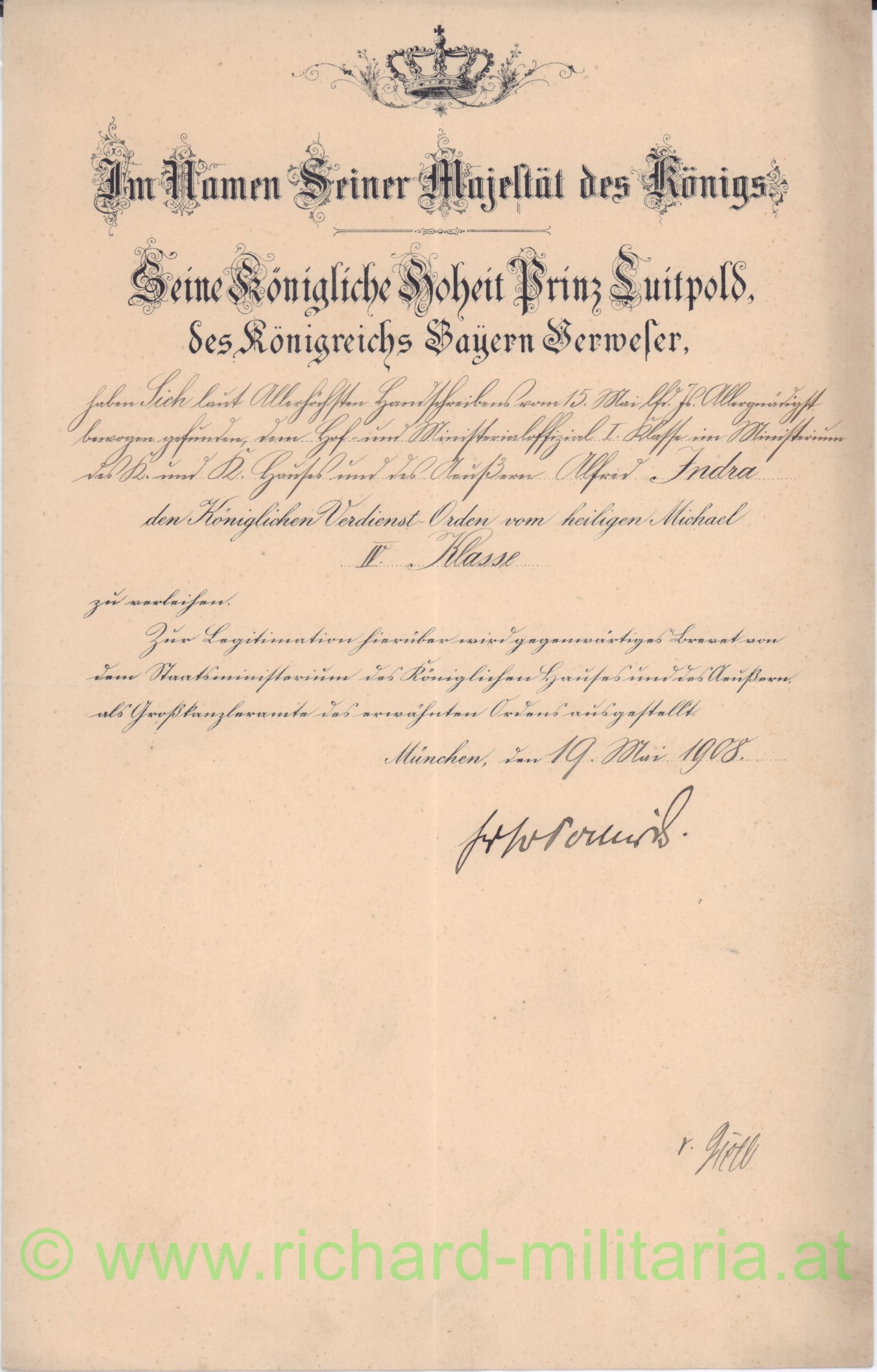 - 1908: Bayern: Verleihungsurkunde zum königl. Verdienst-Orden vom heiligen Michael IV. Klasse