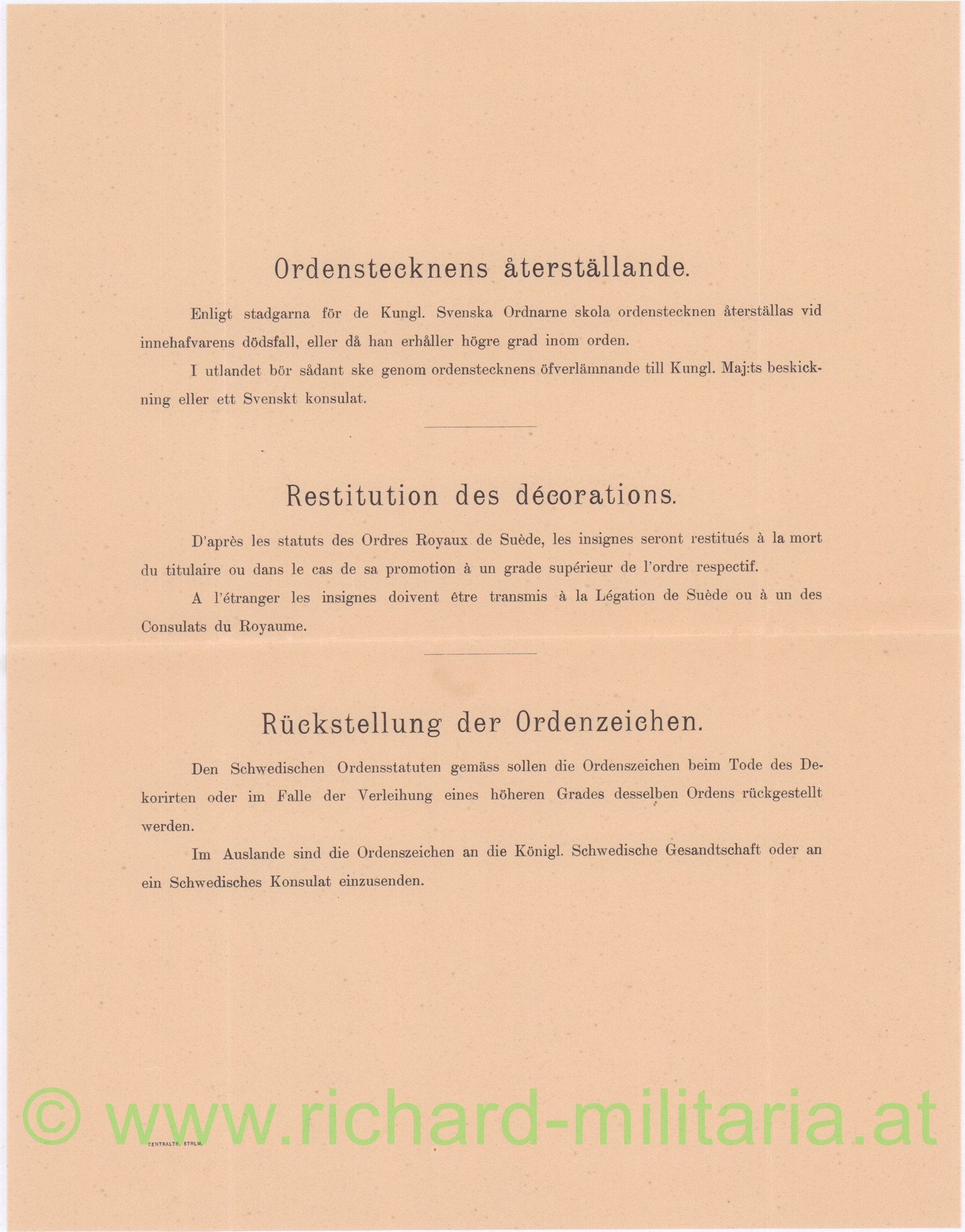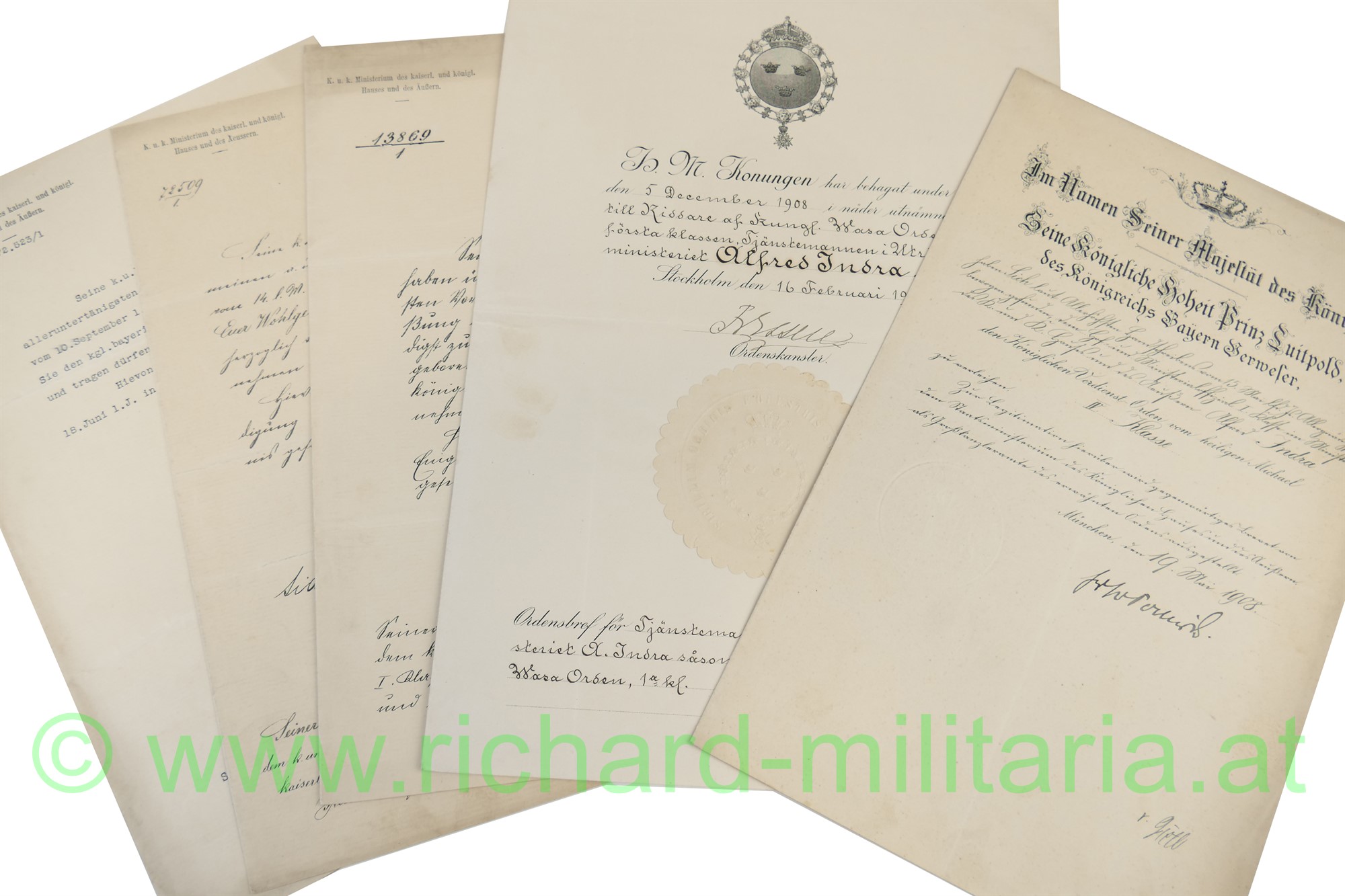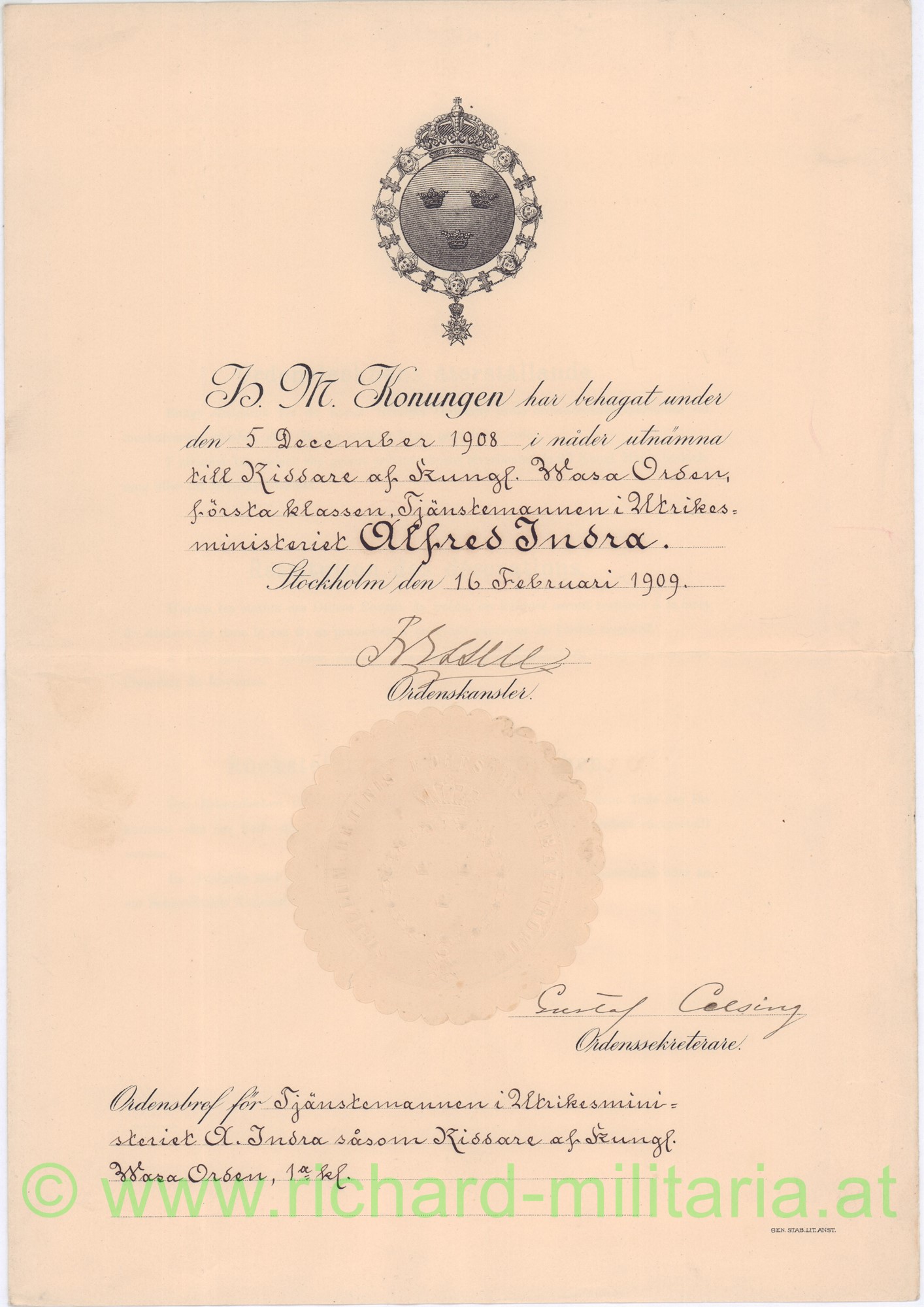 - 1909: Schweden: Verleihungsurkunde zum königl. Wasa-Orden 1. Klasse