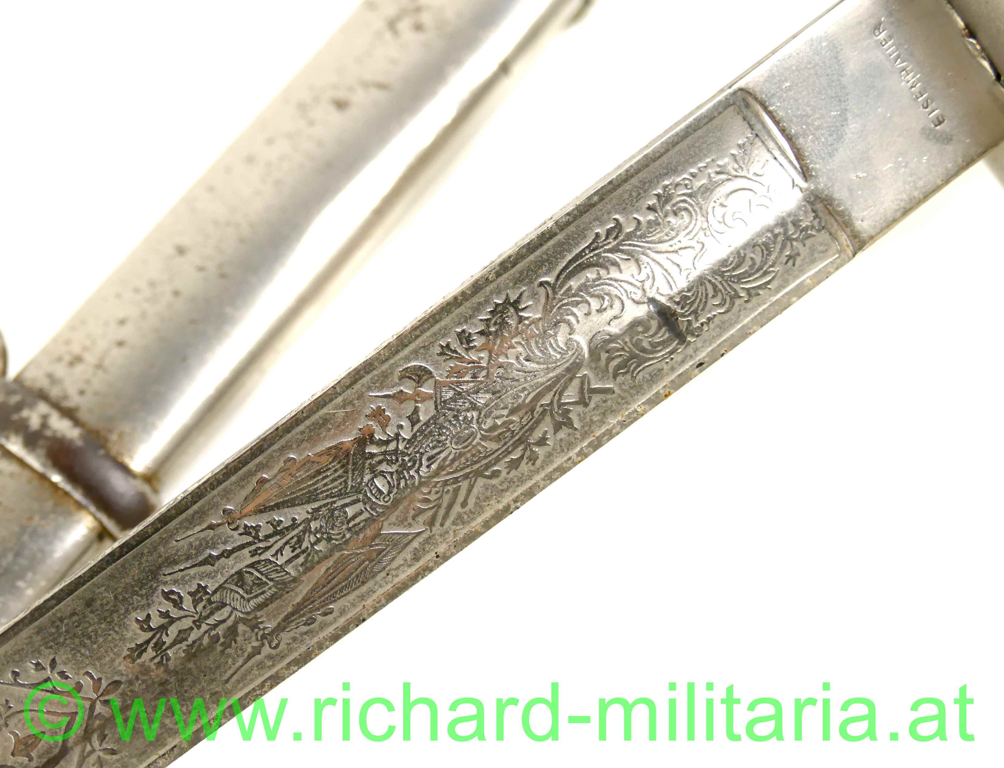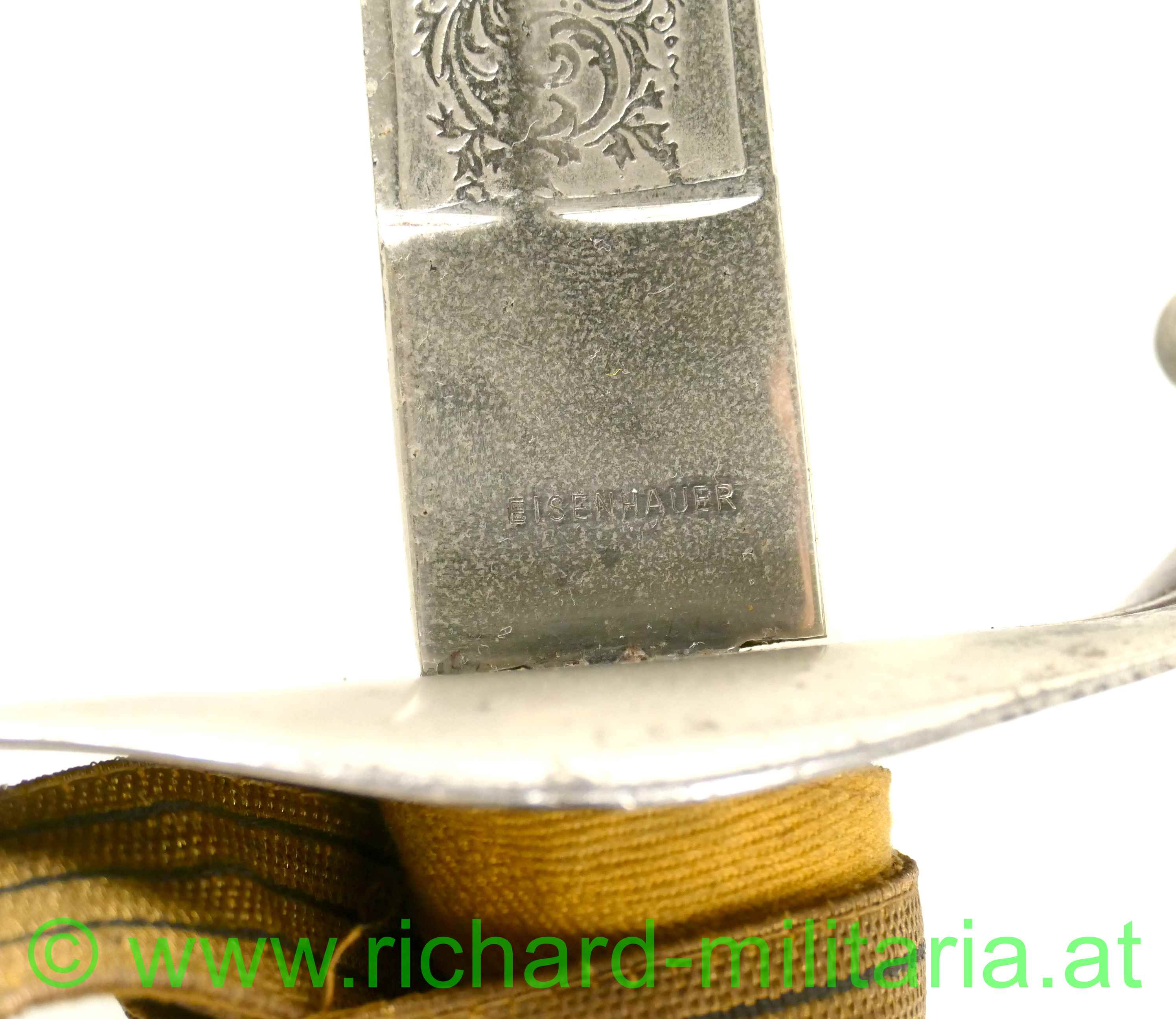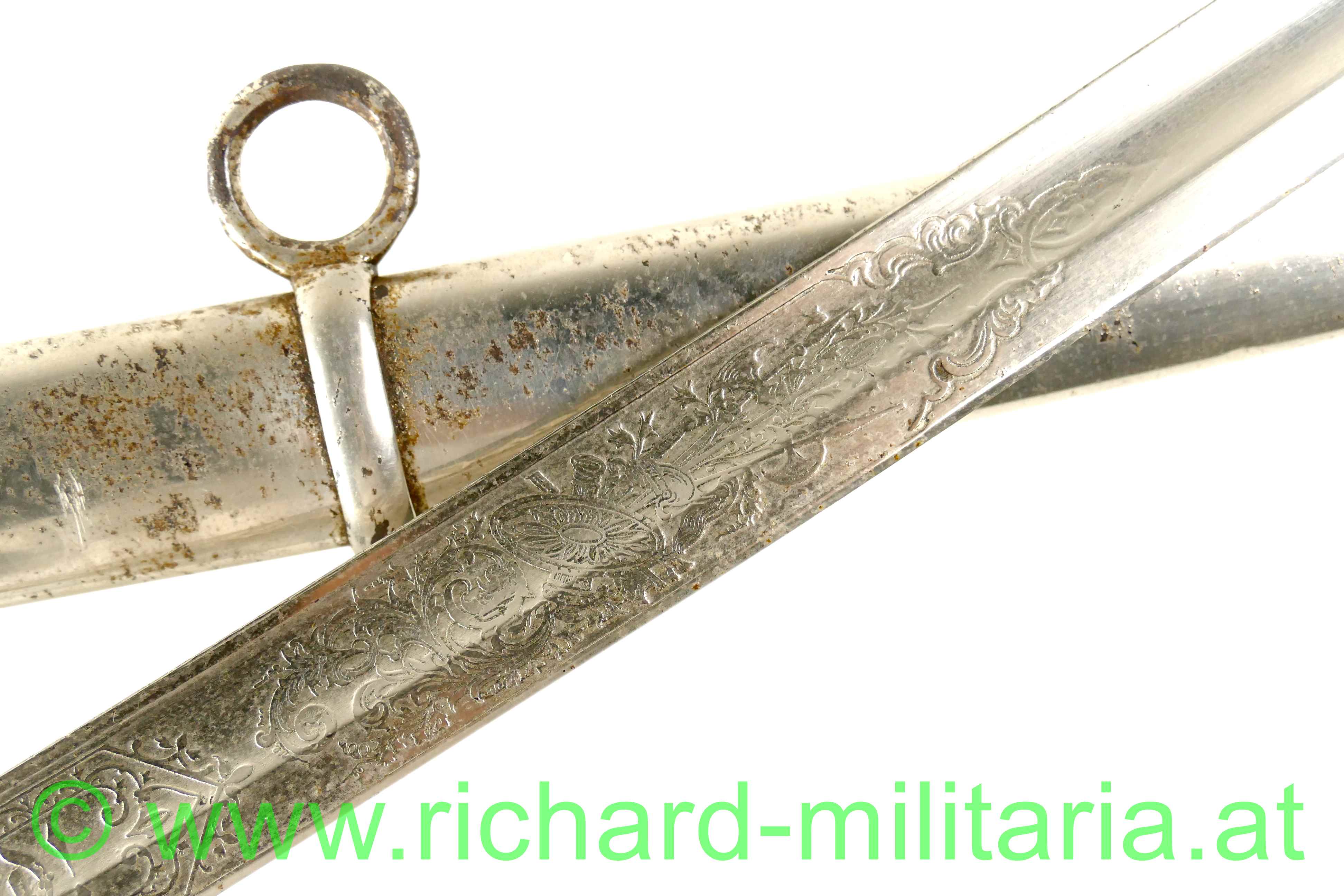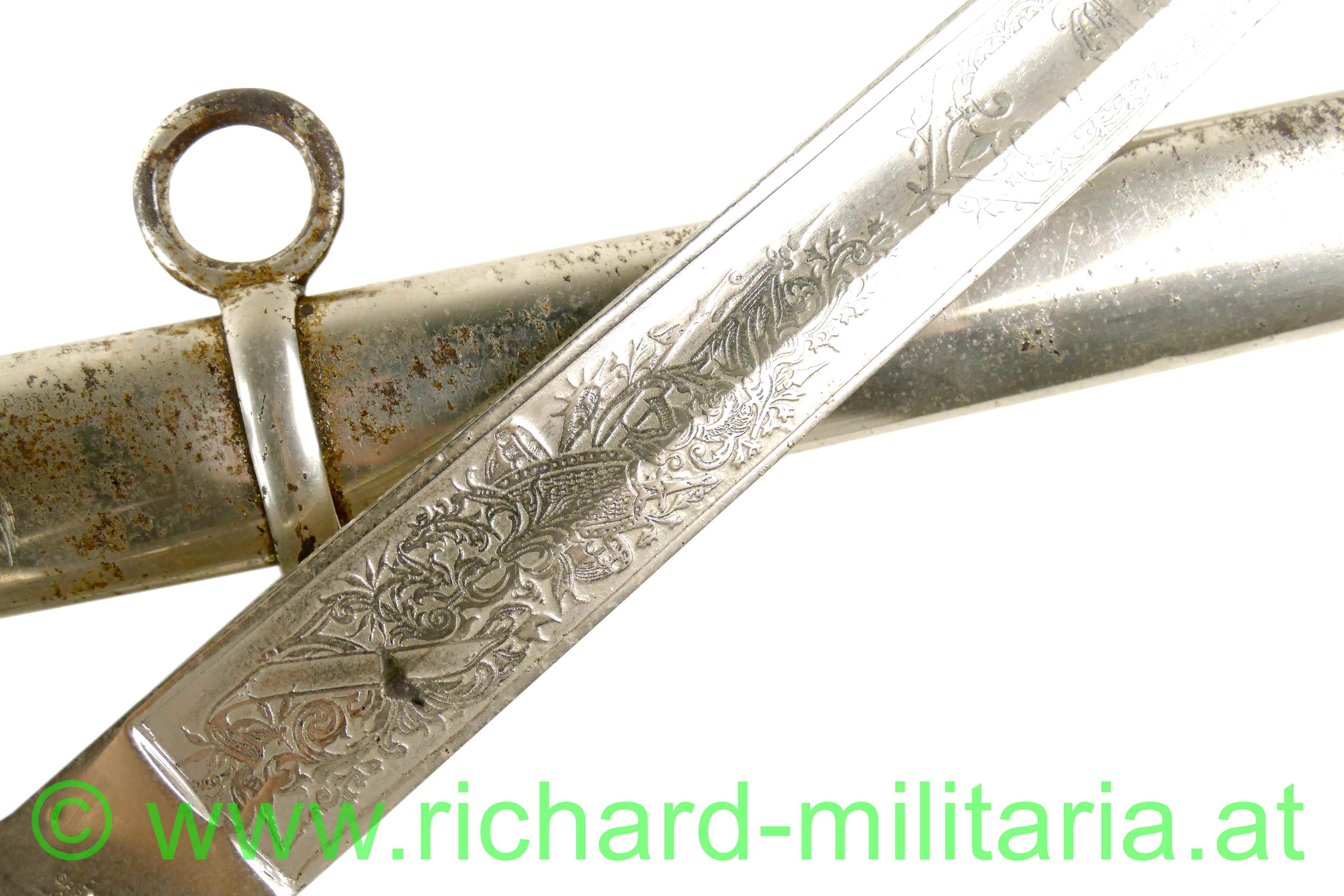 k.u.k. Infanterie Offizierssäbel M.1861 als Ausmusterungssäbel der Thersianischen Militärakademie Wr. Neustadt; schöne vernickelte, beidseitig gekehlte und geätzte Klinge mit Hersteller " JV, garantiert Solingen - Eisenhauer" und "J. Zimbler, Wien" am Klingenrücken, feine Ätzung: "Treu bis in den Tod" bzw. "18. August 1900"; dazu florales Muster und Kriegstrophäen über fast die gesamte Länge der Kehlung; Griff mit feiner Rochenhaut und gedrillter Drahtwicklung; Griffkappe mit Monogramm versehen - angerostet, bis auf den Griff gut erhaltene Vernickelung, originale Scheide mit minimalem Rostansatz und kleineren Dellen; mit Offiziersportepee Kaiser Karl im guten Zustand;