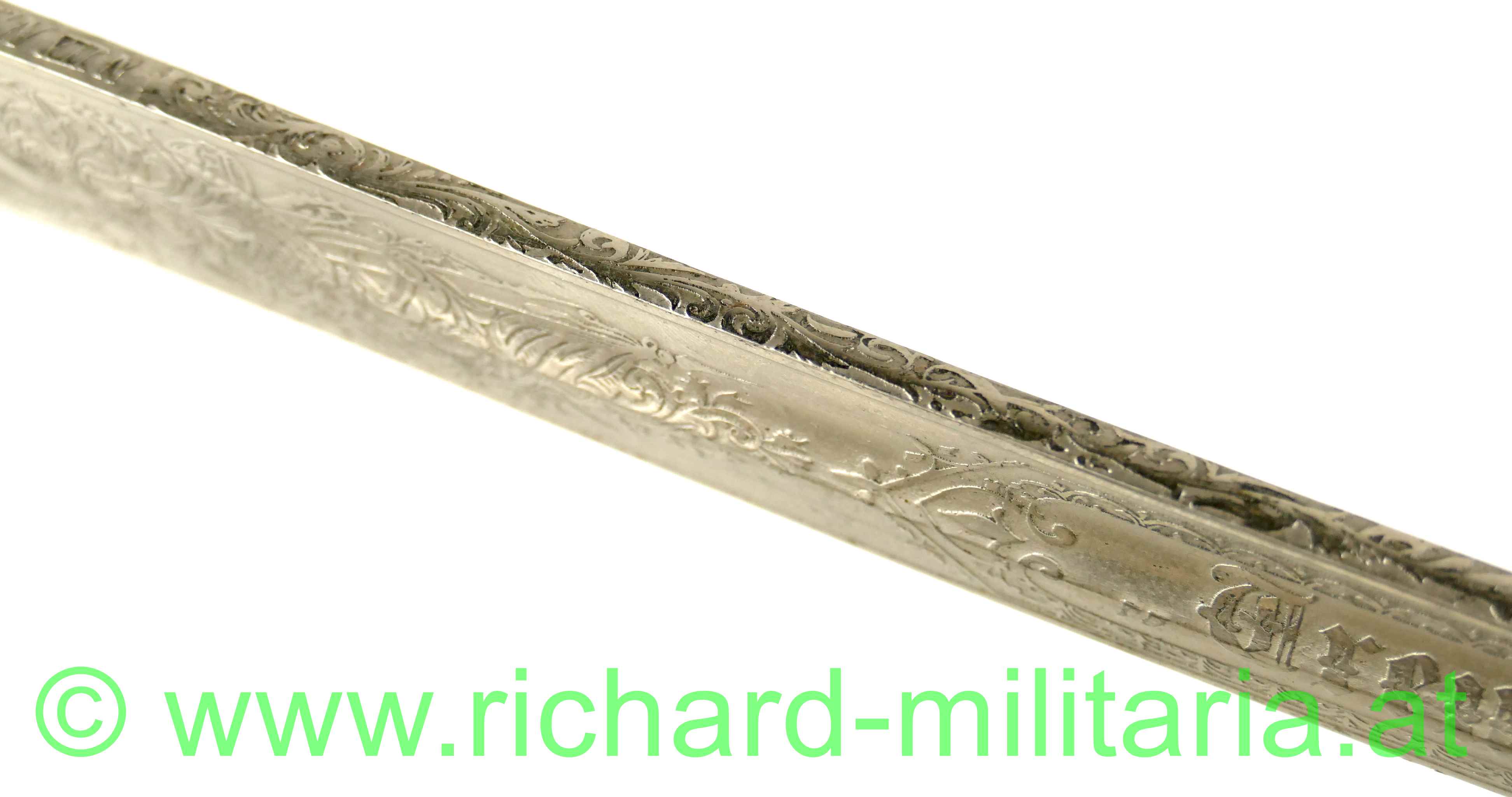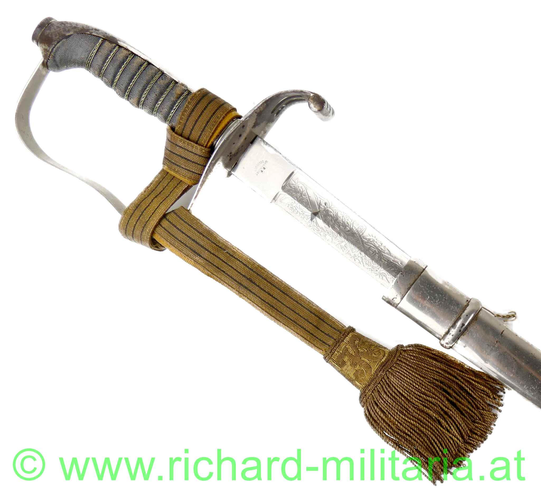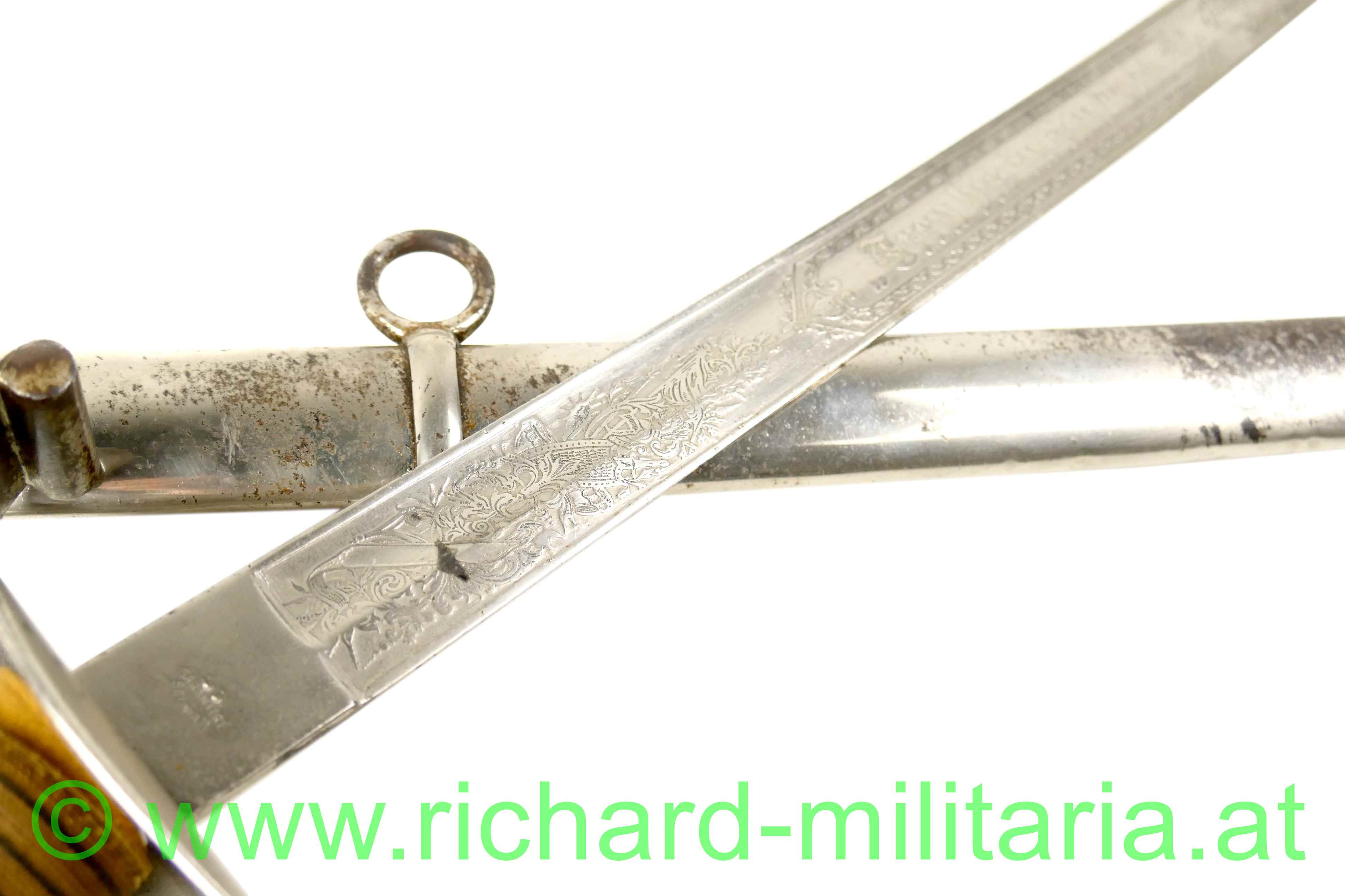 k.u.k. Infanterie Offizierssäbel M.1861 als Ausmusterungssäbel der Thersianischen Militärakademie Wr. Neustadt; schöne vernickelte, beidseitig gekehlte und geätzte Klinge mit Hersteller " JV, garantiert Solingen - Eisenhauer" und "J. Zimbler, Wien" am Klingenrücken, feine Ätzung: "Treu bis in den Tod" bzw. "18. August 1900"; dazu florales Muster und Kriegstrophäen über fast die gesamte Länge der Kehlung; Griff mit feiner Rochenhaut und gedrillter Drahtwicklung; Griffkappe mit Monogramm versehen - angerostet, bis auf den Griff gut erhaltene Vernickelung, originale Scheide mit minimalem Rostansatz und kleineren Dellen; mit Offiziersportepee Kaiser Karl im guten Zustand;