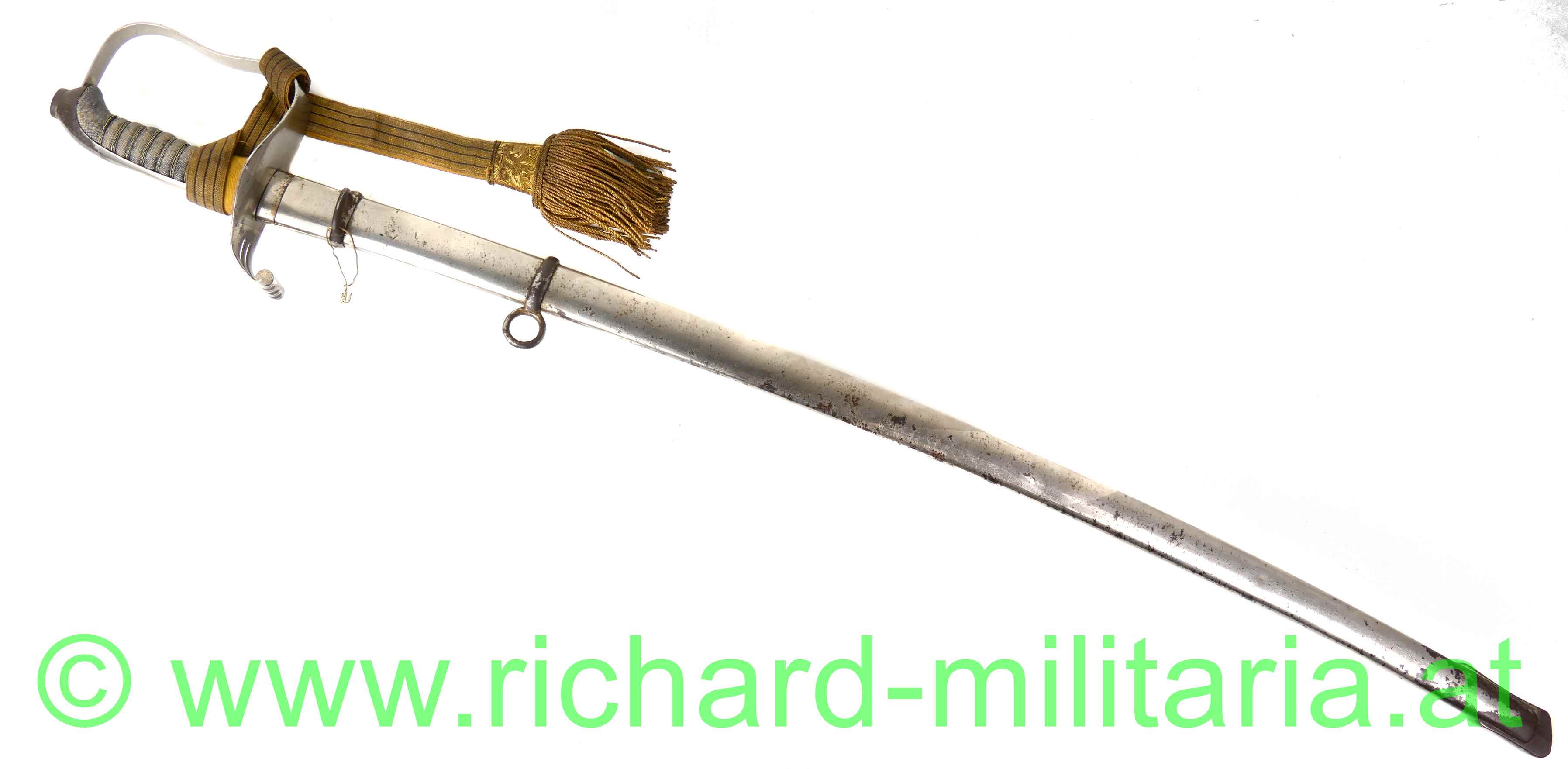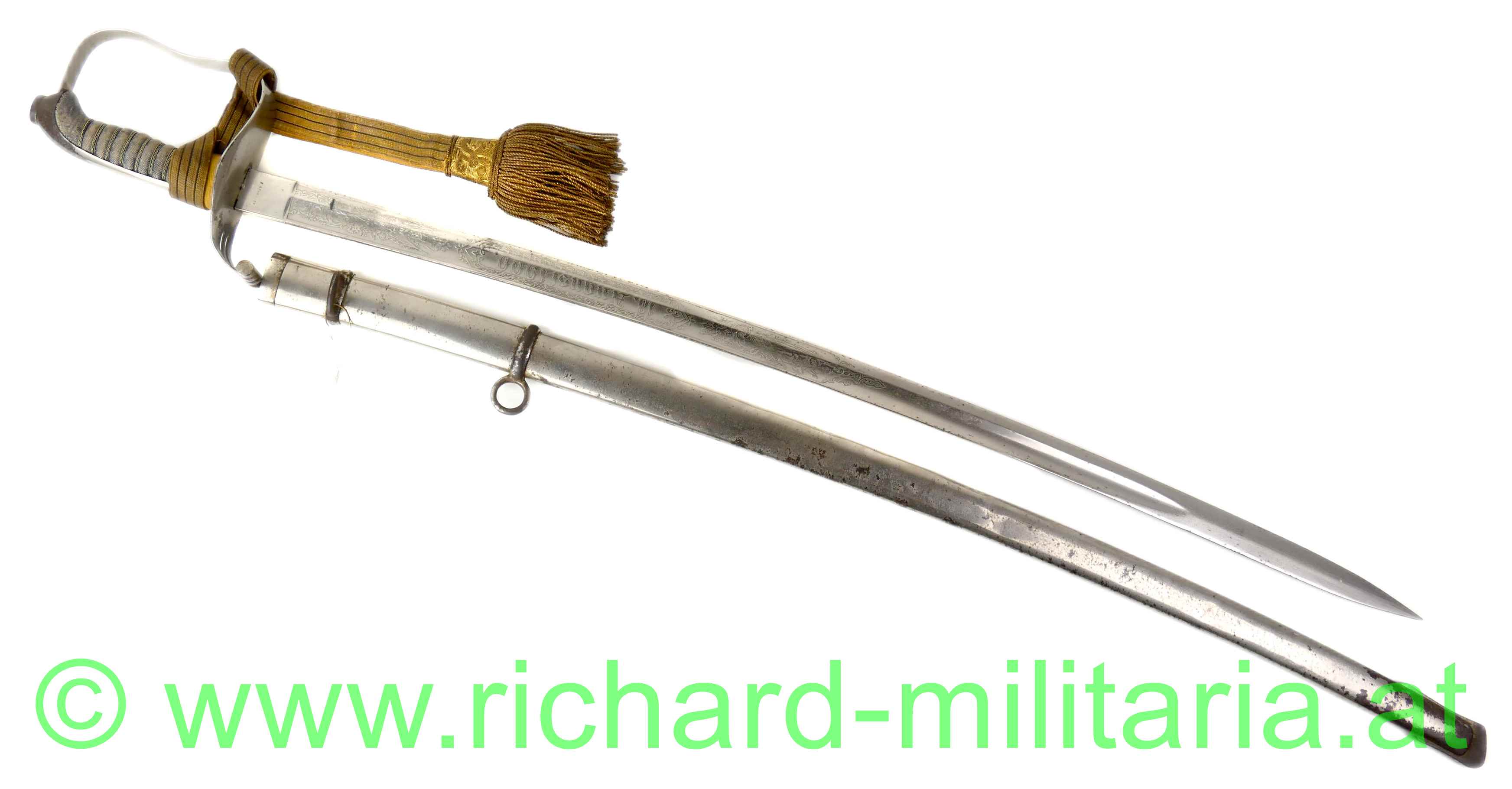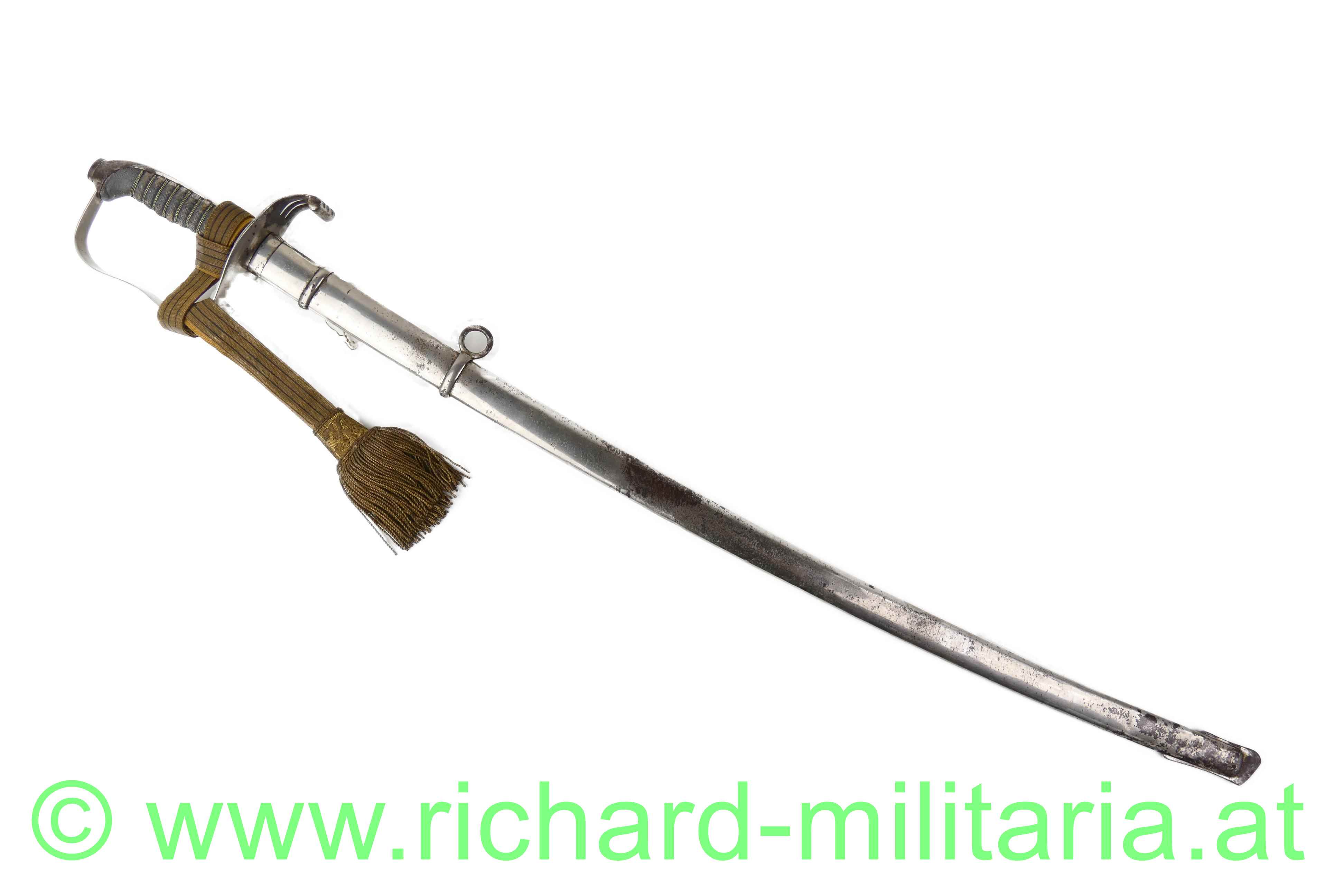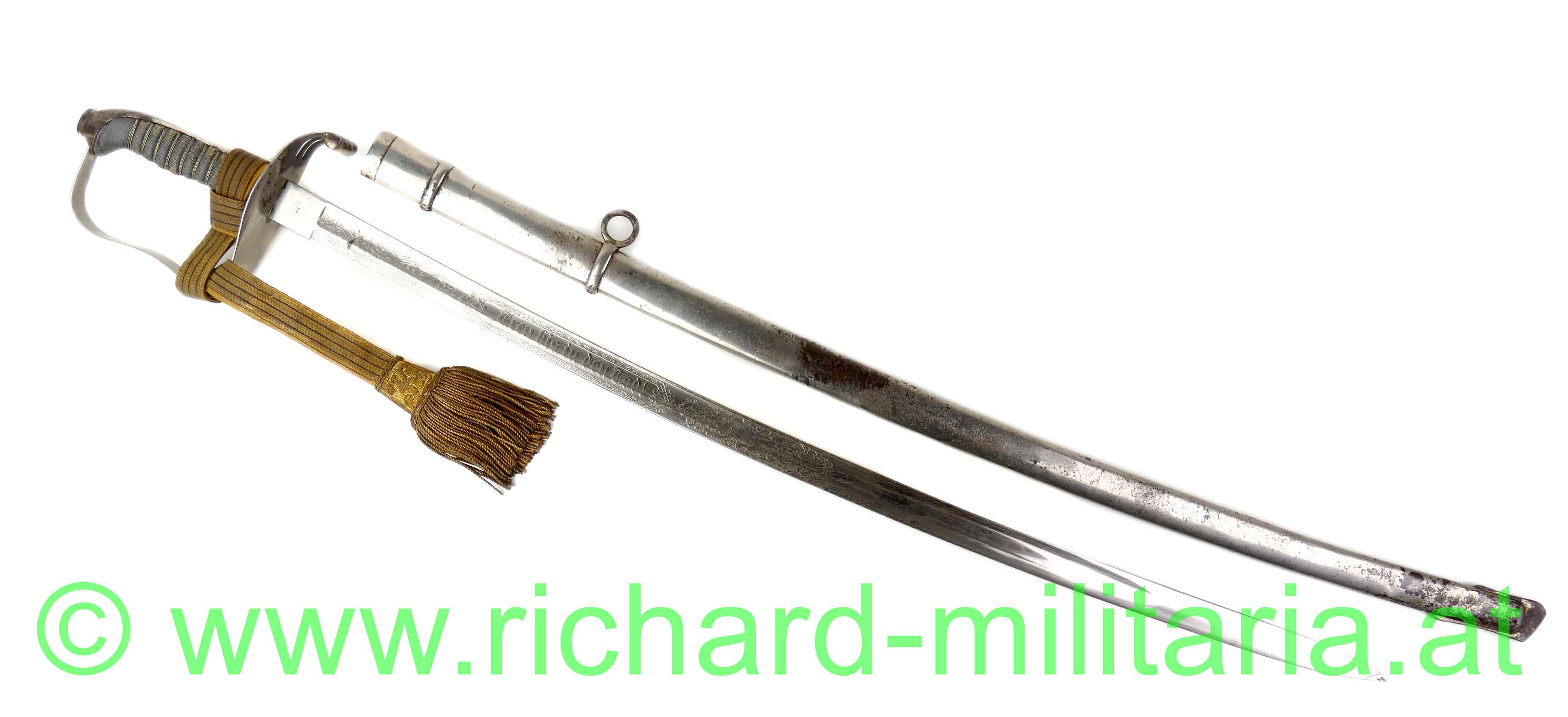 k.u.k. Infanterie Offizierssäbel M.1861 als Ausmusterungssäbel der Thersianischen Militärakademie Wr. Neustadt; schöne vernickelte, beidseitig gekehlte und geätzte Klinge mit Hersteller " JV, garantiert Solingen - Eisenhauer" und "J. Zimbler, Wien" am Klingenrücken, feine Ätzung: "Treu bis in den Tod" bzw. "18. August 1900"; dazu florales Muster und Kriegstrophäen über fast die gesamte Länge der Kehlung; Griff mit feiner Rochenhaut und gedrillter Drahtwicklung; Griffkappe mit Monogramm versehen - angerostet, bis auf den Griff gut erhaltene Vernickelung, originale Scheide mit minimalem Rostansatz und kleineren Dellen; mit Offiziersportepee Kaiser Karl im guten Zustand;