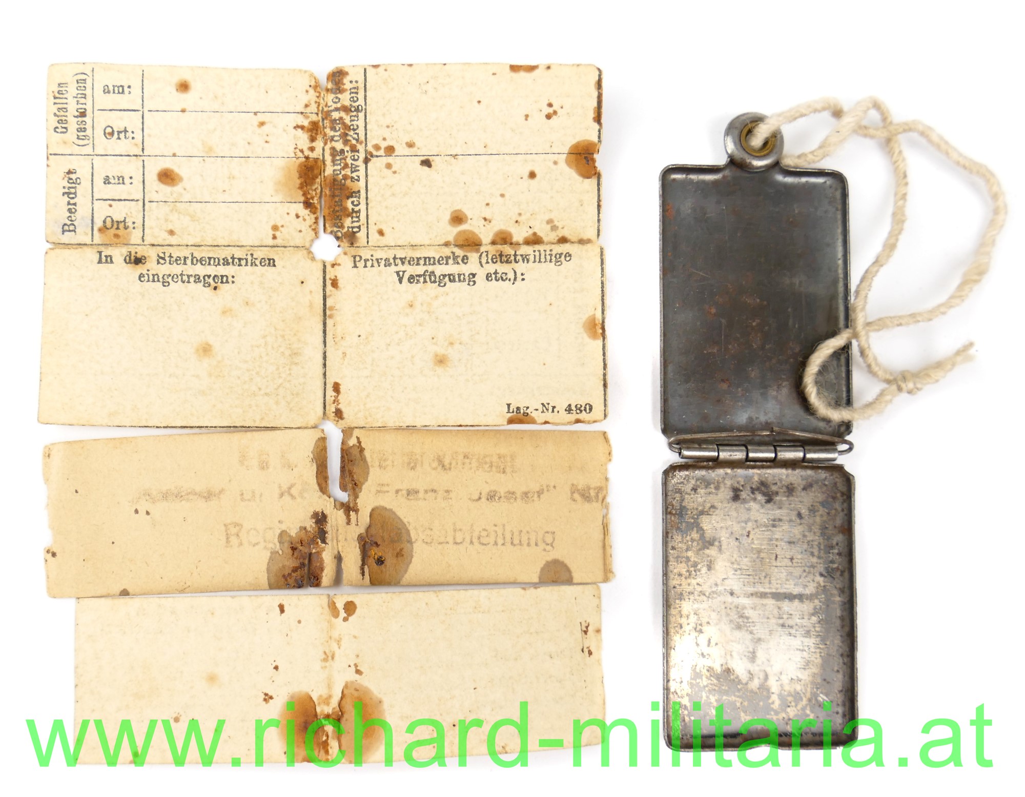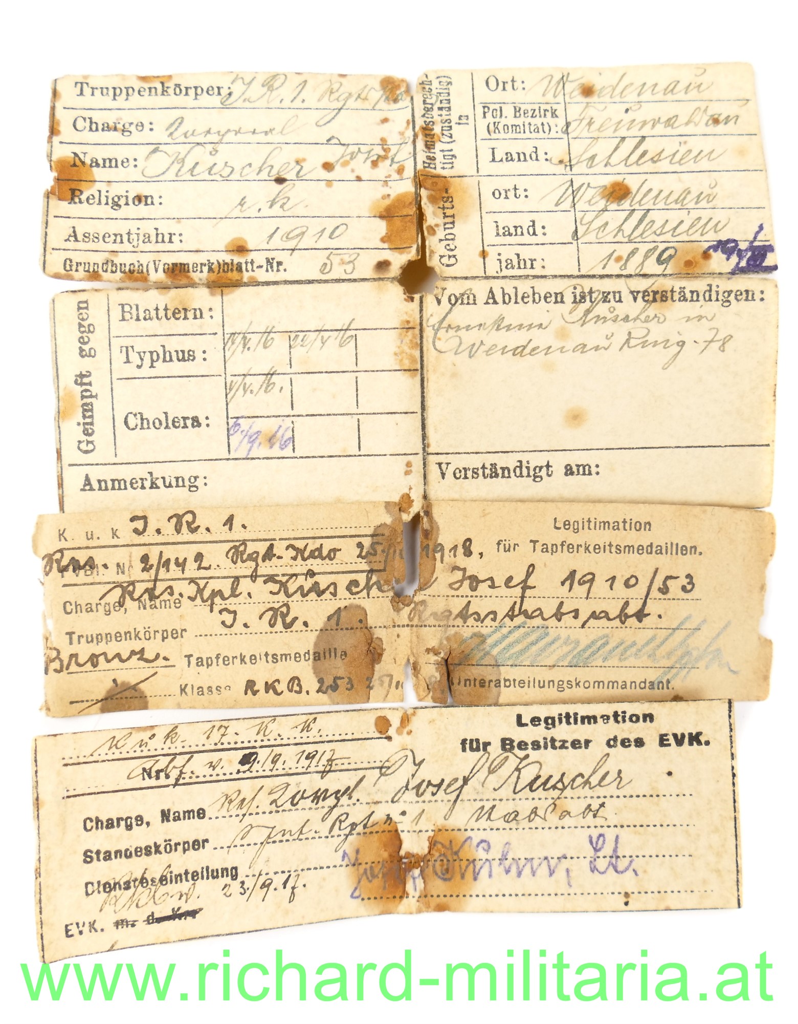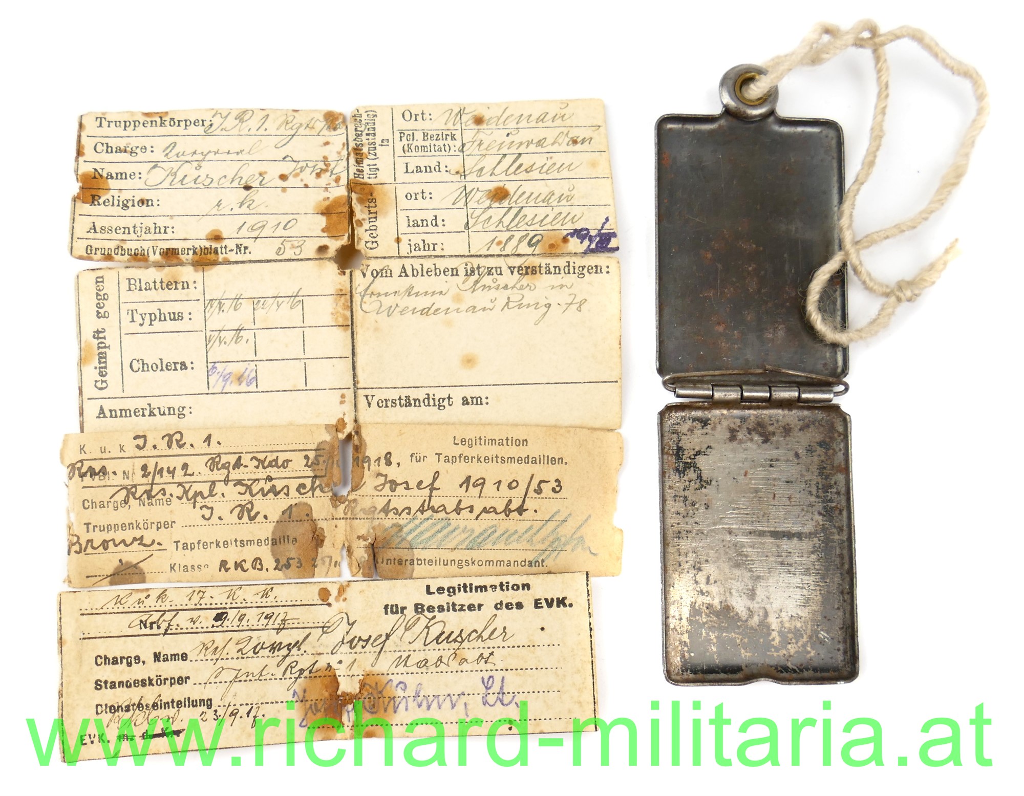 Erkennungsmarke des Res. Kpl. Josef Kuscher, k.u.k. Infanterie-Regiment 1; in der Erkennungskapsel aus Eisenblech befinden sich: