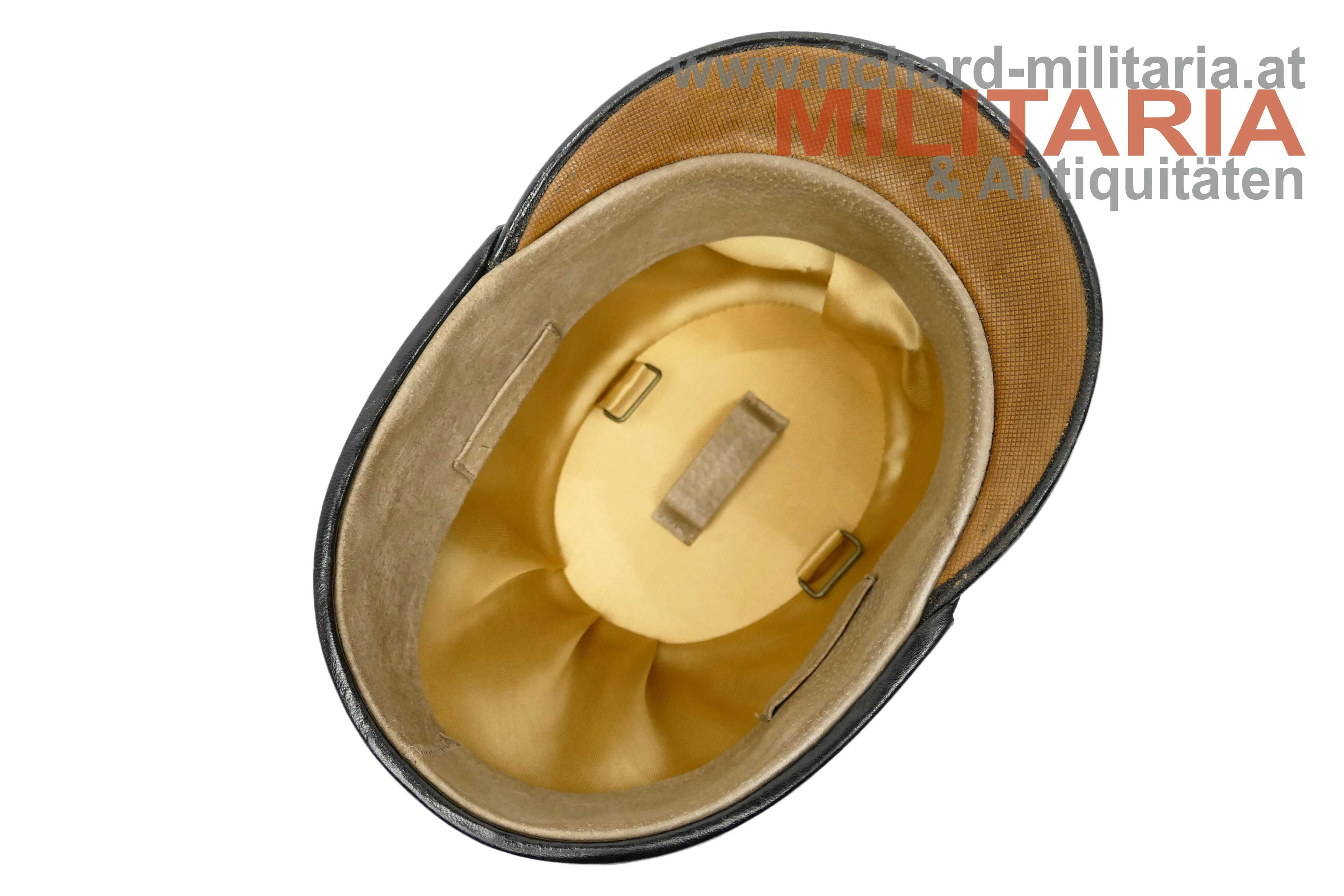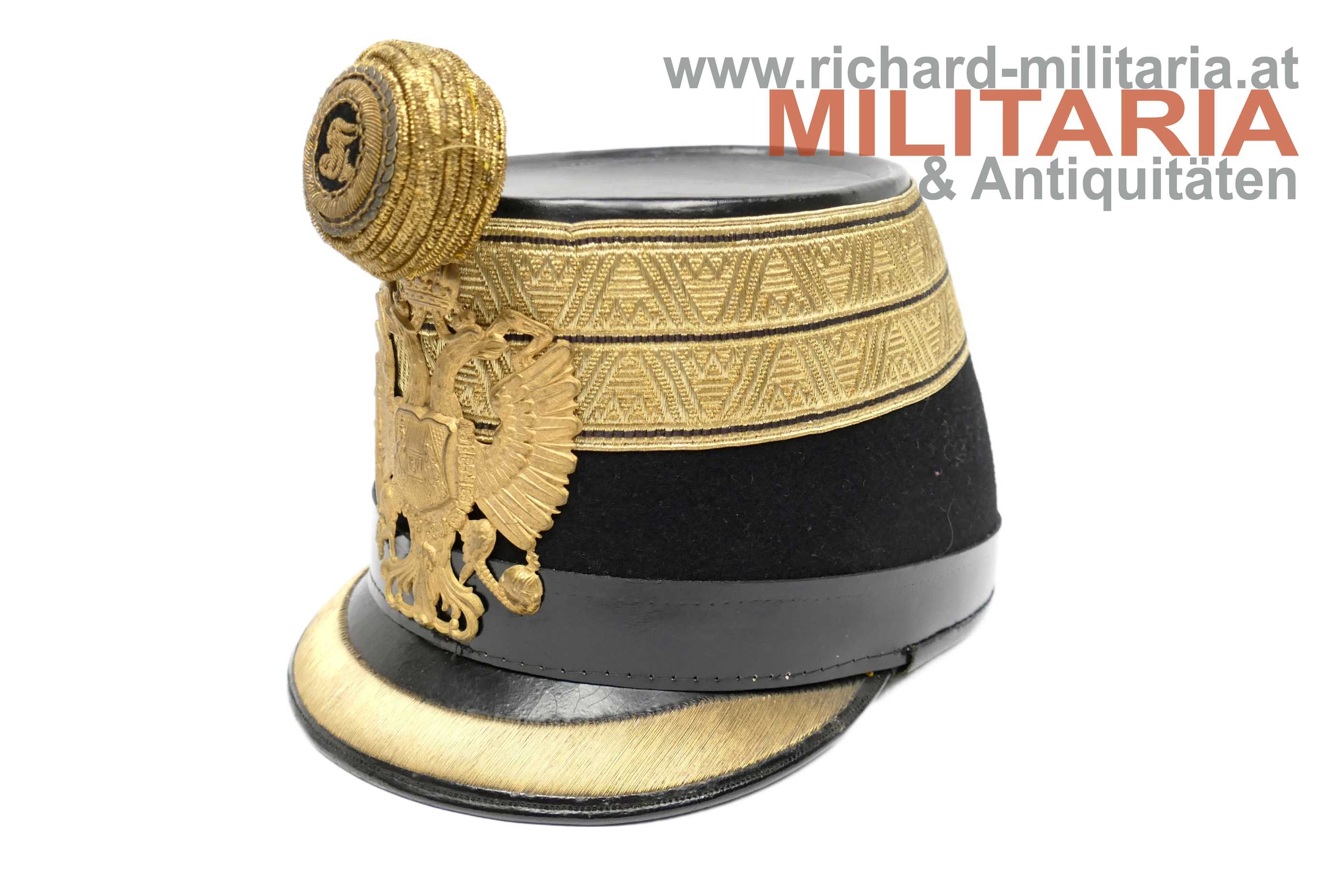 k.u.k. Infanterie-Tschako - Hauptmann - FÜR EINEN TRADITIONSVEREIN; UNTER VERWENDUNG ALTER ORIGINALER TEILE ZUSAMMENGESTELLT!; neuzeitlicher steifer Korpus mit schwarzem Filz überzogen; darauf die zweiteilige originale Goldborte eines Hauptmannes; vergoldeter originaler kaiserlicher Doppeladler und darüber die eingeschobene originale Tschako-Rose mit dem Allerhöchsten Namenszug; Schirm ebenfalls zeitgenössisch original; das Stirnleder und Innenfutter neuzeitlich.
