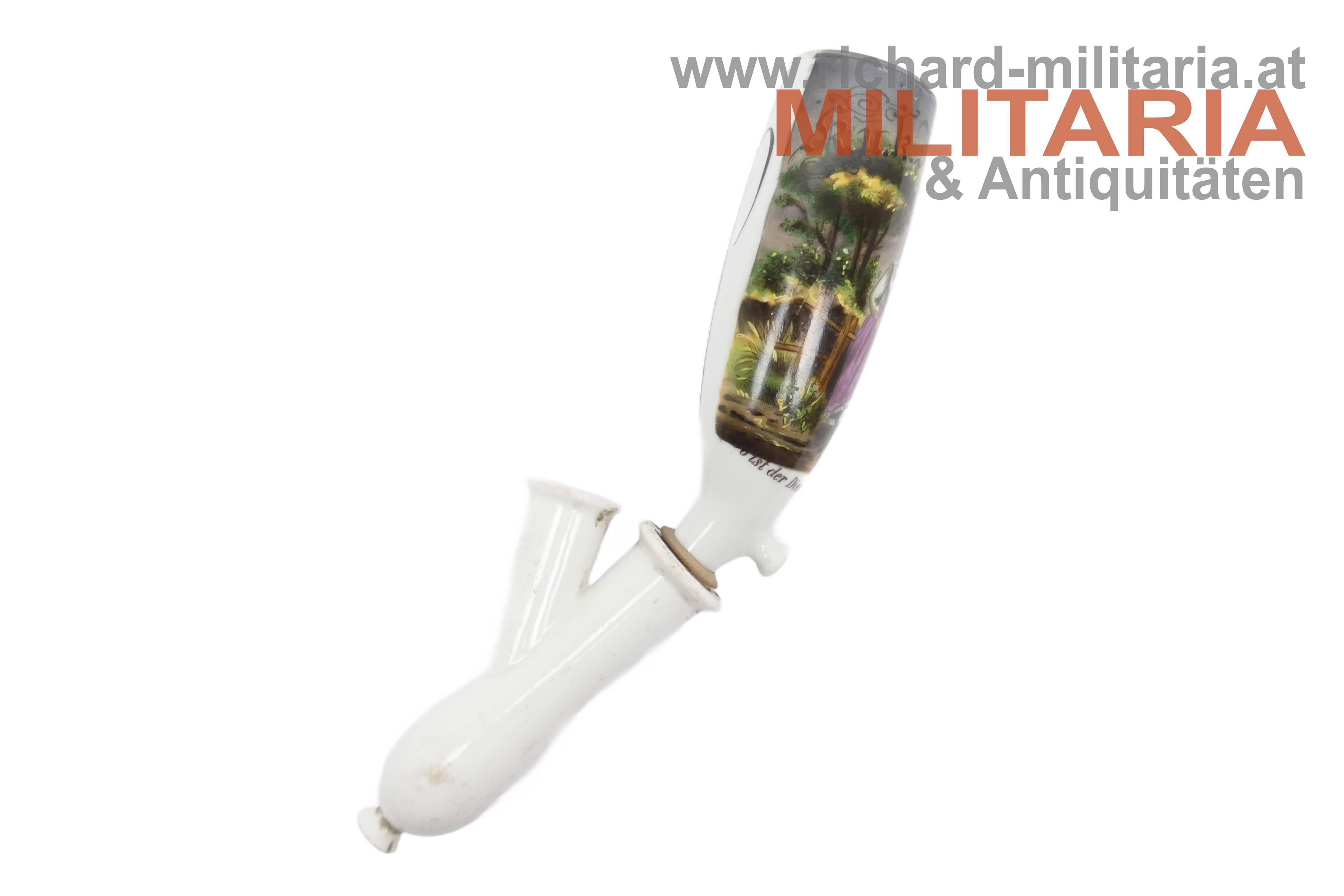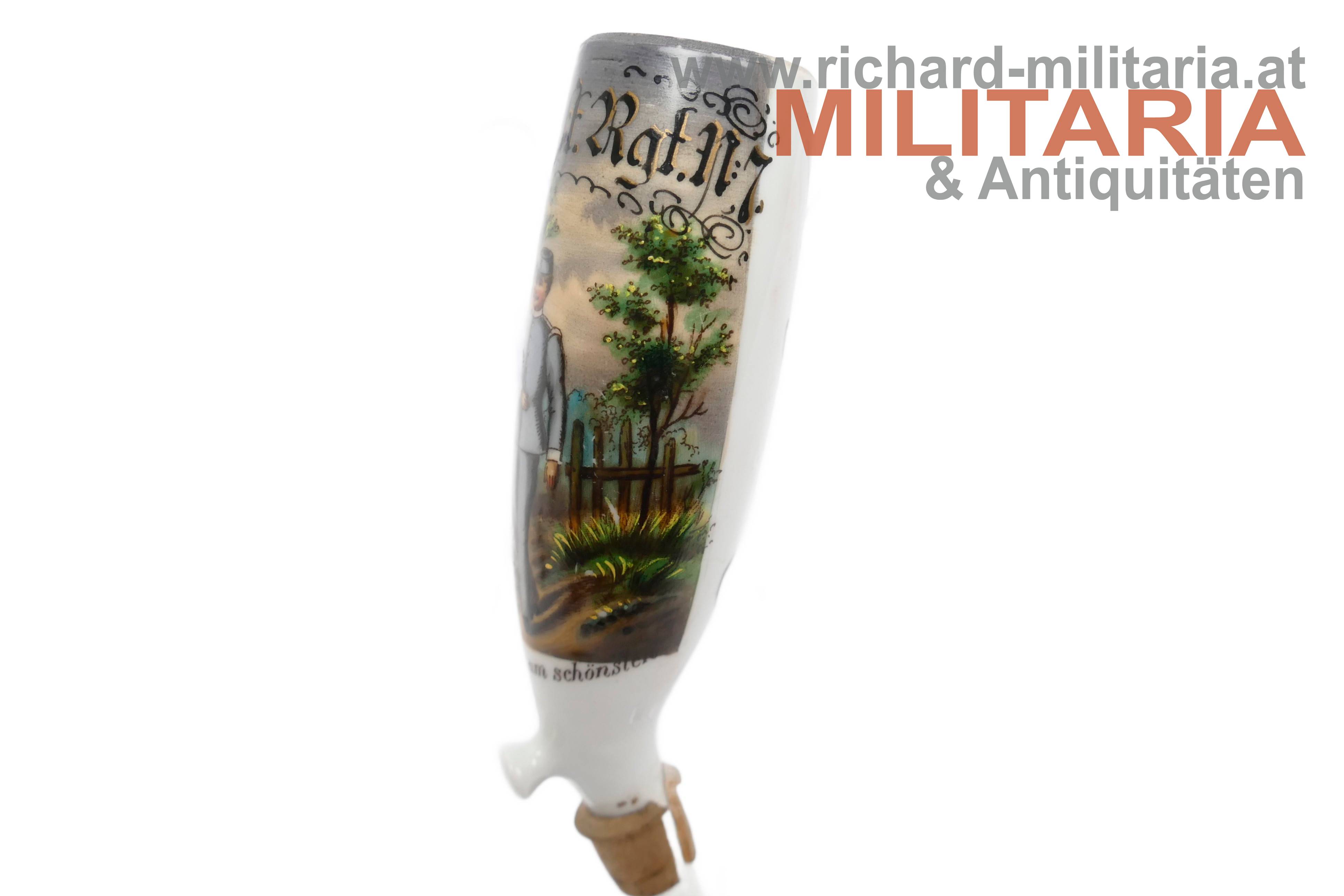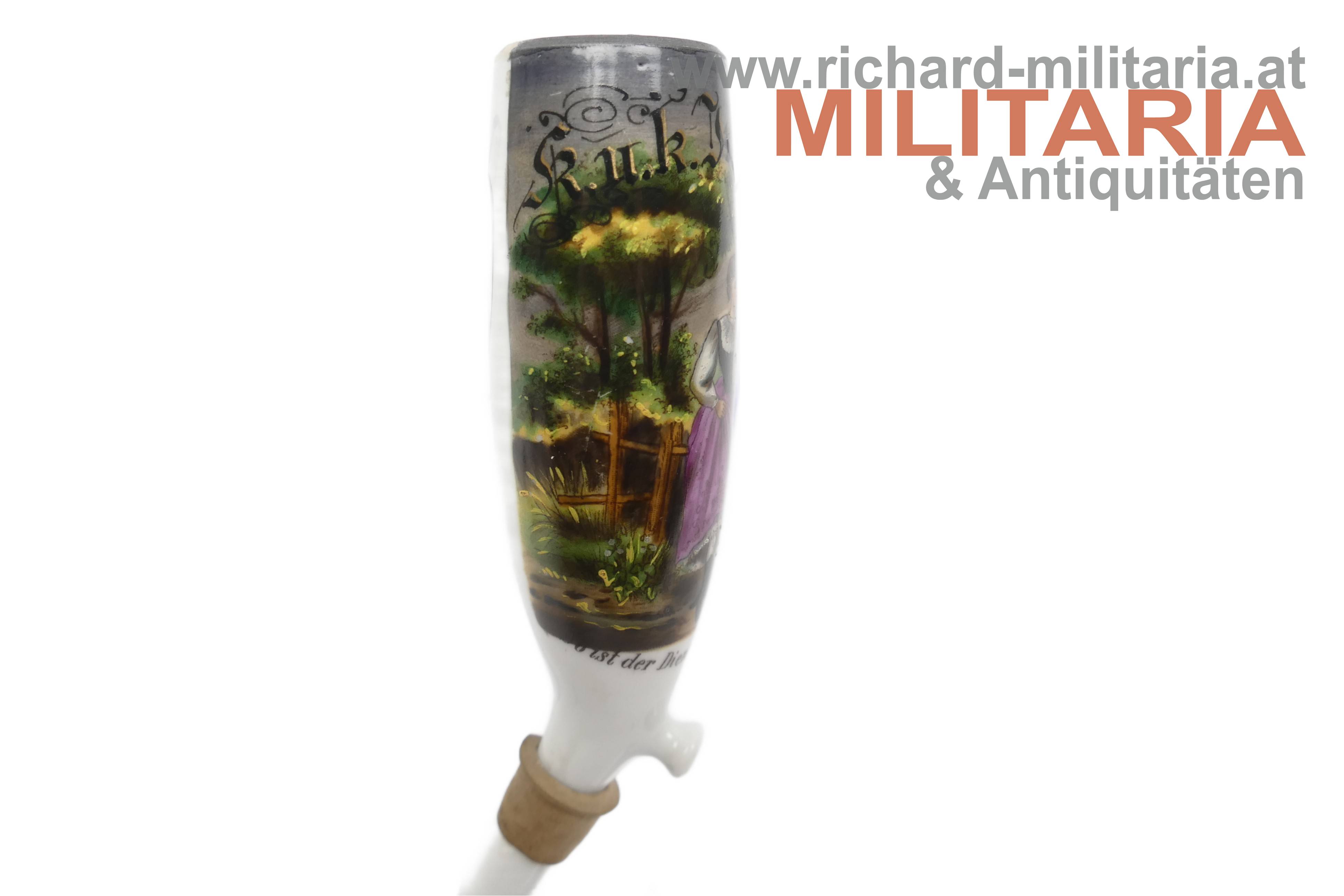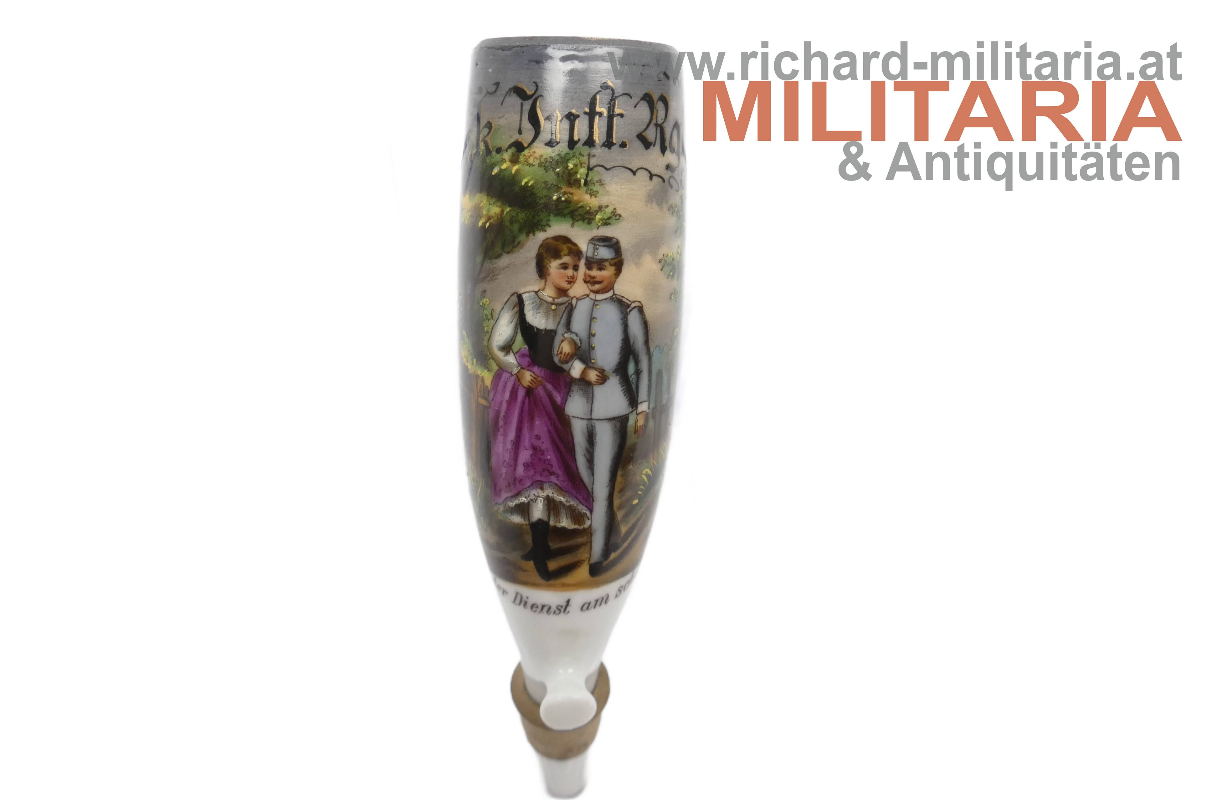 Regimentspfeife des Rochus Lipitz im k.u.k. Inf. Regiment No. 7 "Graf von Khevenhüller", feine handbemalte Pfeife mit Schriftzug "So ist der Dienst am schönsten", Wassersack mit Metallfassungen an der Pfeifen- und Stielaufnahme, ebenfalls handbemalt mit Schriftzug "Erinnerung an meine Dienstzeit" und Gedicht, Pfeife in sehr guten Zustand ohne Beschädigungen oder Reparaturen