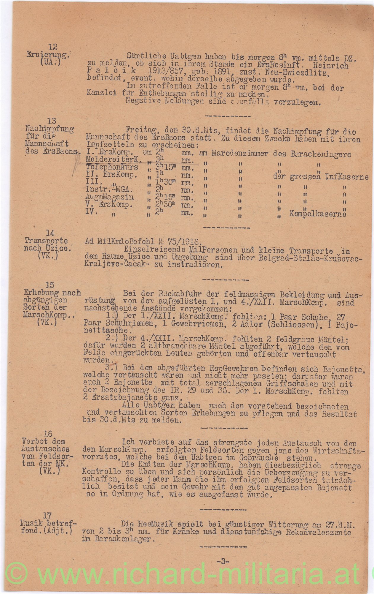 91 Stk. Ersatzbataillonskommandobefehle - k.u.k. Ers.Baon des Inf.- Rgts. Erzh. Karl Stephan No. 8; alle aus 1916 und aus NAGYSZEBEN (Hermannstadt bzw. Sibiu) - RUMÄNIEN; guter Zustand; Überformat A4;