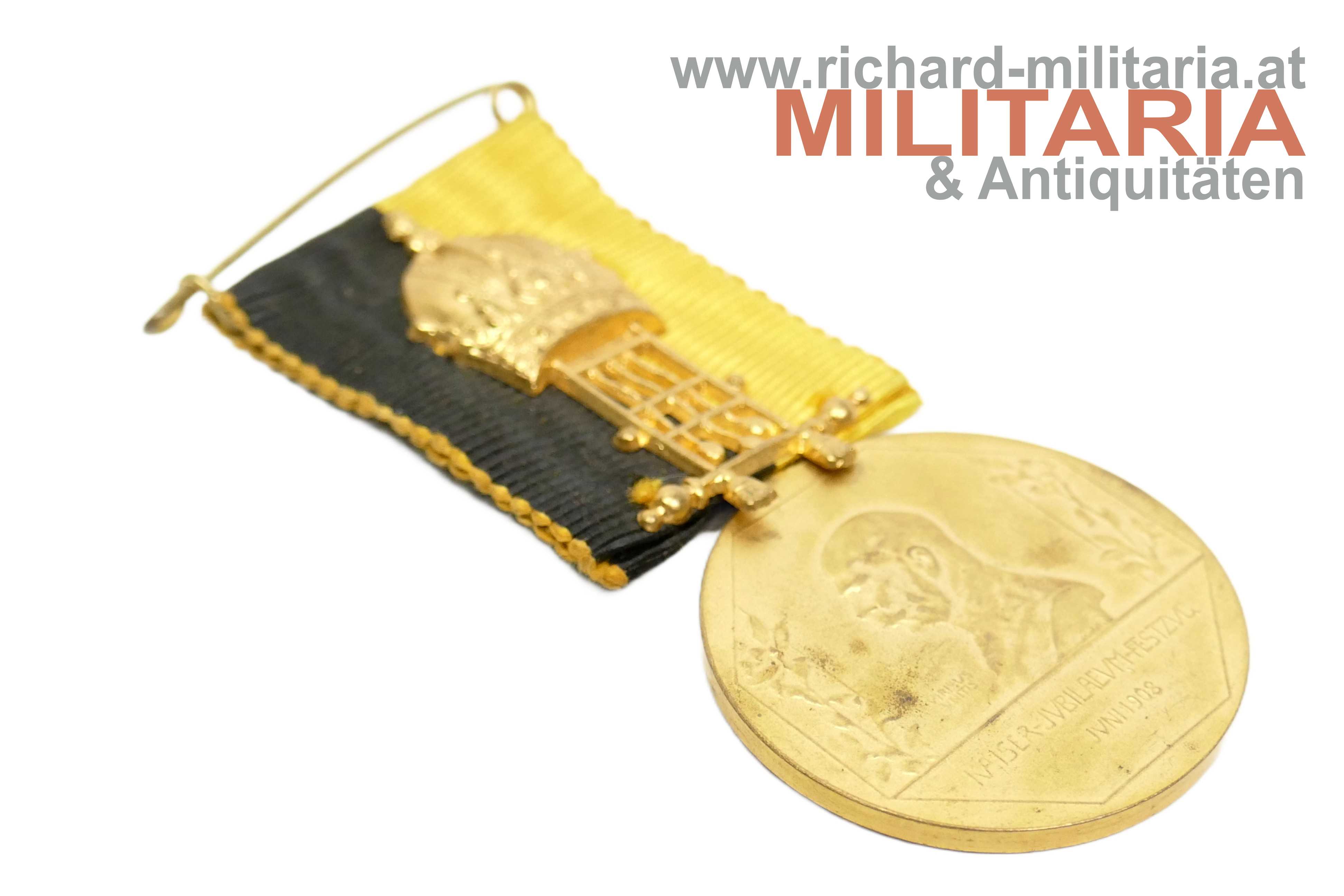 k.u.k. Kaiserjubiläums - Festzugmedaille 1908; Bronze vergoldet; am zugehörigen Band mit aufgesplinteter Krone; Band mit Tragenadel;
