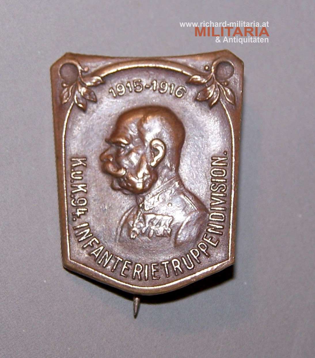 k.u.k. Kappenabzeichen - 94. Infanterietruppendivision 1915-1916; Bronze massiv; originale Tragenadel;
