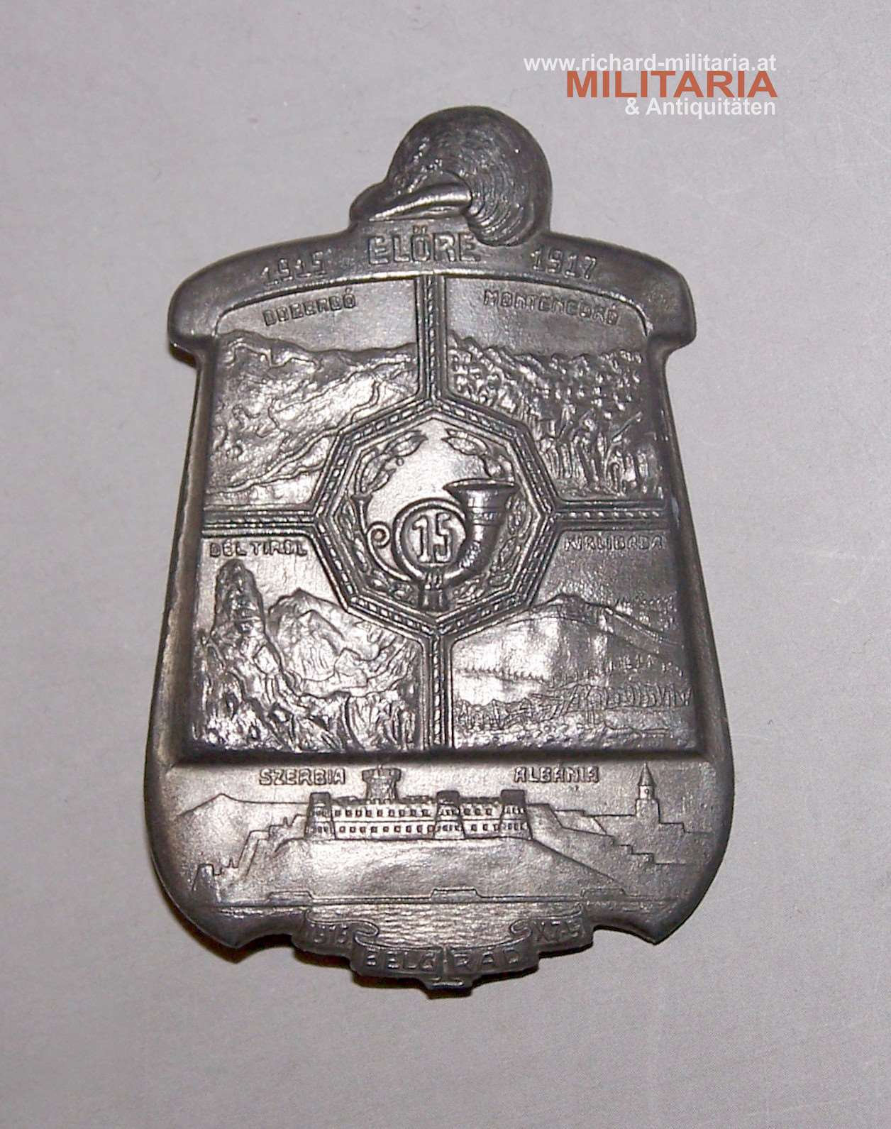 k.u.k. Kappenabzeichen FJB 15 - Elöre 1915-1915 - Doberdo - Montenegro - Dél Tirol (Südtirol) - Kirlibaba - Szerbia - Albania - Belgrad; Zinkblech; aufgelötetes Nadelsystem;