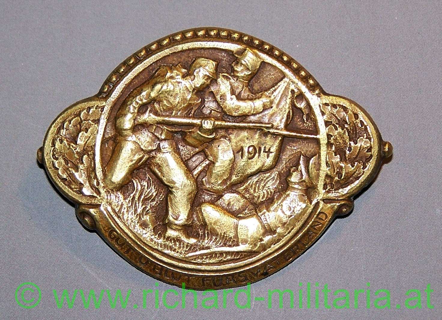 k.u.k. Kappenabzeichen Gut und Blut fürs Vaterland 1914, Tombak, originales Nadelsystem;