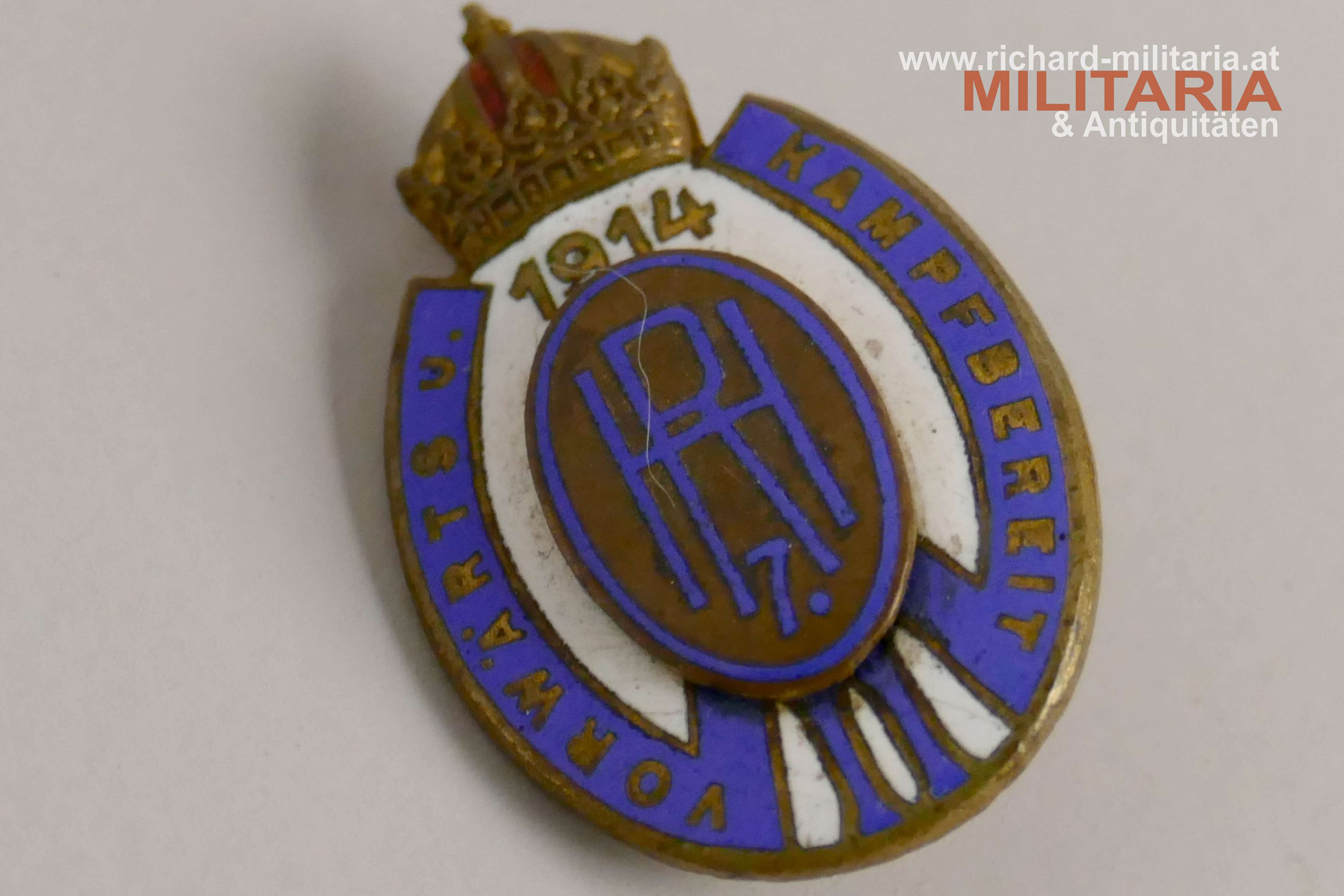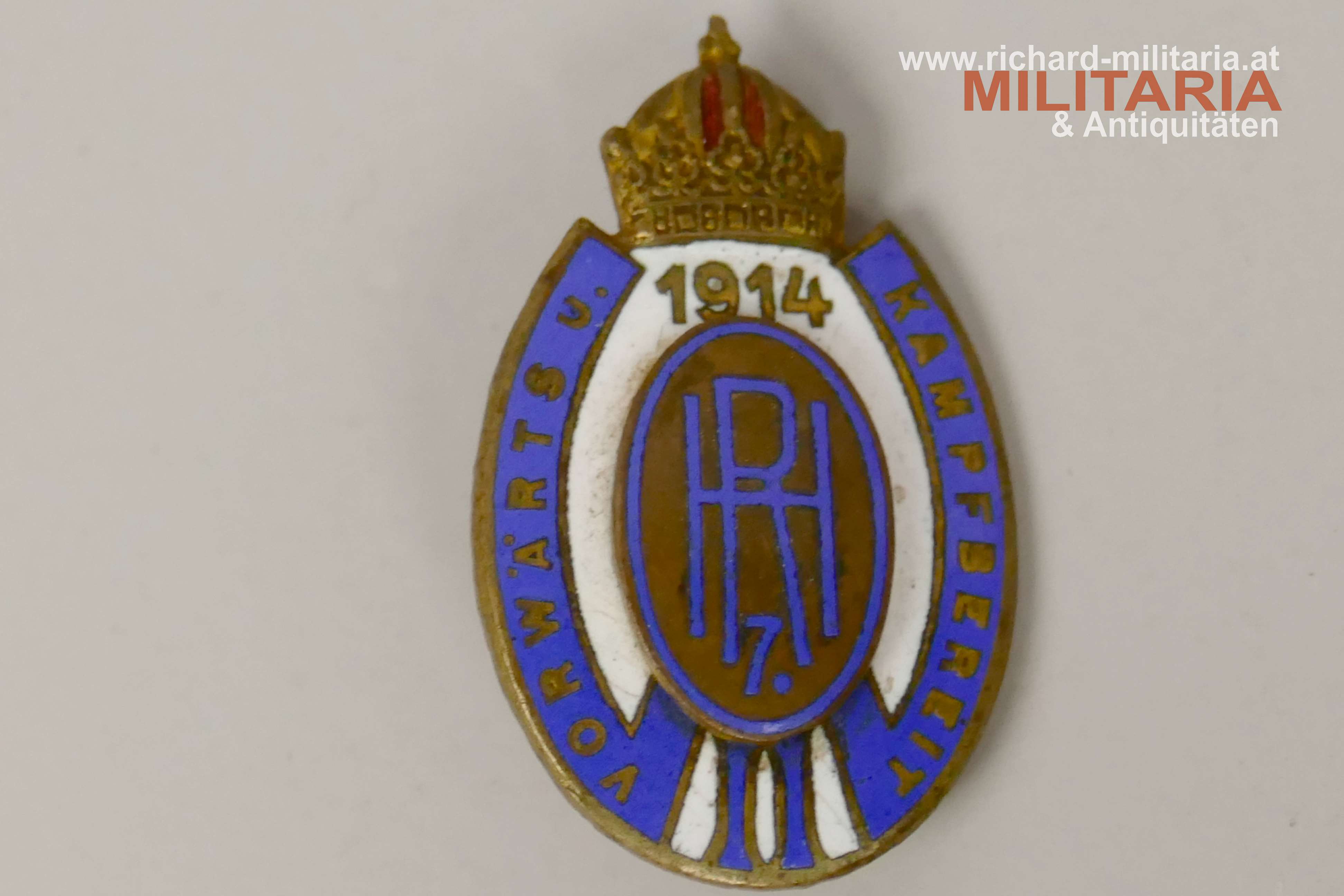 k.u.k. Kappenabzeichen Husaren Regiment 7 (Wilhelm II. Deutscher Kaiser und König von Preußen) - 1914 - Vorwärts und kampfbereit; Tombak emailliert; Avers vergoldet; originales Nadelsystem;