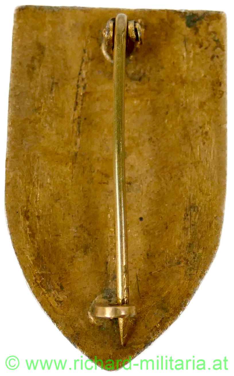 k.u.k. Kappenabzeichen IR 14 HESSEN, Tombak vergoldet und schwarz emailliert; sehr guter Zustand mit originaler Nadel