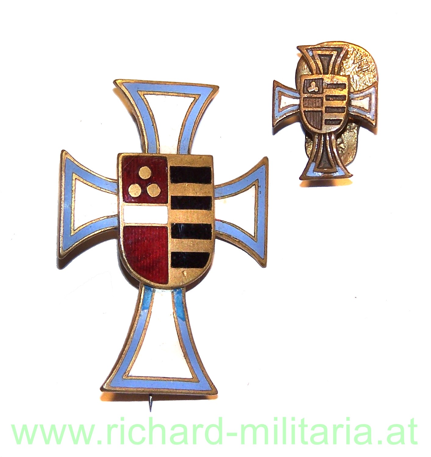 k.u.k. Kappenabzeichen IR49 Hessen Kreuz mit Mini. Erinnerung an meinem Kriegsdienst 1914-1916, Tombak emailliert, beide Abzeichen mit Emailschäden, teilweise ausgebessert, beide Abzeichen mit originalem Trage- bzw. Nadelsystem;