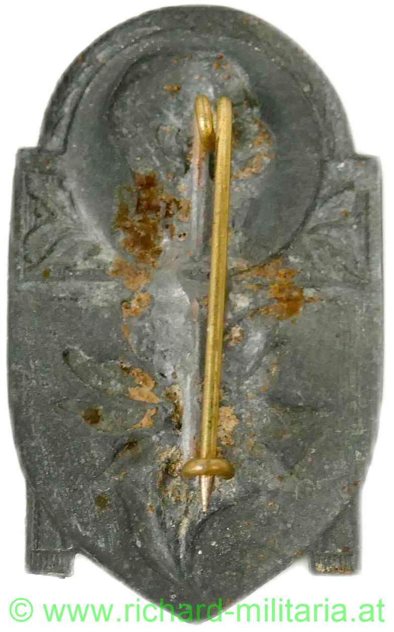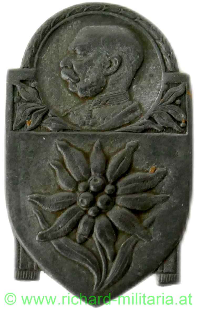 k.u.k. Kappenabzeichen Kaiser Franz Josef mit Edelweiss, Kriegsmetall, sehr guter Zustand mit originaler Nadel