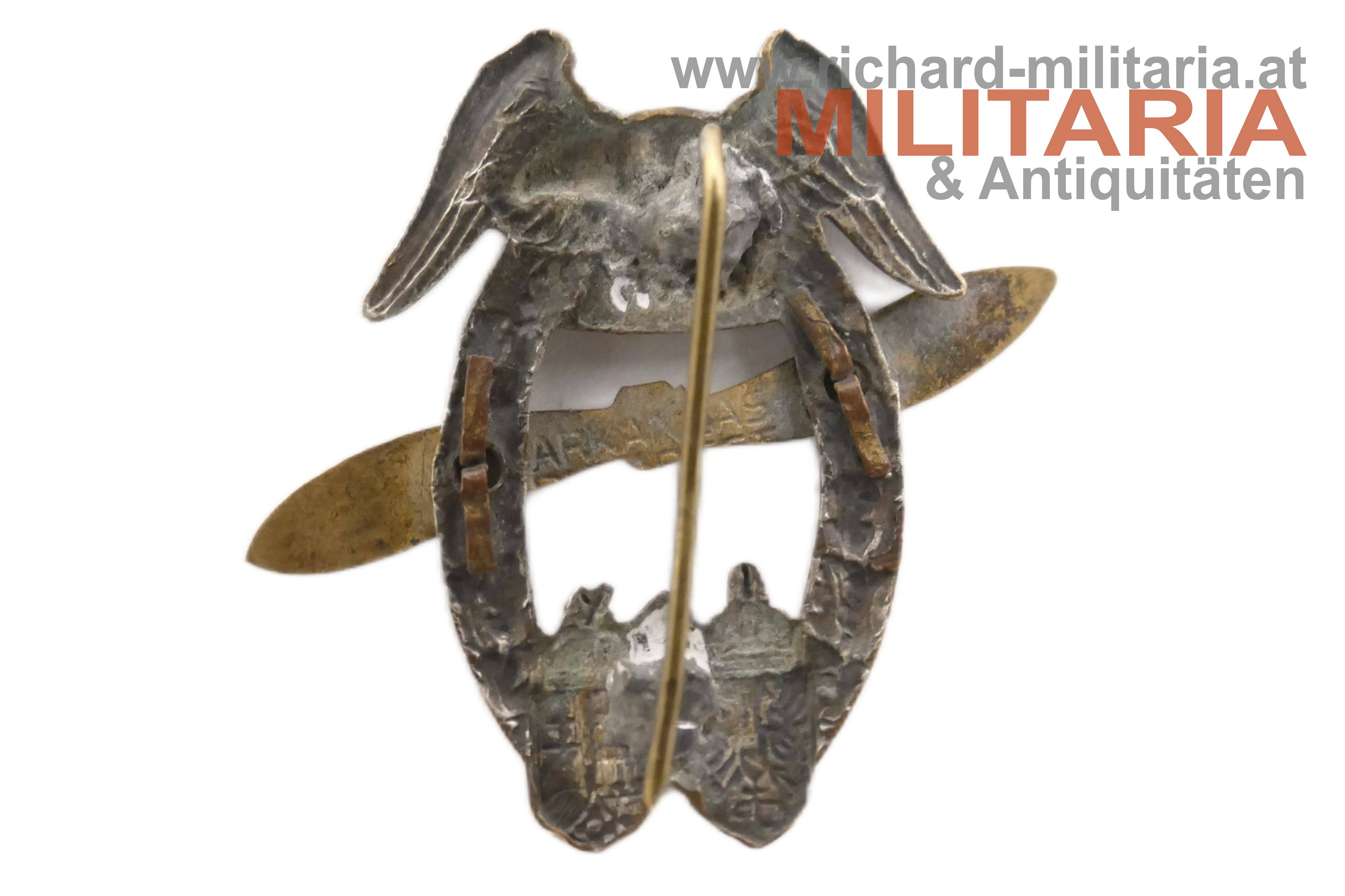 k.u.k. Kappenabzeichen - Luftfahrttruppe - Kaiser Franz Josef; Tombak versilbert; Propeller aufgesplintet; Nadel ersetzt (Nadelhaken entfernt).