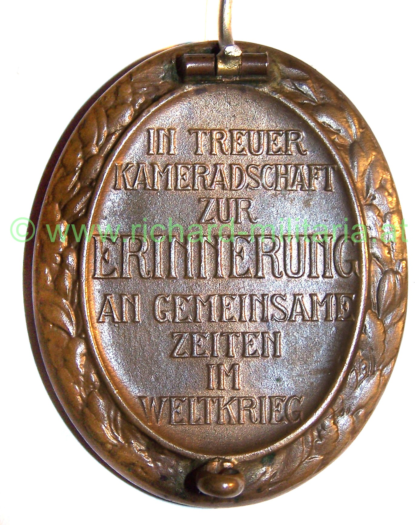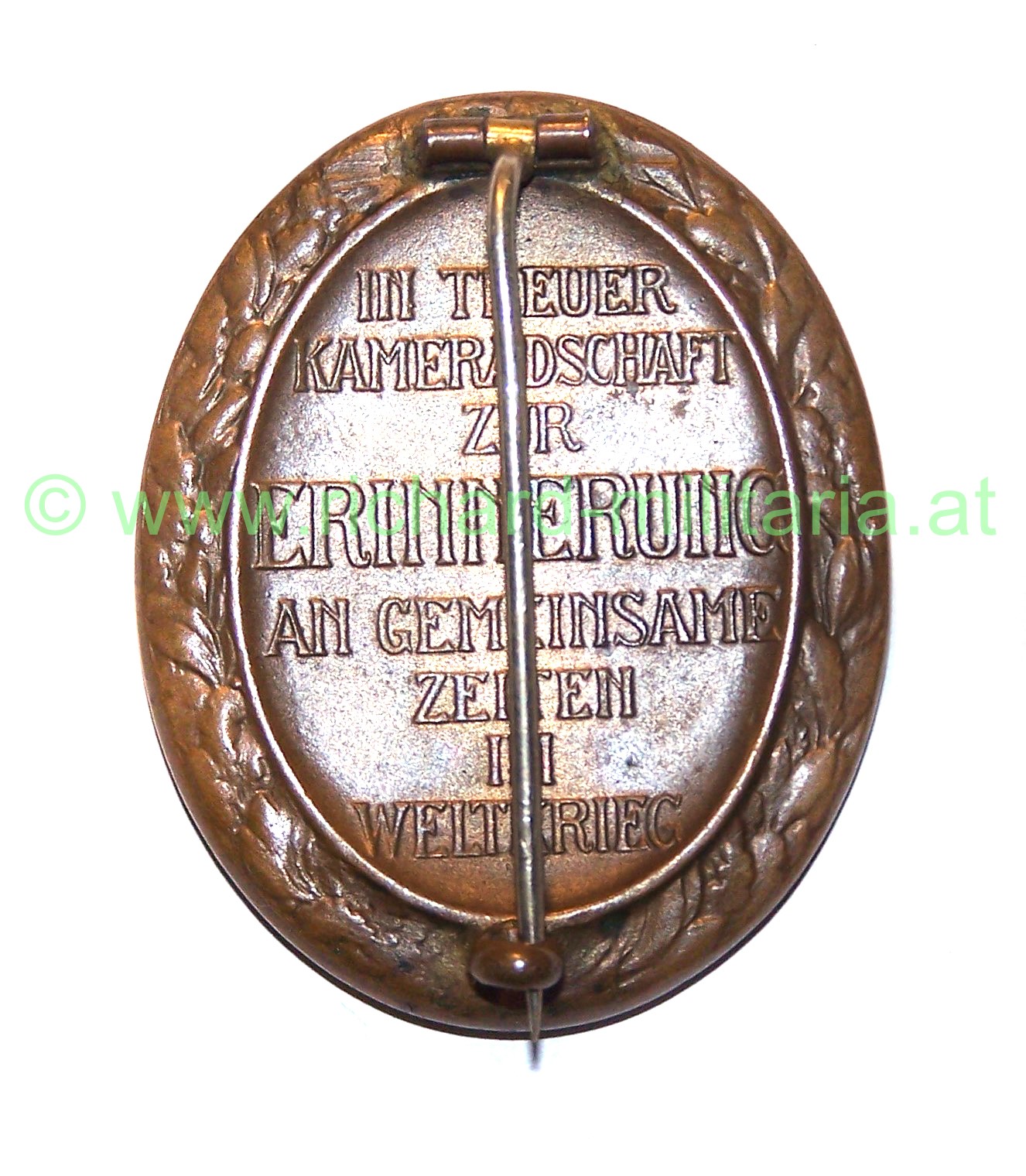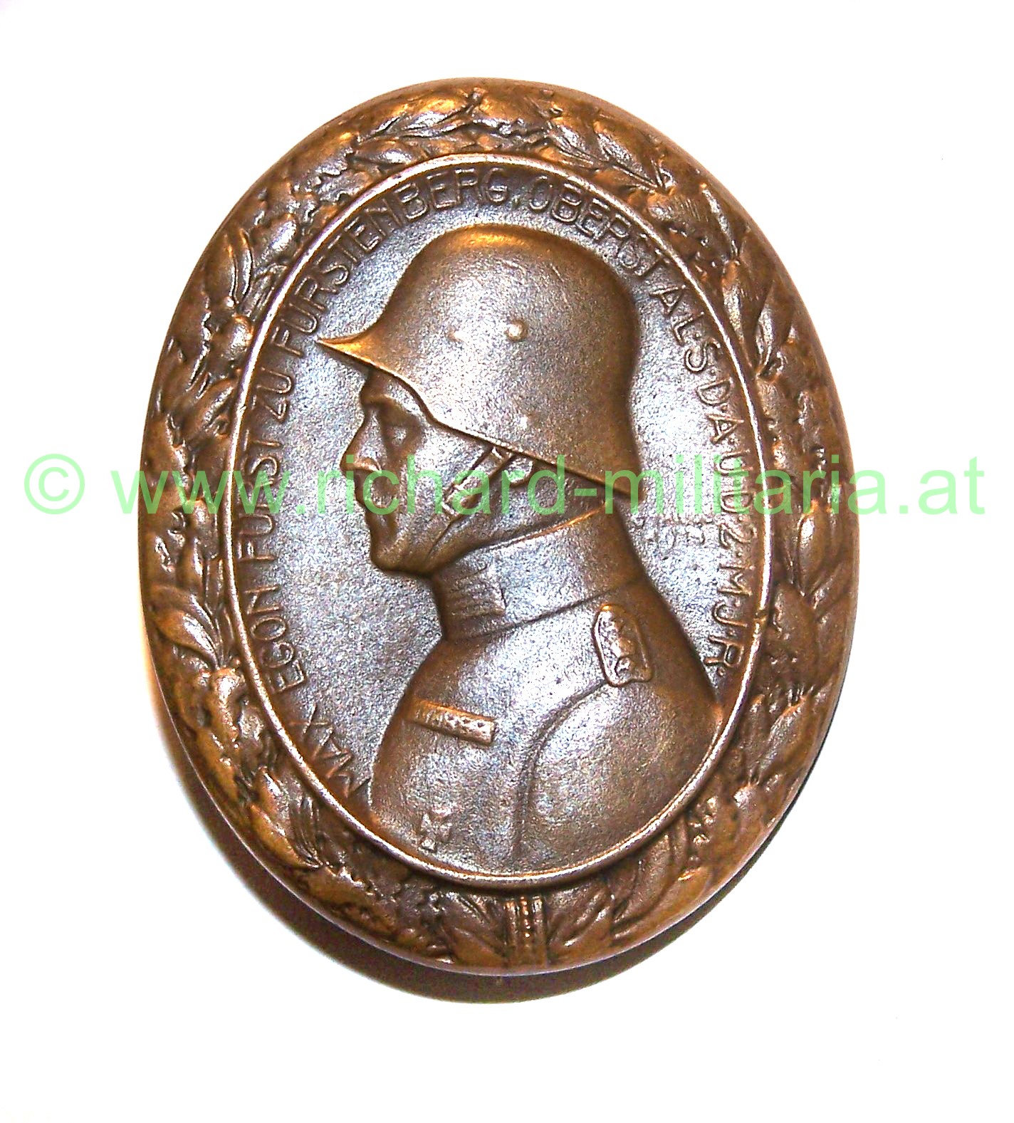 k.u.k. Kappenabzeichen - Max Egon Fürst zu Fürstenberg, Oberst A.L.S.D.A.U.D. 2.M.J.R - auf der Rückseite: "In treuer Kameradschaft zur Erinnerung an gemeinsame Zeiten im Weltkrieg", Tombak, originale Nadel;
