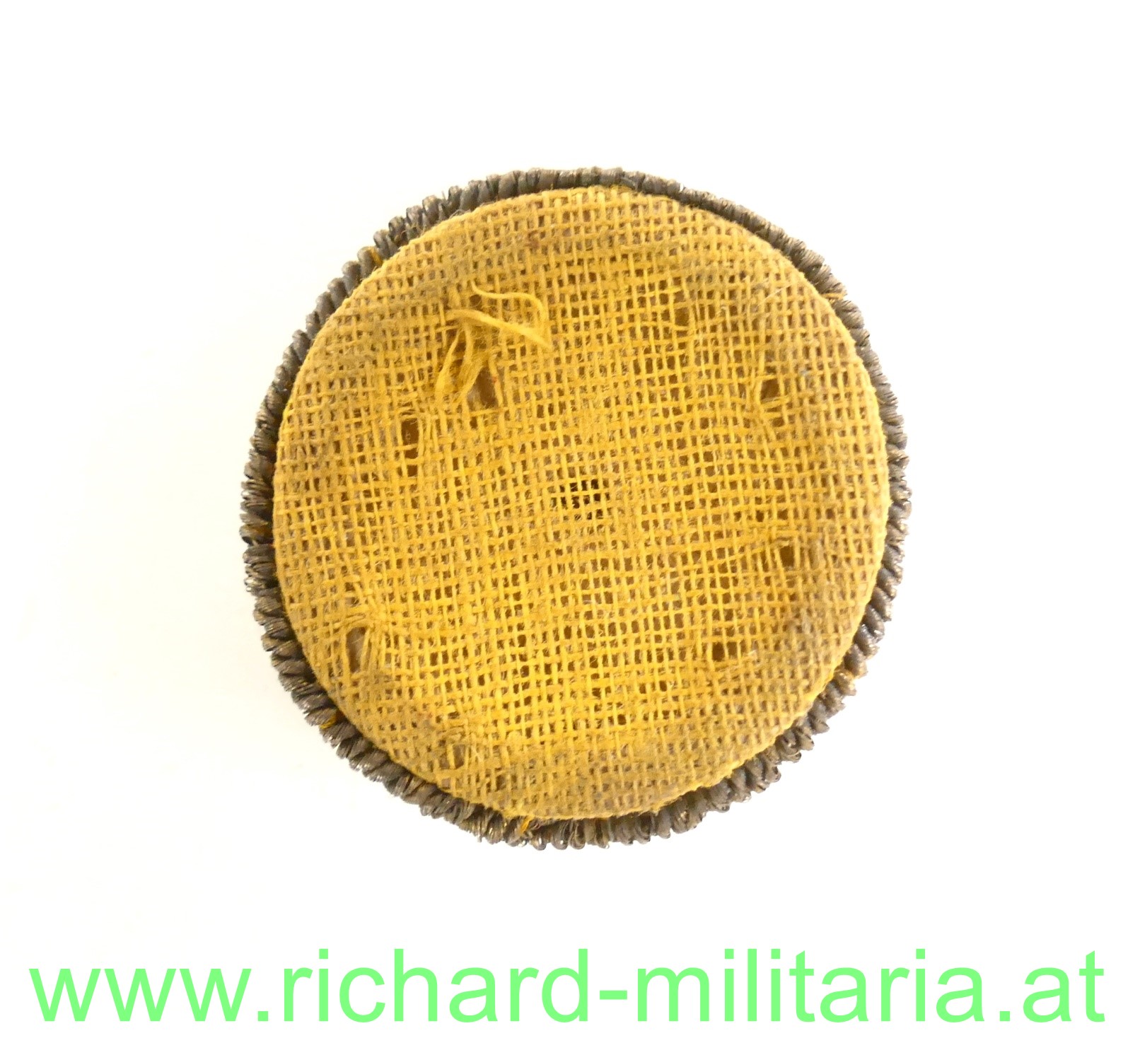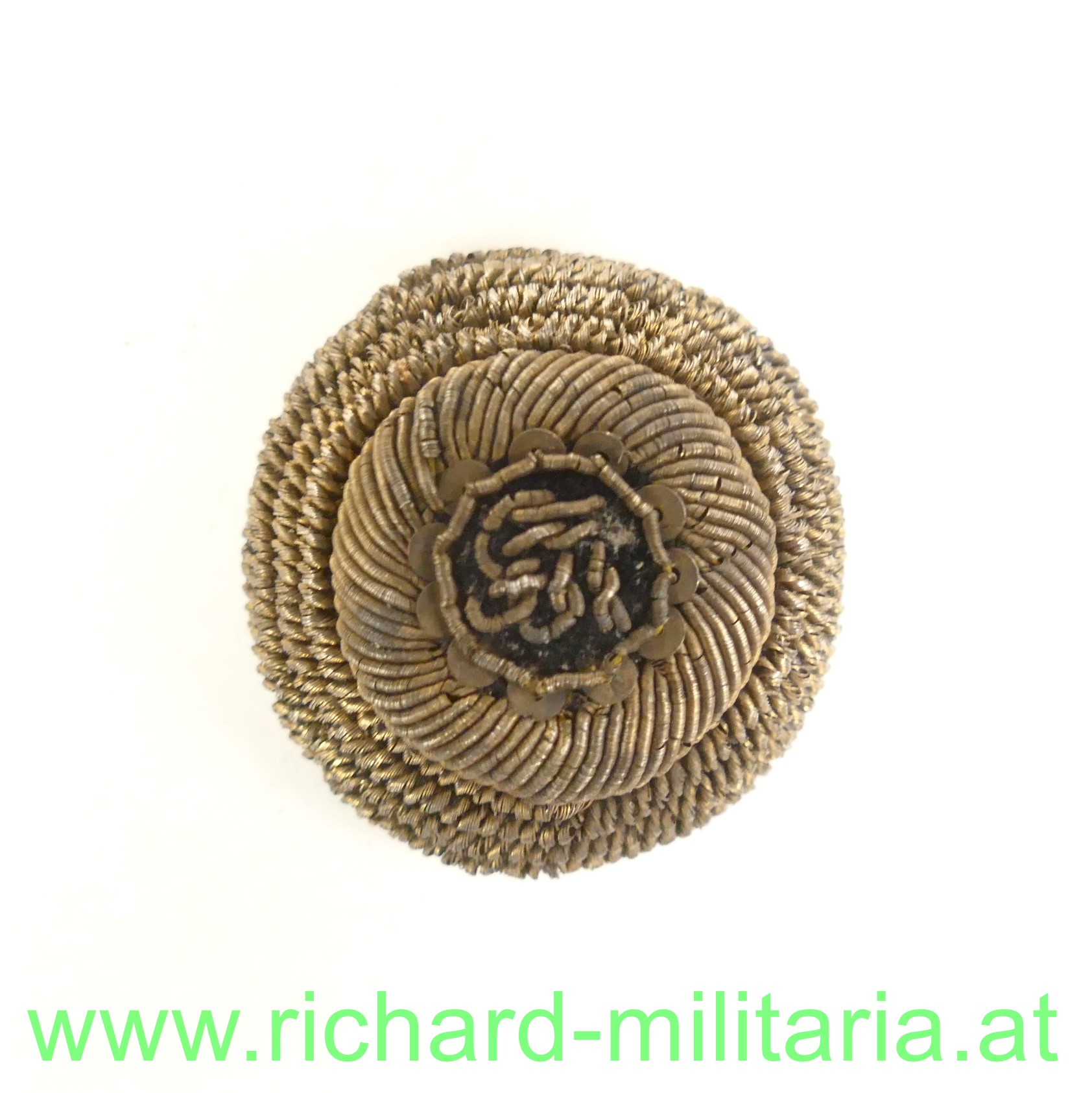 k.u.k. Kappenkokarde f. Offiziere Modell Kaiser Franz Josef, Gespinst aus Goldfaden, Initialen eingestickt auf schwarzem Grund, rückseitige gelbe Stoffabdeckung;