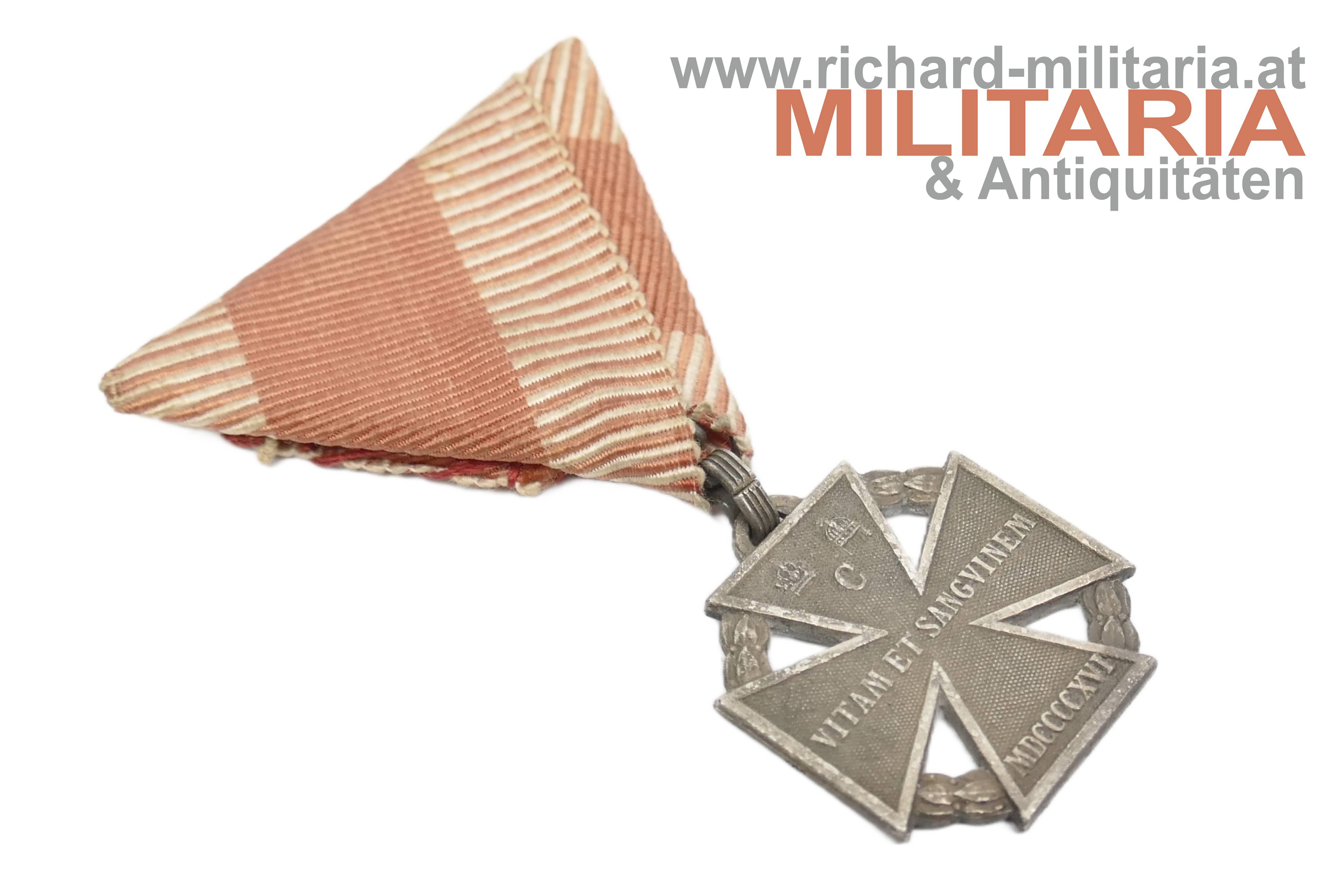 k.u.k. Karl Truppenkreuz; Kriegsmetall versilbert; Randstempel "HMA"; originales Band;