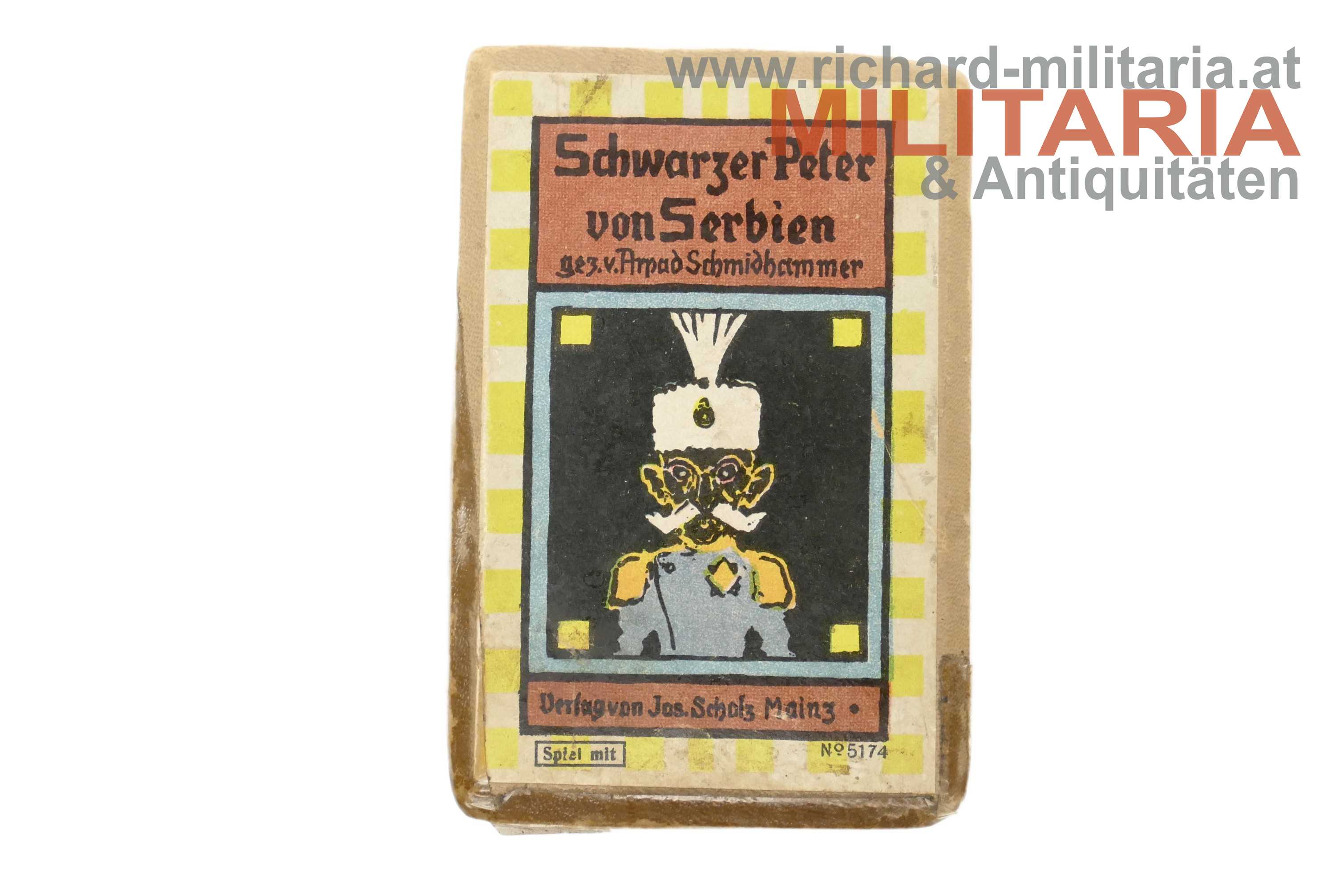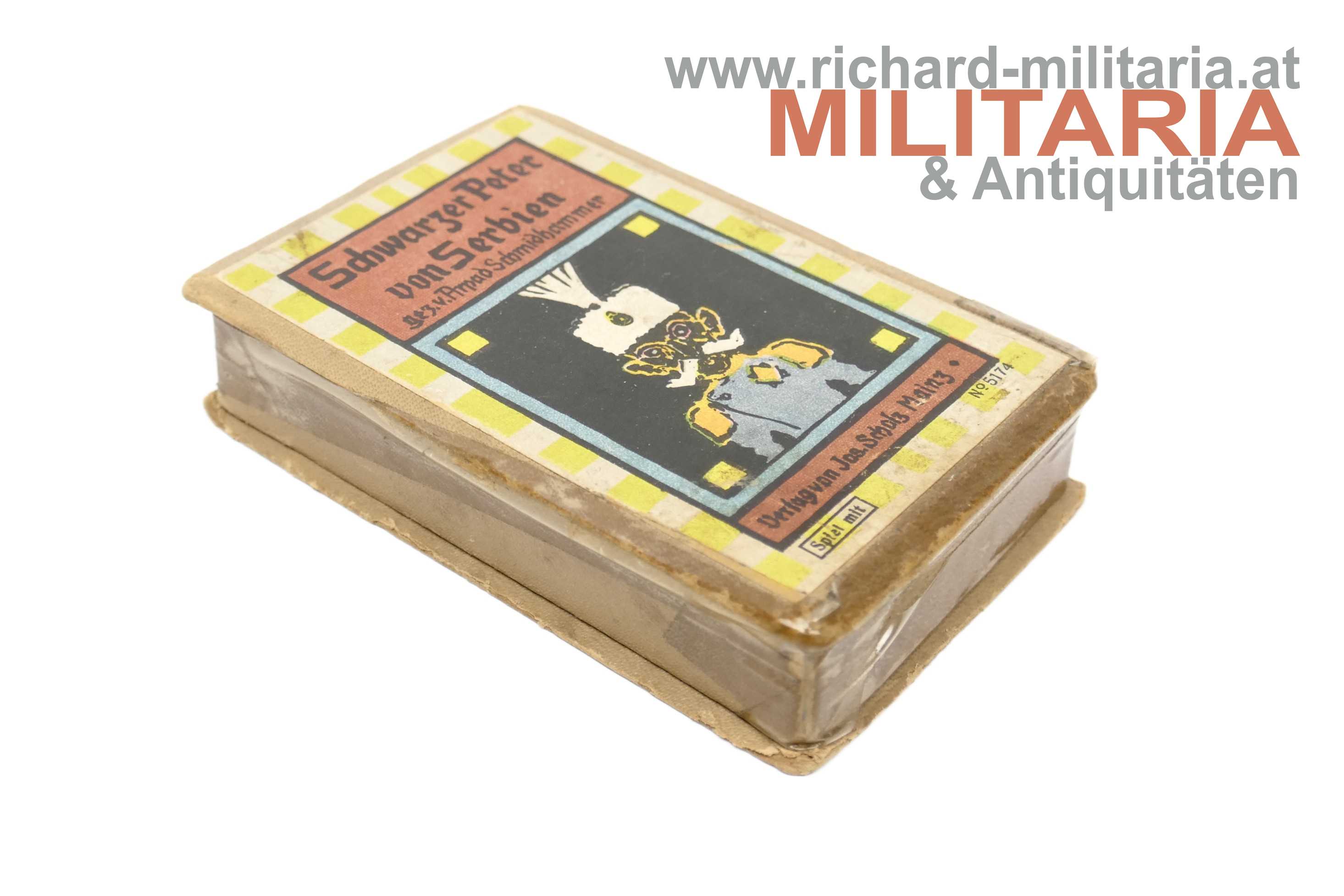 k.u.k. Kartenspiel - Schwarzer Peter von Serbien; vollständig - 35 Spielkarten mit Abbildungen von "Führern, Schürer und Verführten unserer Gegner" (so steht es in der Anleitung); Karten bespielt und teilweise geknickt bzw. auch etwas eingerissen; in der originalen Verpackung - diese am Rand mit Klebenband verstärkt; auf den Karten Karikaturen von König George, Zar Nikolaus, König Albert etc. sowie auch Karikaturen einfacher Soldaten zum Beispiel ein "Japs", "Belgier" oder auch "Engländer";