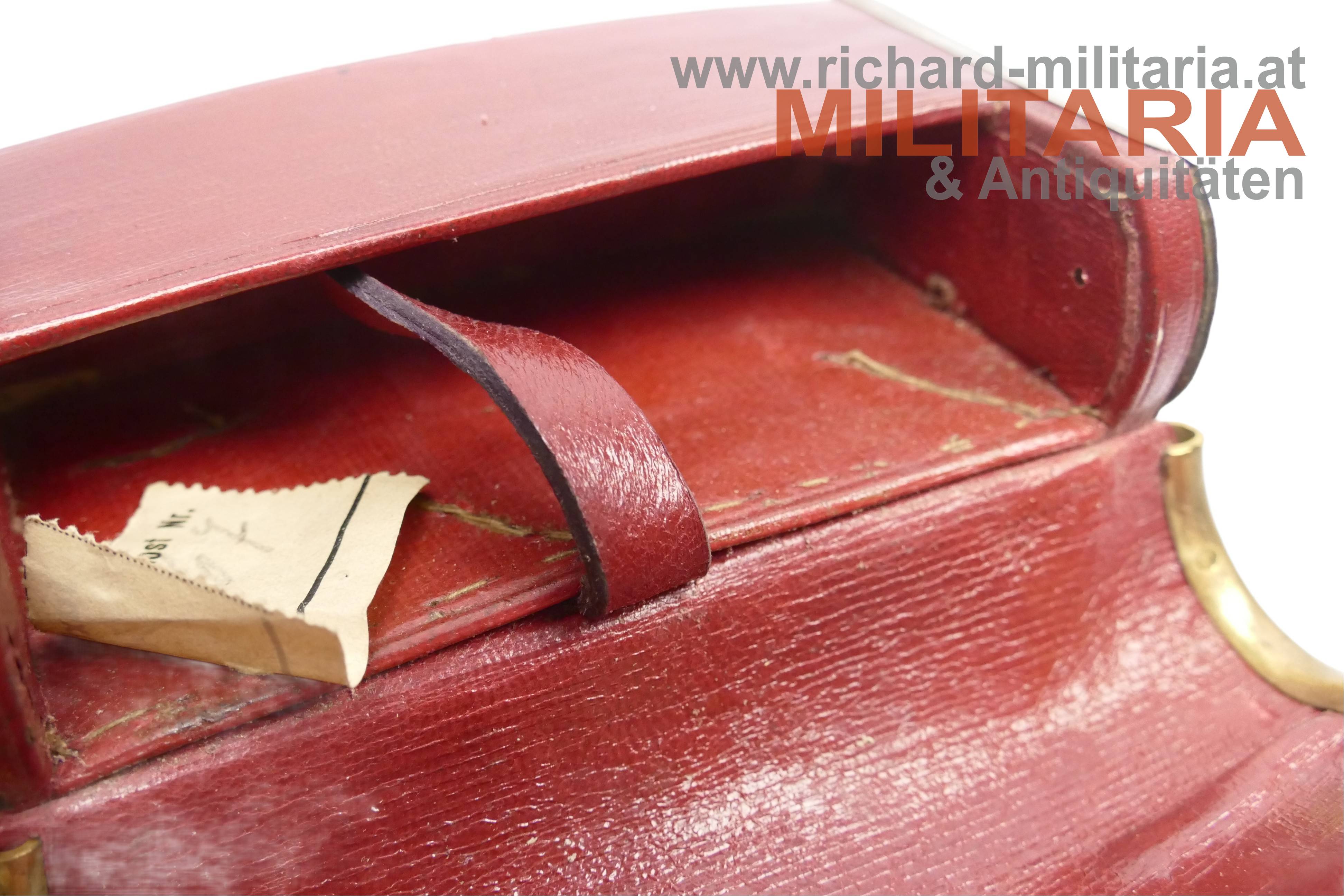 k.u.k. Kartusche für Offiziere der berittenen Truppen - SILBER; Korpus mit rotem Safianleder bezogen; seitlich silberne Beschläge mit Kriegstrophäen; Deckel aus Silber mit Dianakopfpunzierung und Herstellerpunze "HS"; aufgelegter kaiserlicher Doppeladler aus vergoldetem Tombak;
