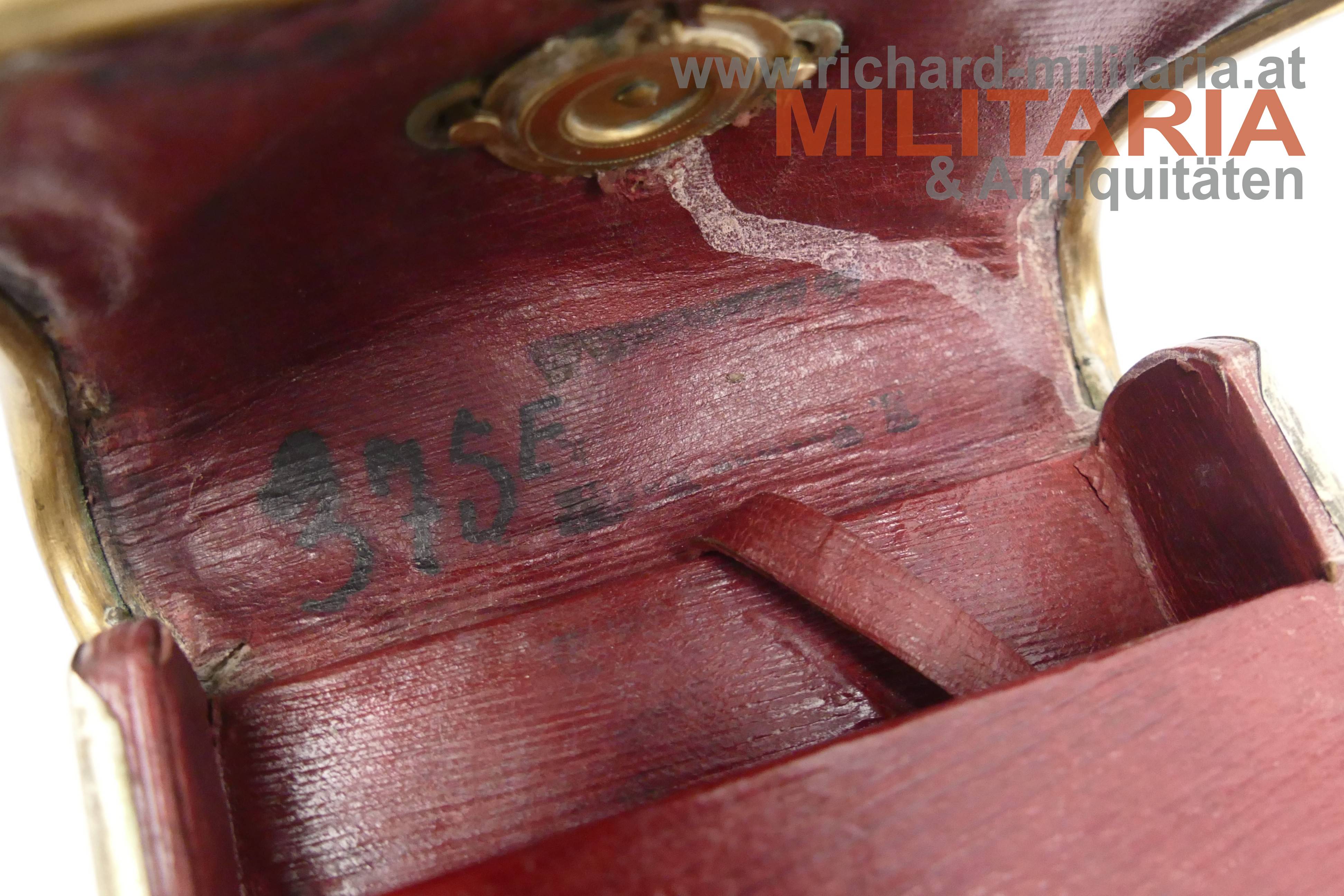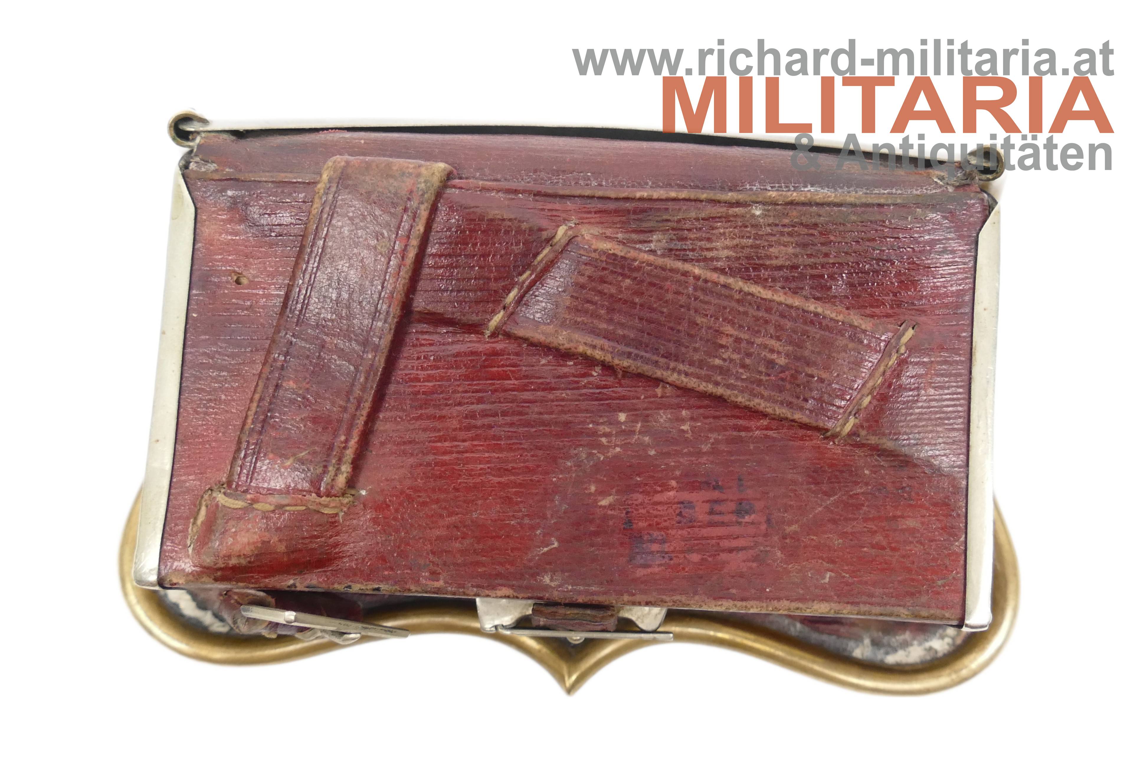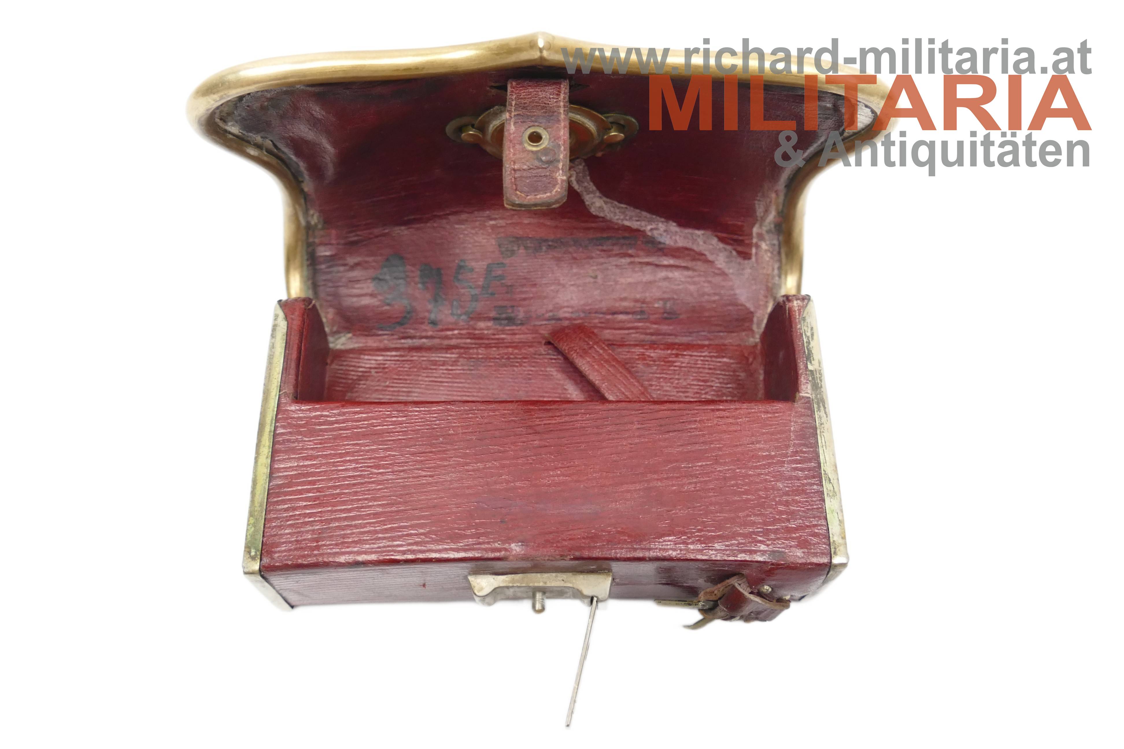 k.u.k. Kartusche für Offizier der reitenden Truppen (Kavallerie, Artillerie, Train und Gestütsbranche) - nach der Adjustierungsvorschrift 1910/11; Holzkorbus mit rotem Saffianleder bezogen; vernickelter Deckel und Seitenteile - ohne Dellen; Randeinfassung vergoldet; abnehmbarer Adler aus vergoldetem Tombak; keine Dellen oder Beschädigungen; vollständig mit Verschlussriemen und Halterungen für den Kartuschriemen; innen mit schwarzer Farbe "375F" vermerkt; schöner unverputzter Originalzustand!