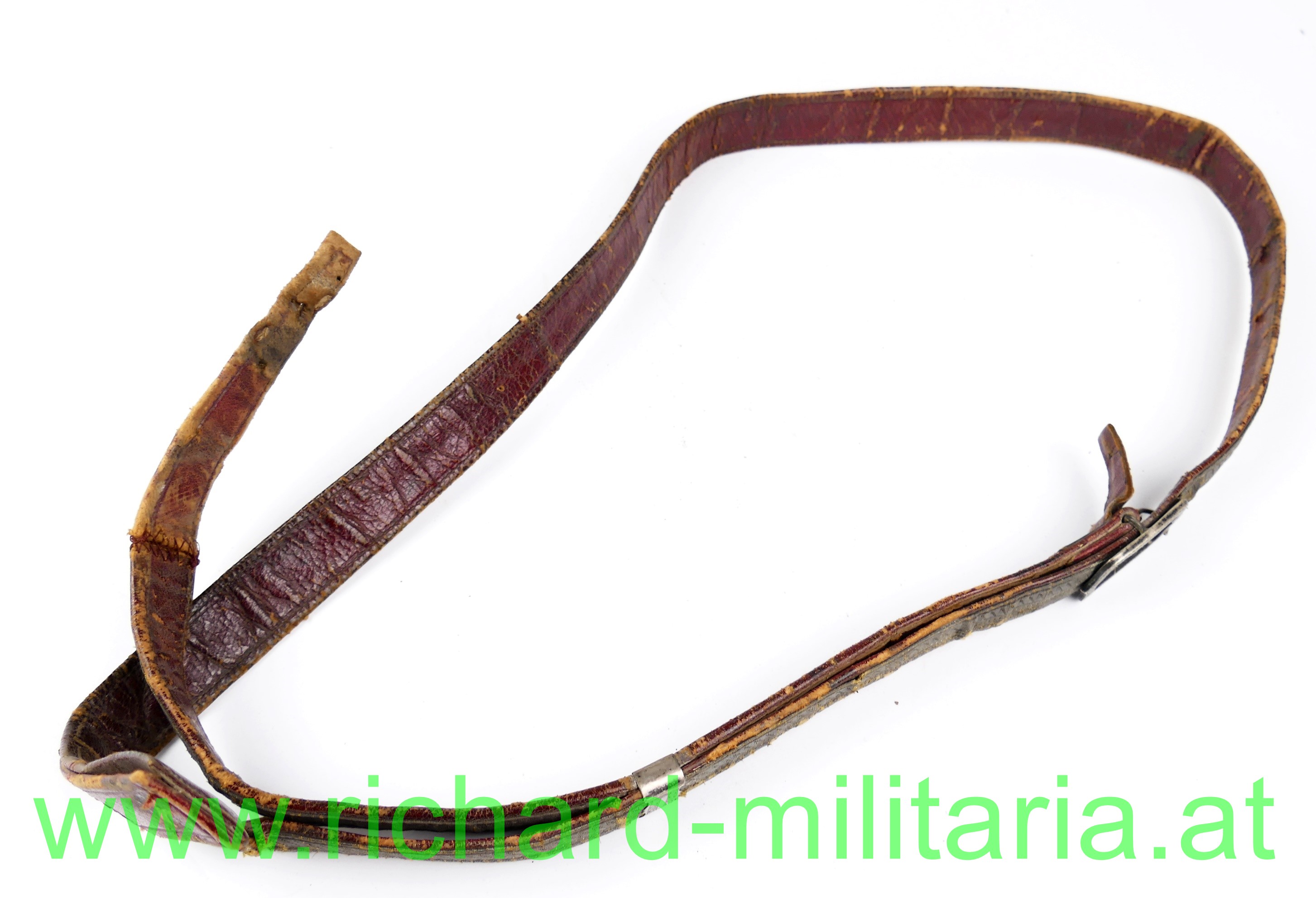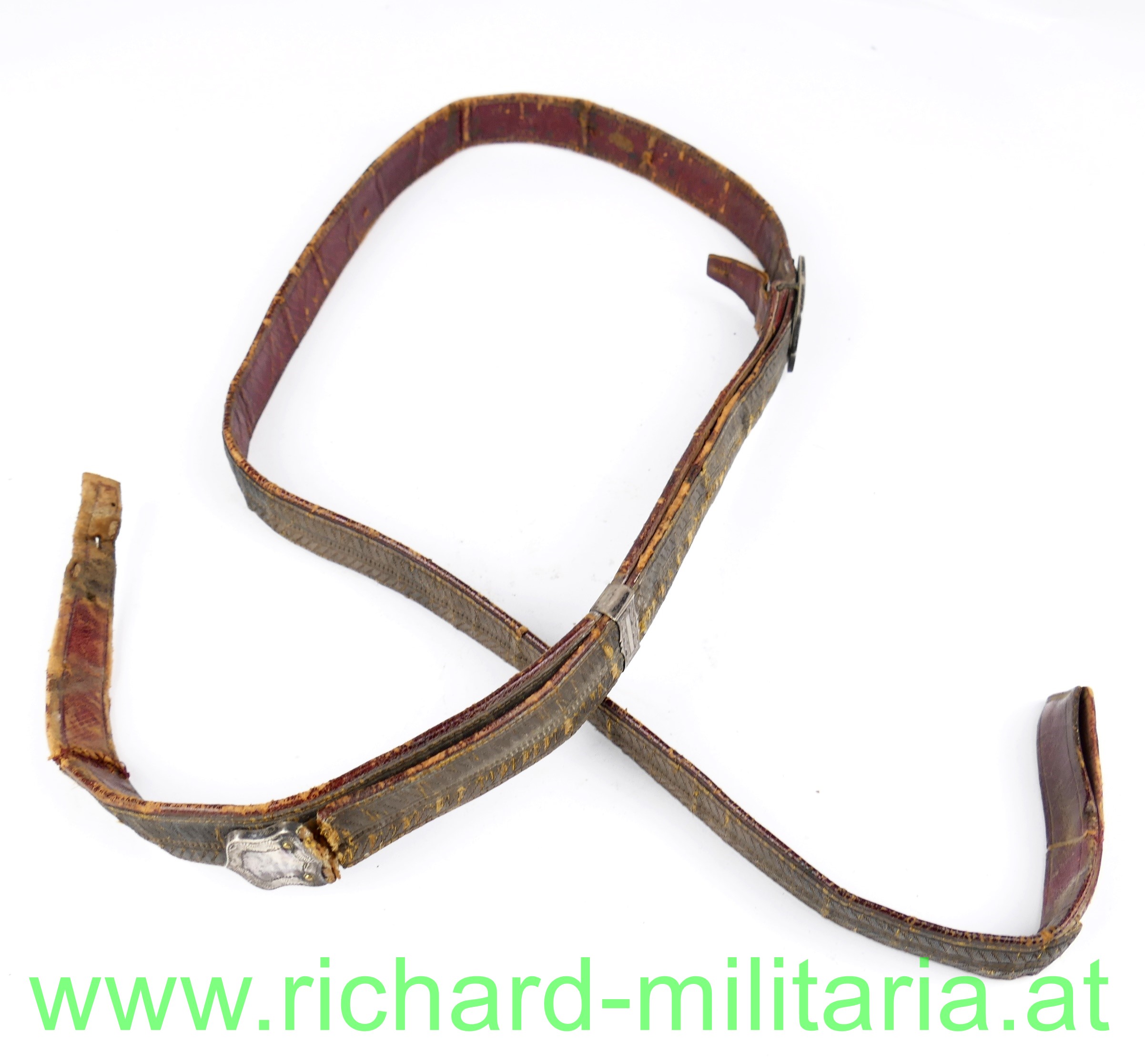 k.u.k. Kartuschenkasten Riemen - schmale frühe Form; Schulterriemen mit Silberbeschlägen - diese punziert; roter Ledergrundriemen - auf der Außenseite aufgenähte Goldborte aus Metallfaden mit schwarzem Durchzug - Vergoldung verblichen; beim Endteil ist das Leder zum silberne Abschluss gebrochen und behelfsmäßig befestigt; Lederriemen fleckig und berieben;