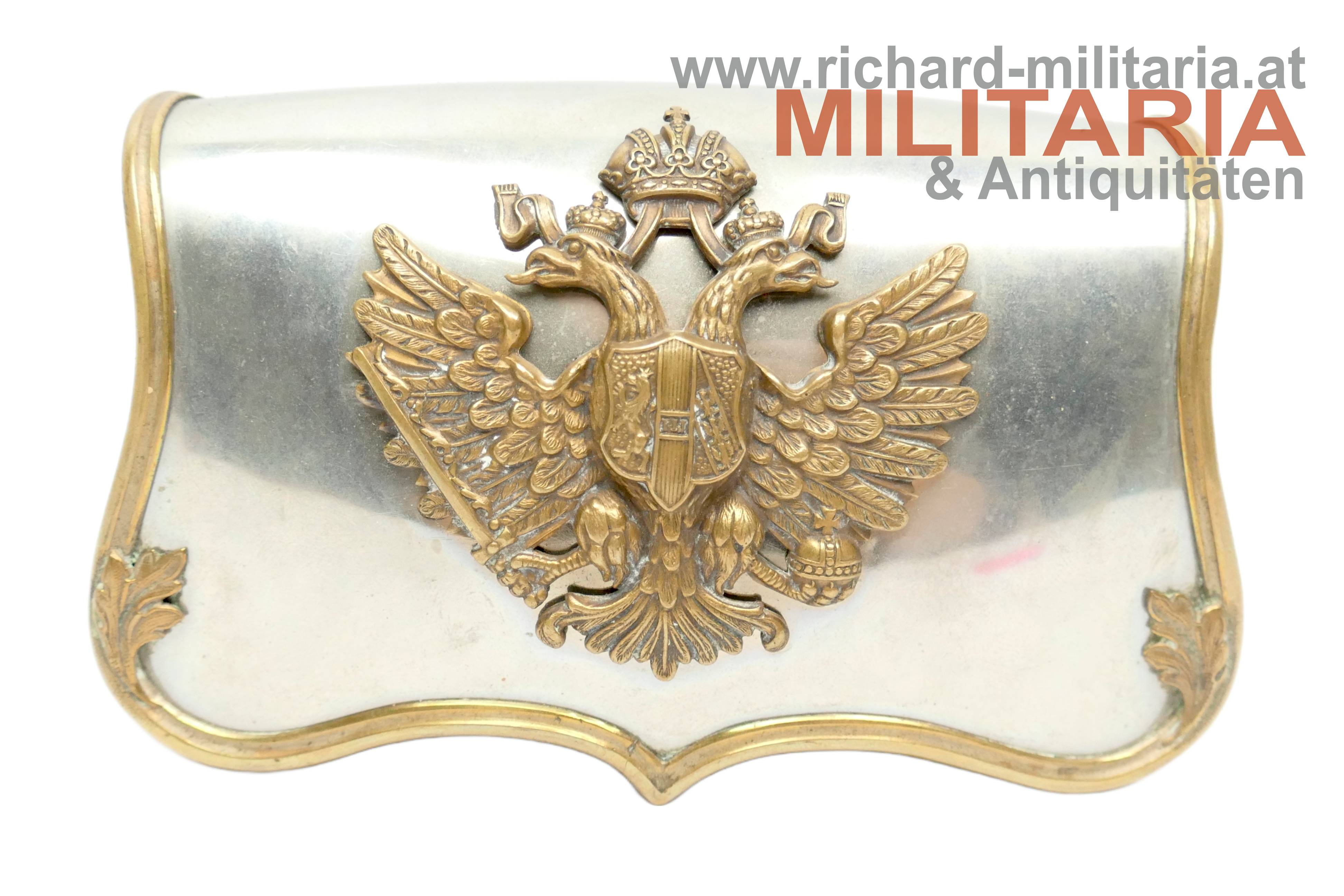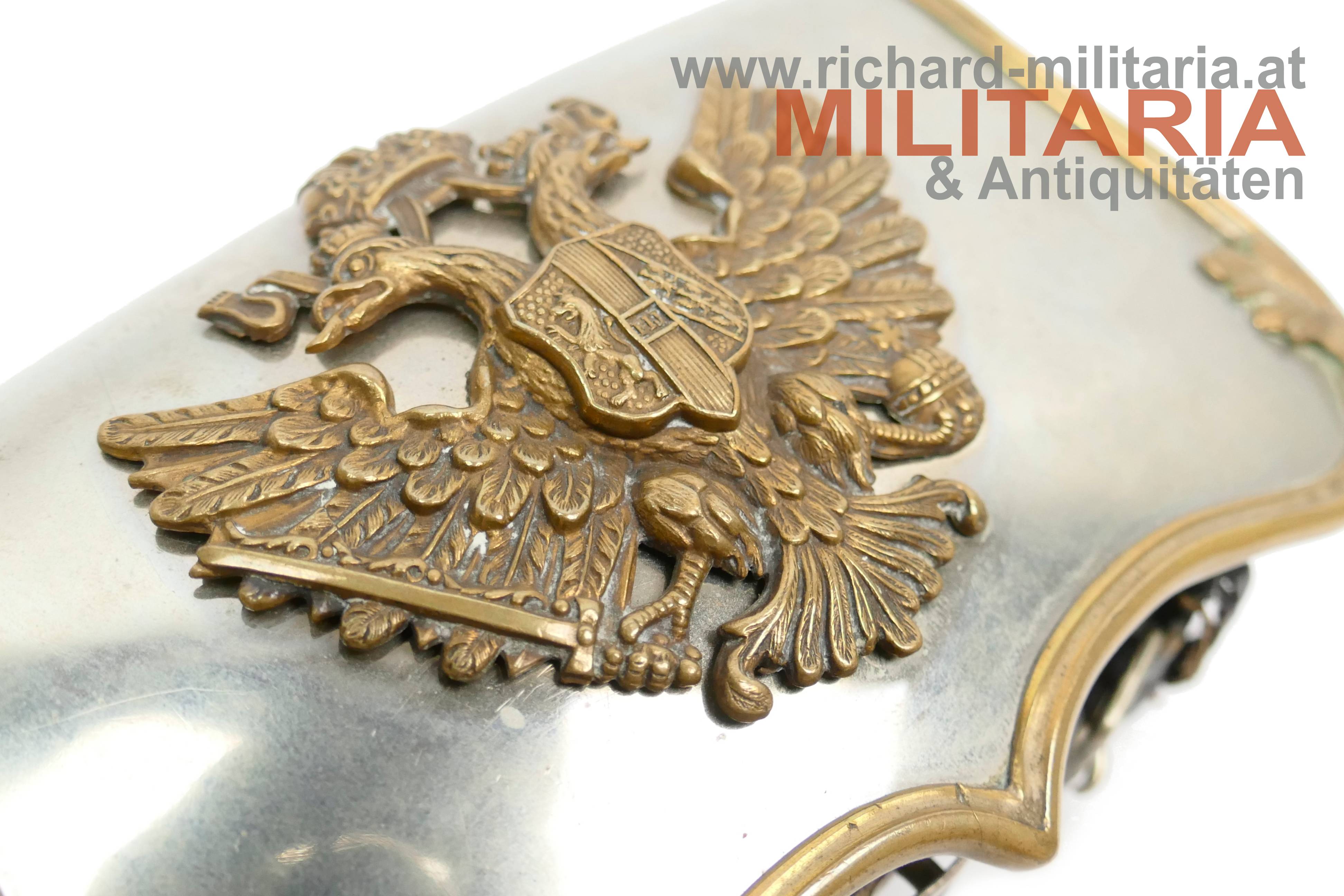 k.u.k. Kavallerie-Kartuschenkasten für Offiziere, Deckel aus Tombak vernickelt, Korpus mit schwarzem Leder überzogen; Belederung auf der Innenseite porös und teilweise abgebröselt; aufgelegter sehr plastisch und fein ausgeführter kaiserlicher Doppeladler - Fixierung mit Drehverschluss; die seitlichen Beschläge sind aus Alpaka mit Kriegstrophäen;