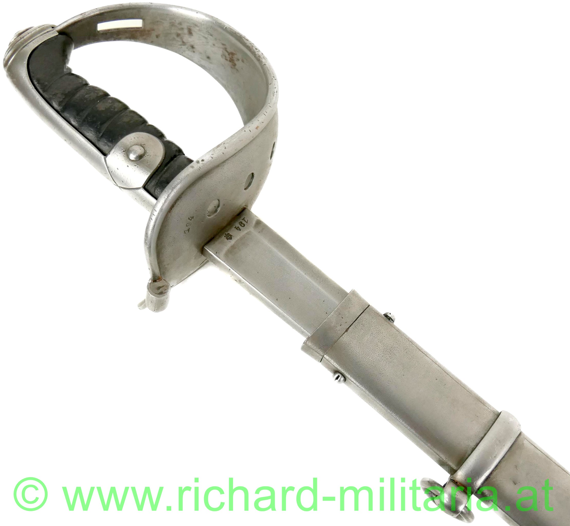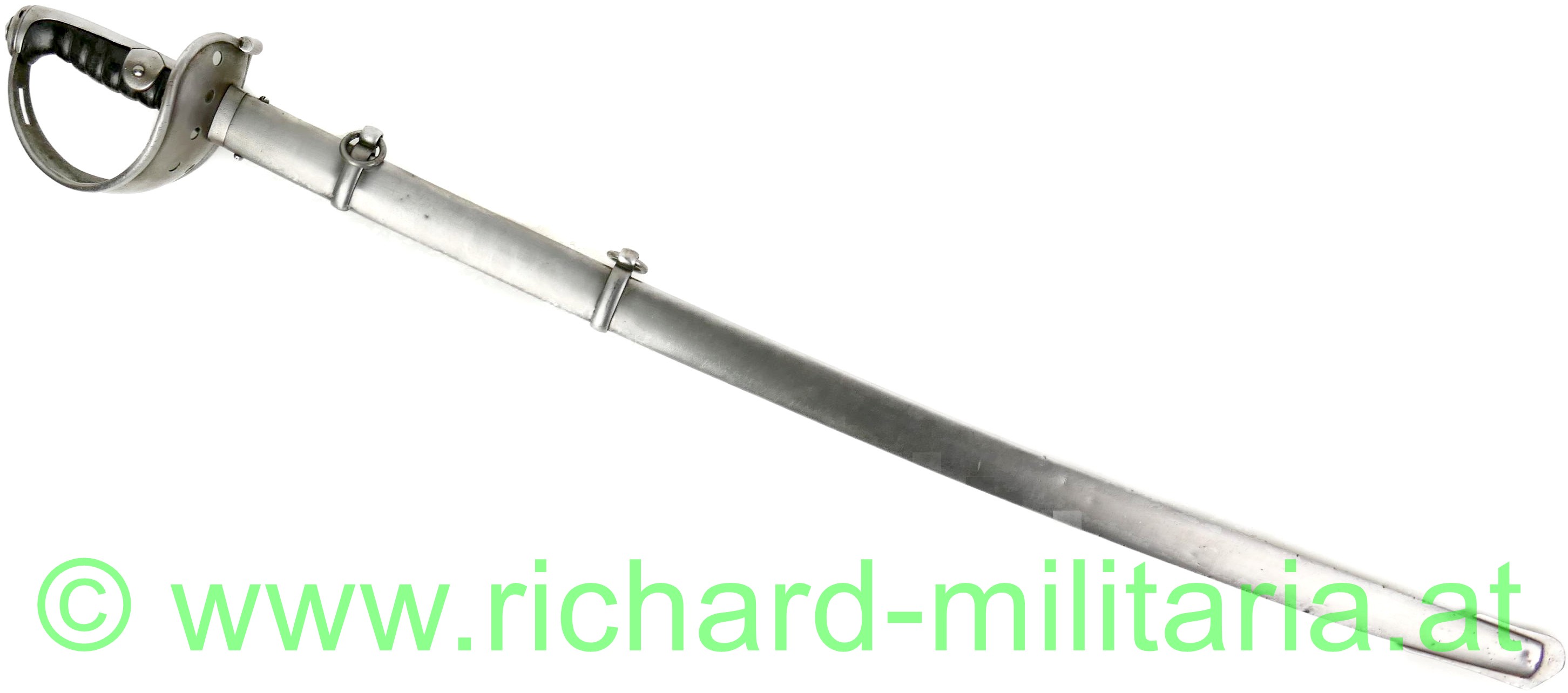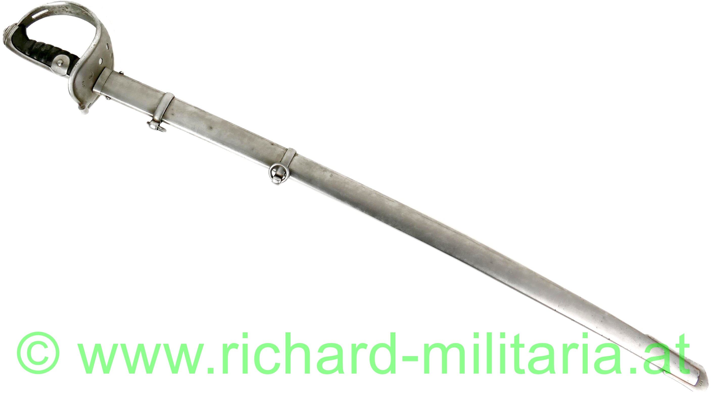 k.u.k. Kavallerie Mannschaftssäbel M1845, Klinge ist am Ansatz beidseitig gestempelt "Bleckmann, Solingen", Waffen-Nr. "194"; die Waffennummer findet sich auch am Griffkorb und am Schleifeisen (!), Griffkorb mit 7 Bohrungen, Klinge minimal fleckig komplett gereinigt, Klingenbreite: "33,8 mm", Griff mit Leder überzogen und wie für Mannschaften vorgeschrieben ohne Drahtwicklung - Leder des Griffes minimal aufgeraut; Scheide ebenfalls gereinigt - minimale Dellen an der Kante durch Säbelhiebe - 2 bewegliche Trageringe;