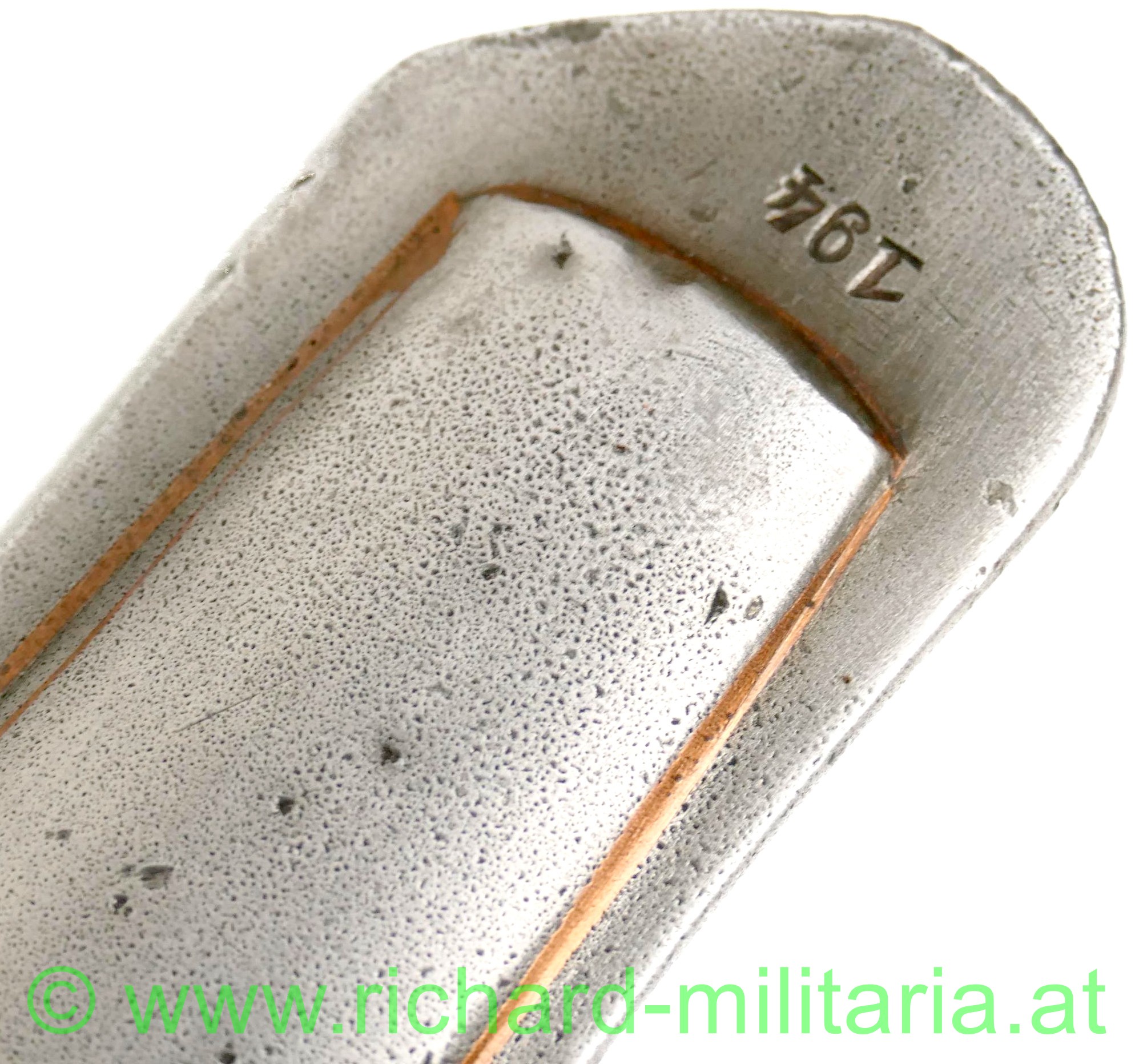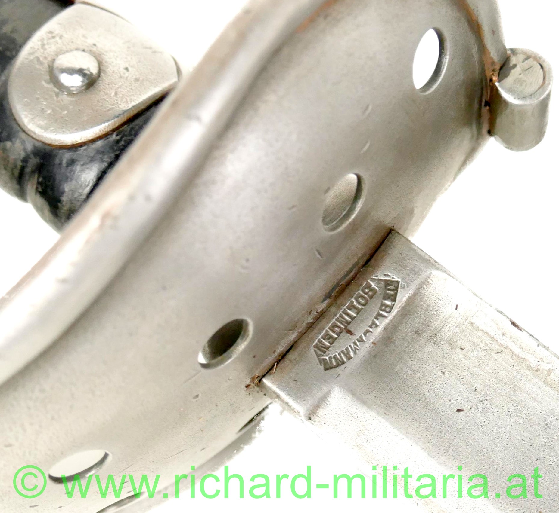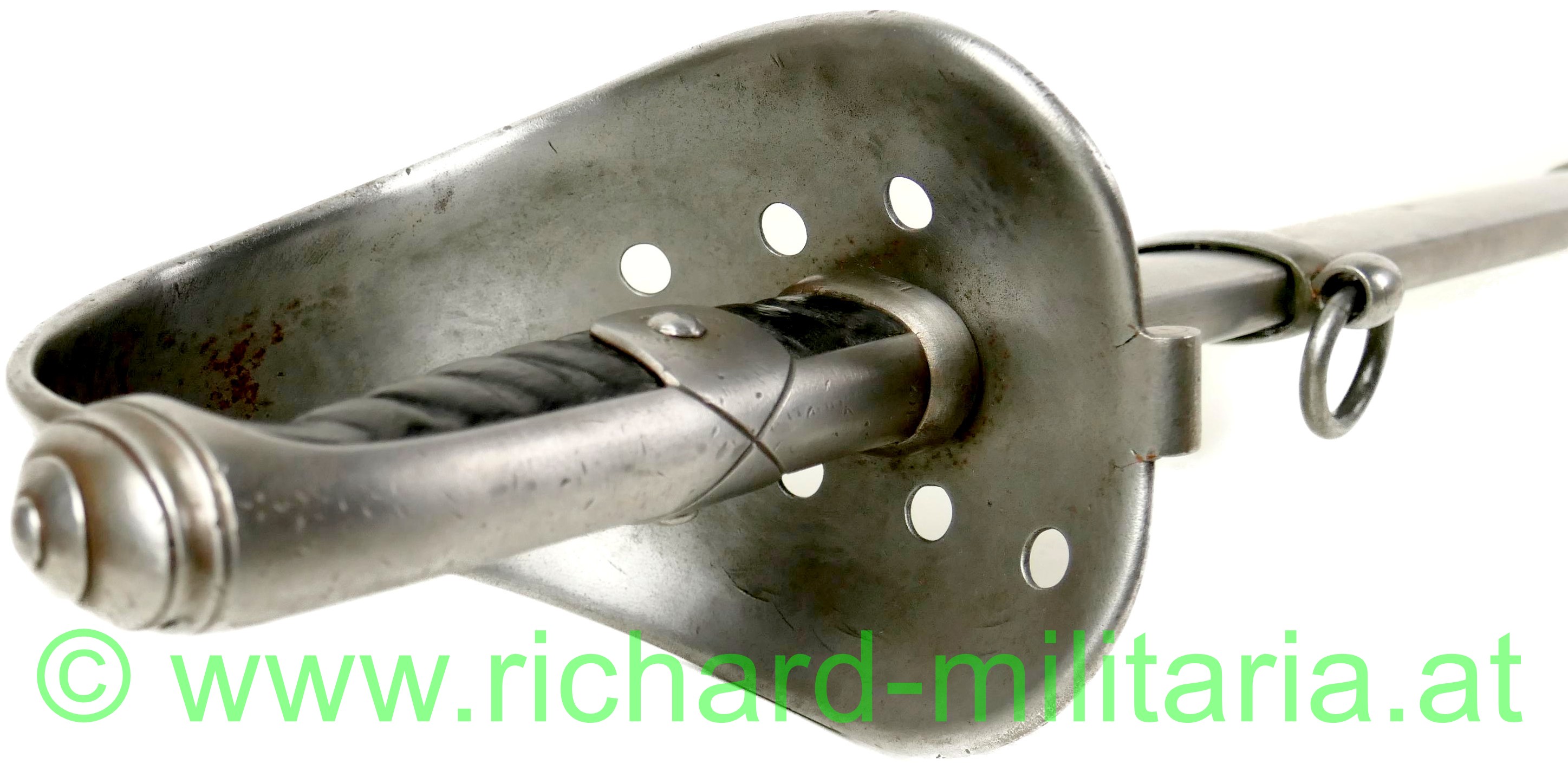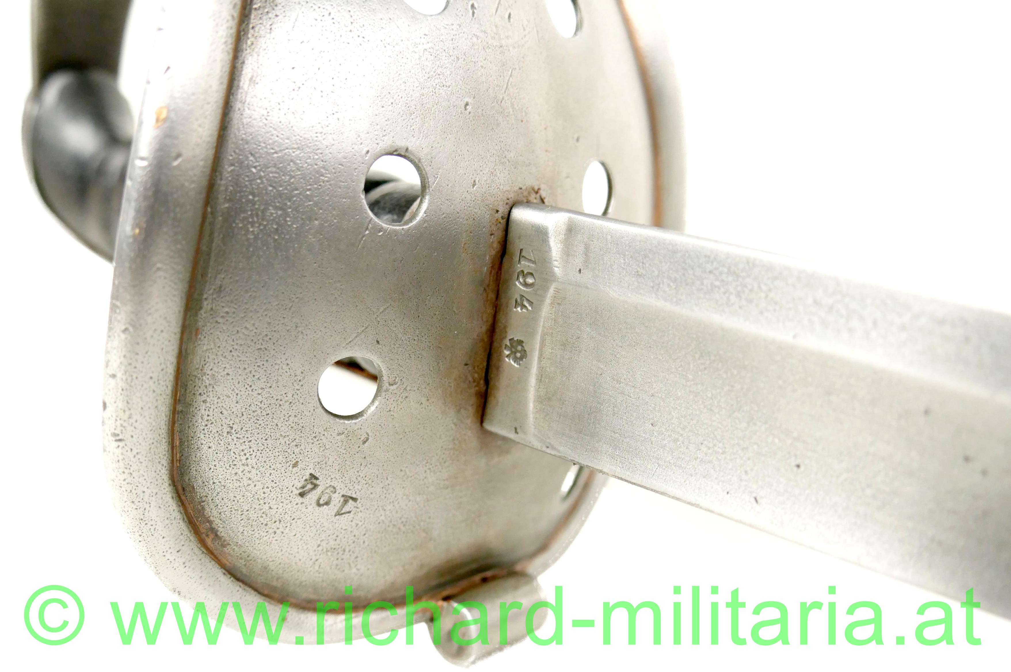 k.u.k. Kavallerie Mannschaftssäbel M1845, Klinge ist am Ansatz beidseitig gestempelt "Bleckmann, Solingen", Waffen-Nr. "194"; die Waffennummer findet sich auch am Griffkorb und am Schleifeisen (!), Griffkorb mit 7 Bohrungen, Klinge minimal fleckig komplett gereinigt, Klingenbreite: "33,8 mm", Griff mit Leder überzogen und wie für Mannschaften vorgeschrieben ohne Drahtwicklung - Leder des Griffes minimal aufgeraut; Scheide ebenfalls gereinigt - minimale Dellen an der Kante durch Säbelhiebe - 2 bewegliche Trageringe;