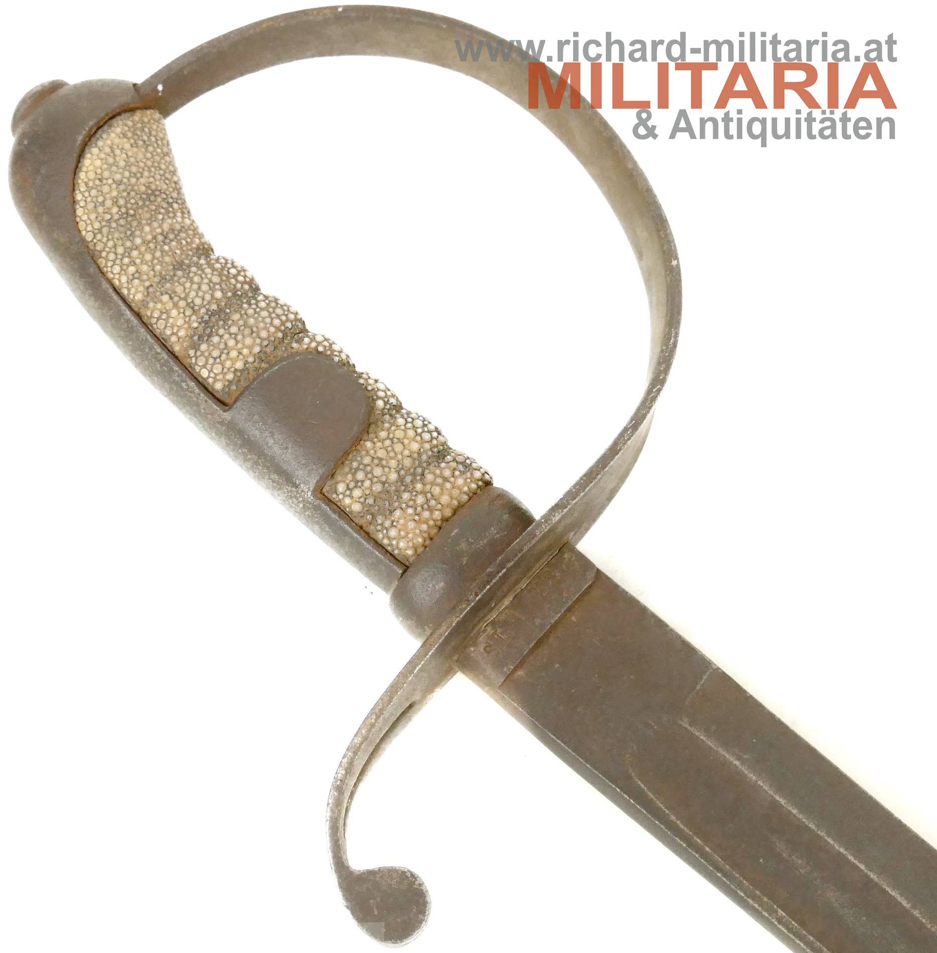 k.u.k. Kavallerie-Mannschaftssäbel M1877 leichte Gattung; k.u.k. Armeeabnahme und Hersteller auf der Klinge "Wn - Doppeladler - 15"; Hersteller: "Zeitler, Wien"; Griff mit Rochenhaut überzogen; schmaler Korb mit einem Portepeeschlitz; leicht gebogene beidseitig gekehlte Klinge, auf der Klingenangel gestempelt: "S.L.A.B. 22" Säbel ist durchgehend rostig; Klinge geschärft mit kleineren Scharten; Scheide fehlt;